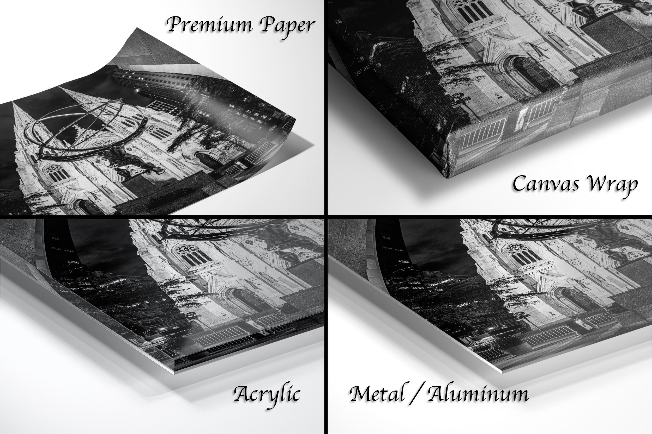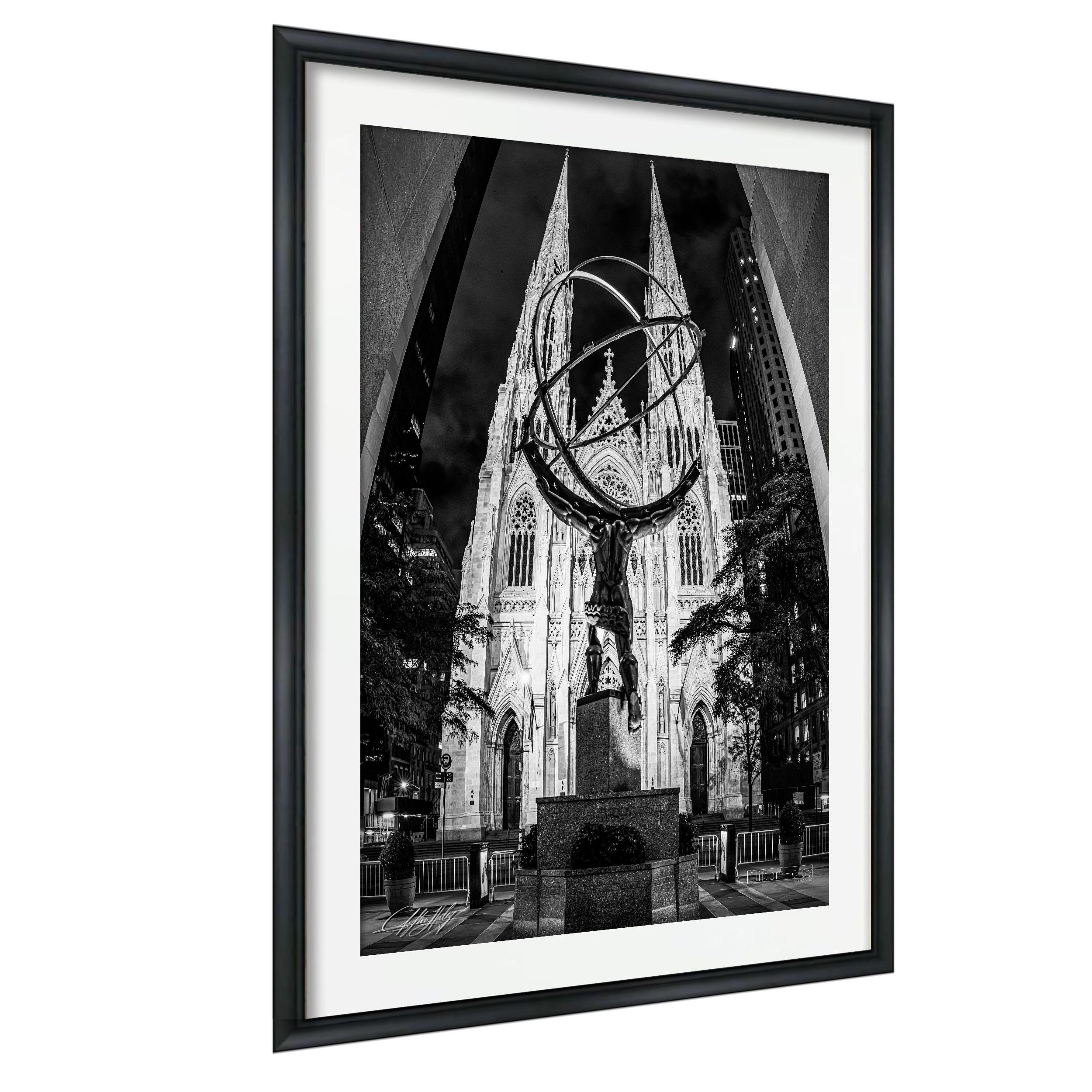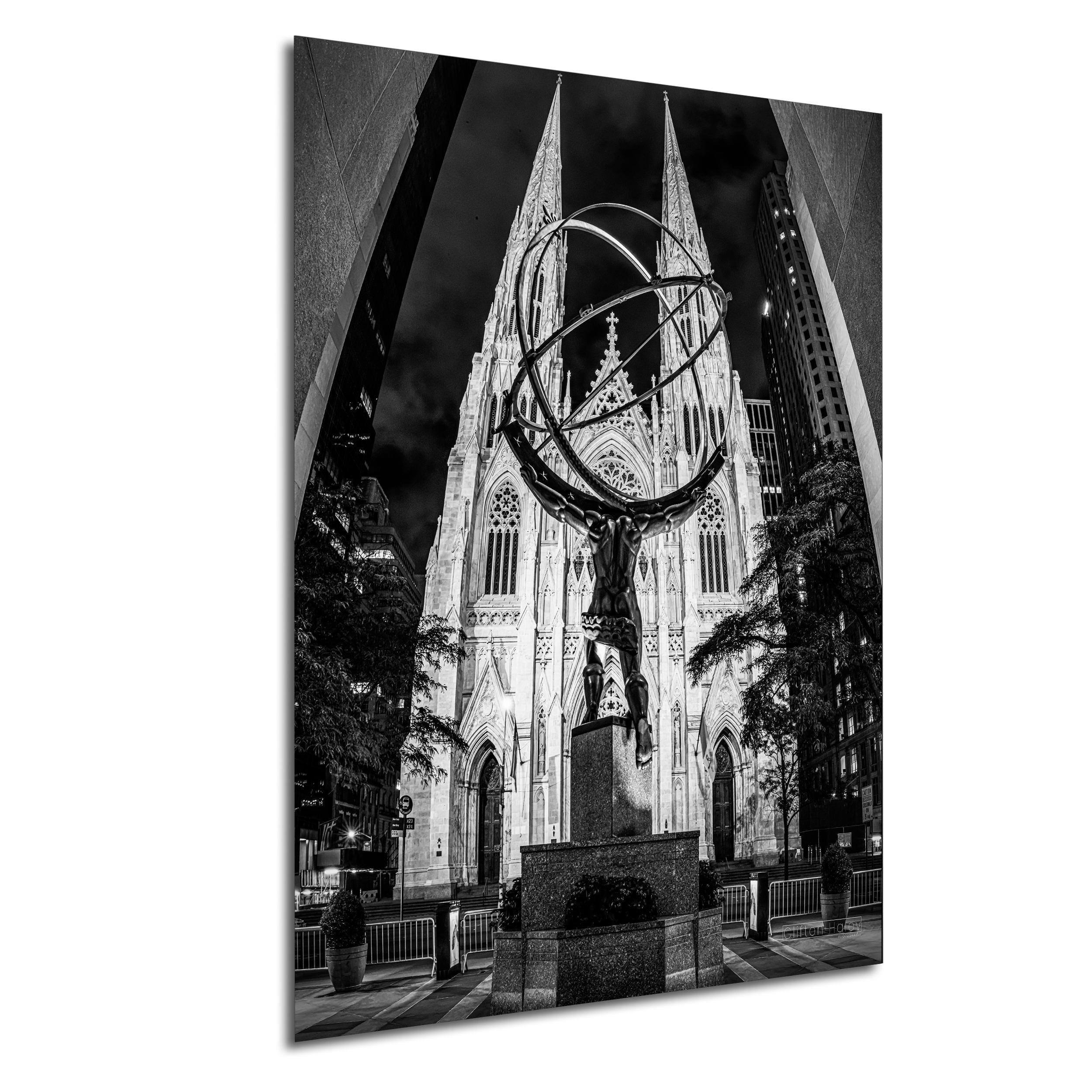 Atlas St Patrick metal print captures the iconic NYC urban landscape with striking black and white photography. This fine art signed piece beautifully showcases the gothic cathedral and the powerful Atlas statue, making it a timeless addition to your wall decor.