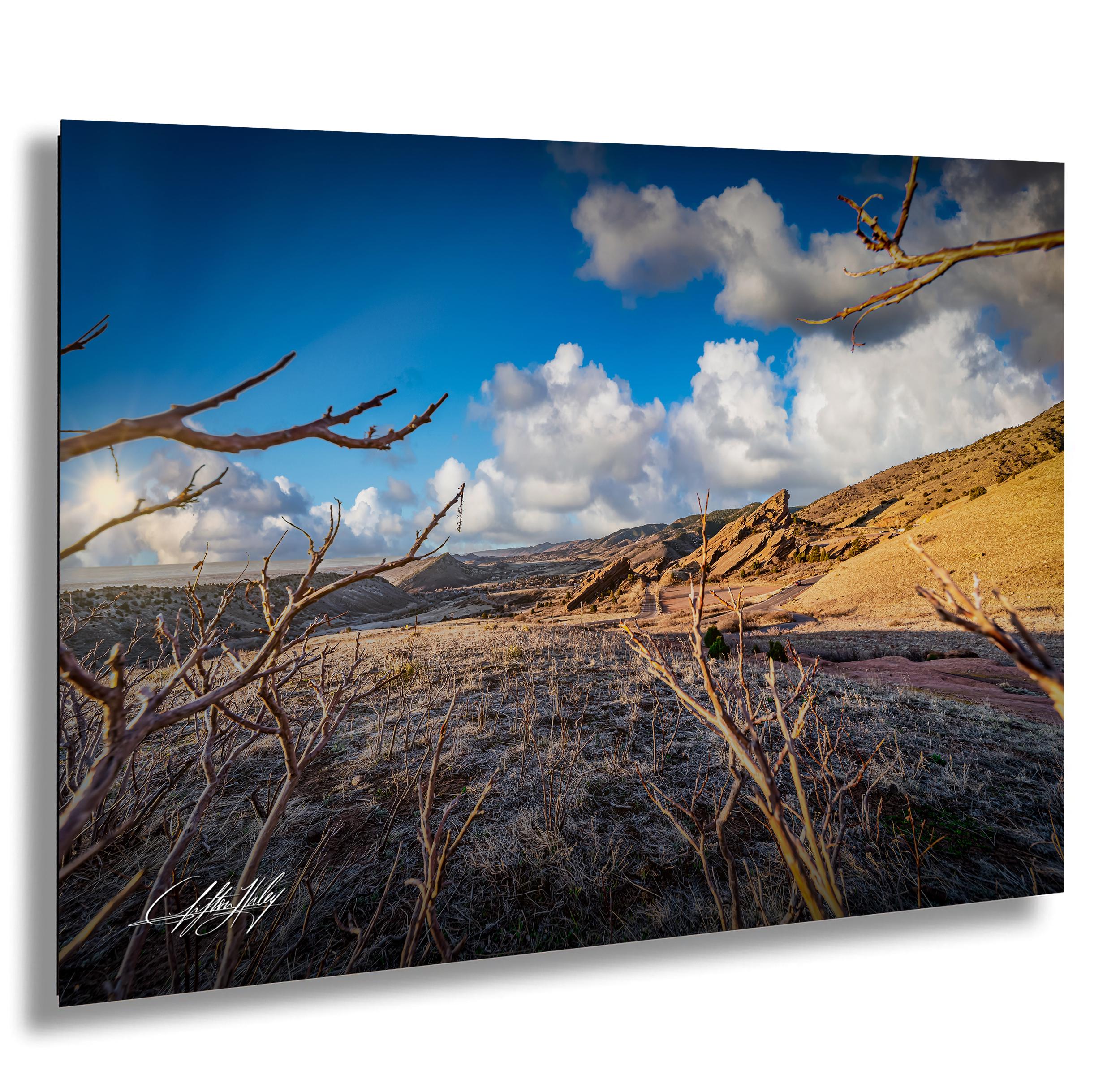 Red Rocks Amphitheater print captures the breathtaking beauty of Colorado's iconic red sandstone cliffs bathed in golden morning light. This unique landscape art brings the warmth of sunrise photography and the spirit of this legendary concert venue into your home or travel decor.