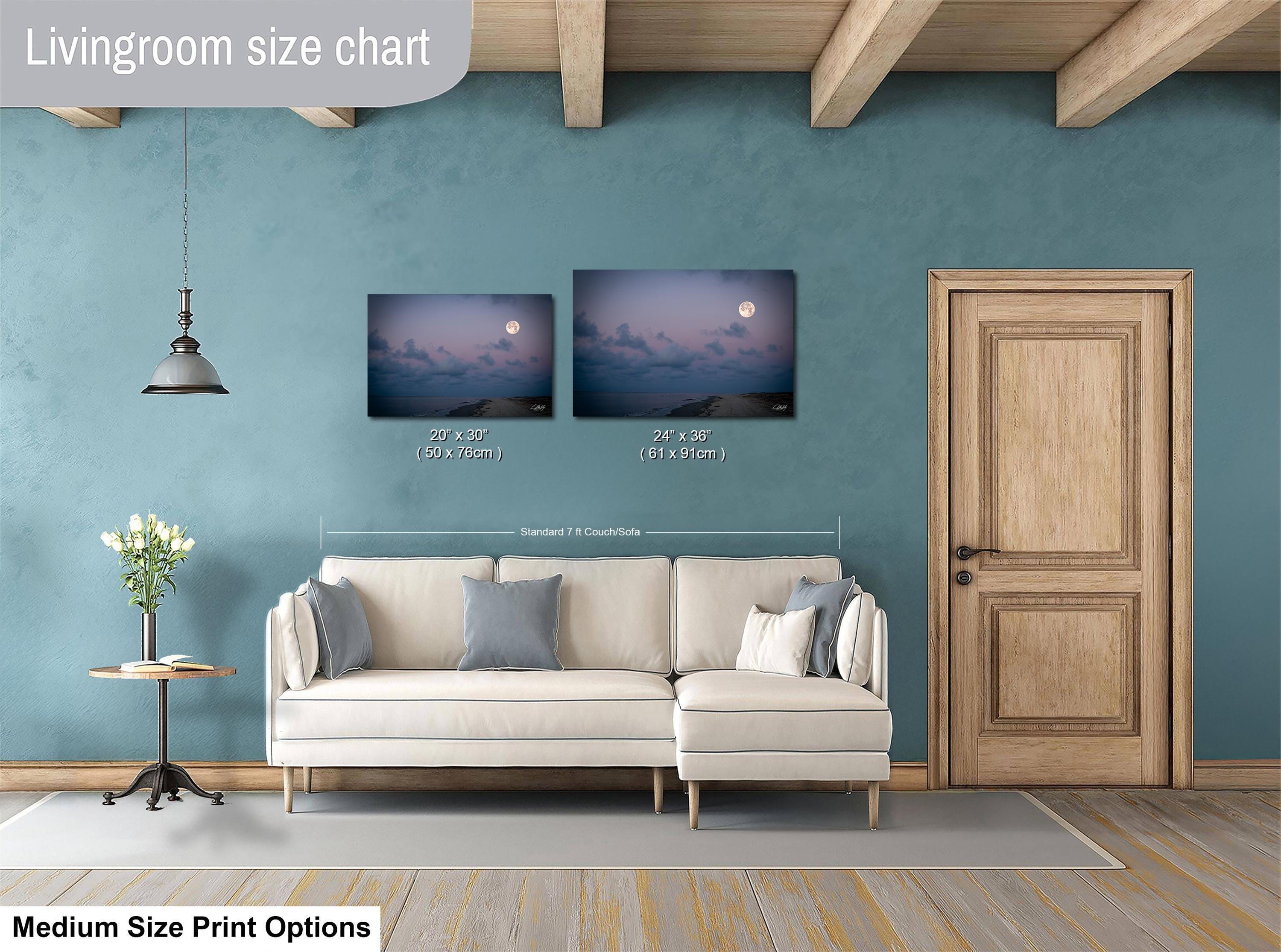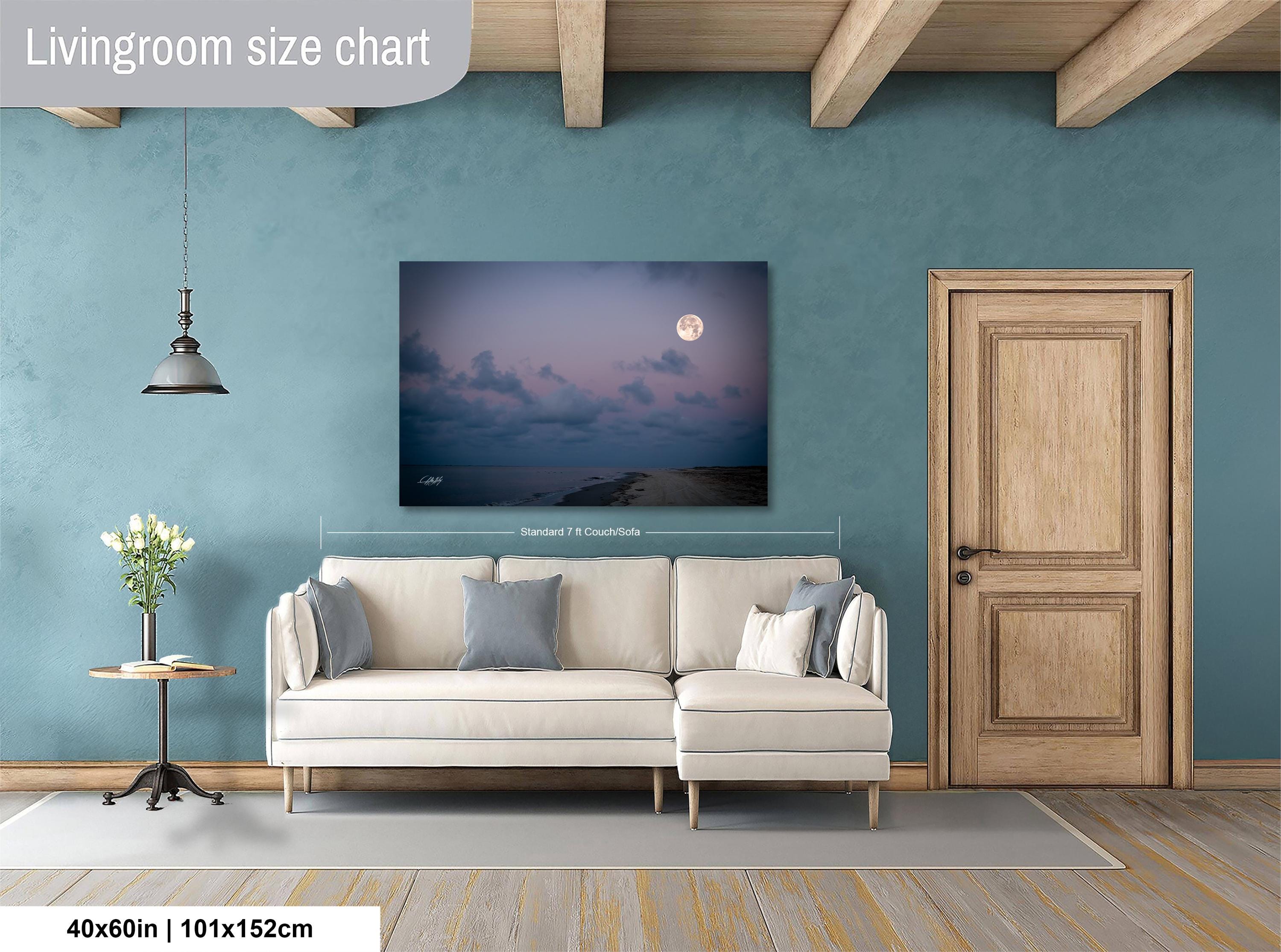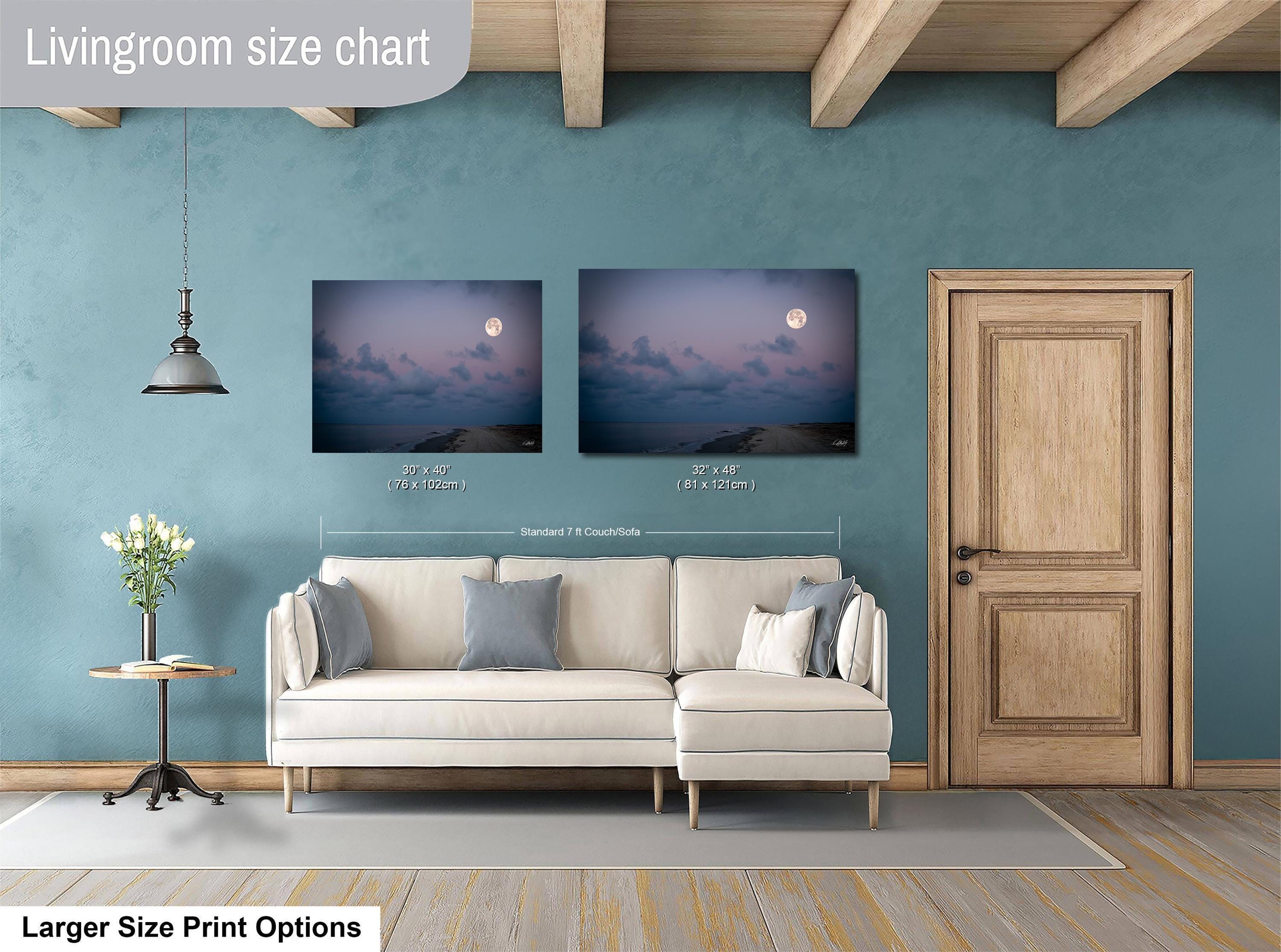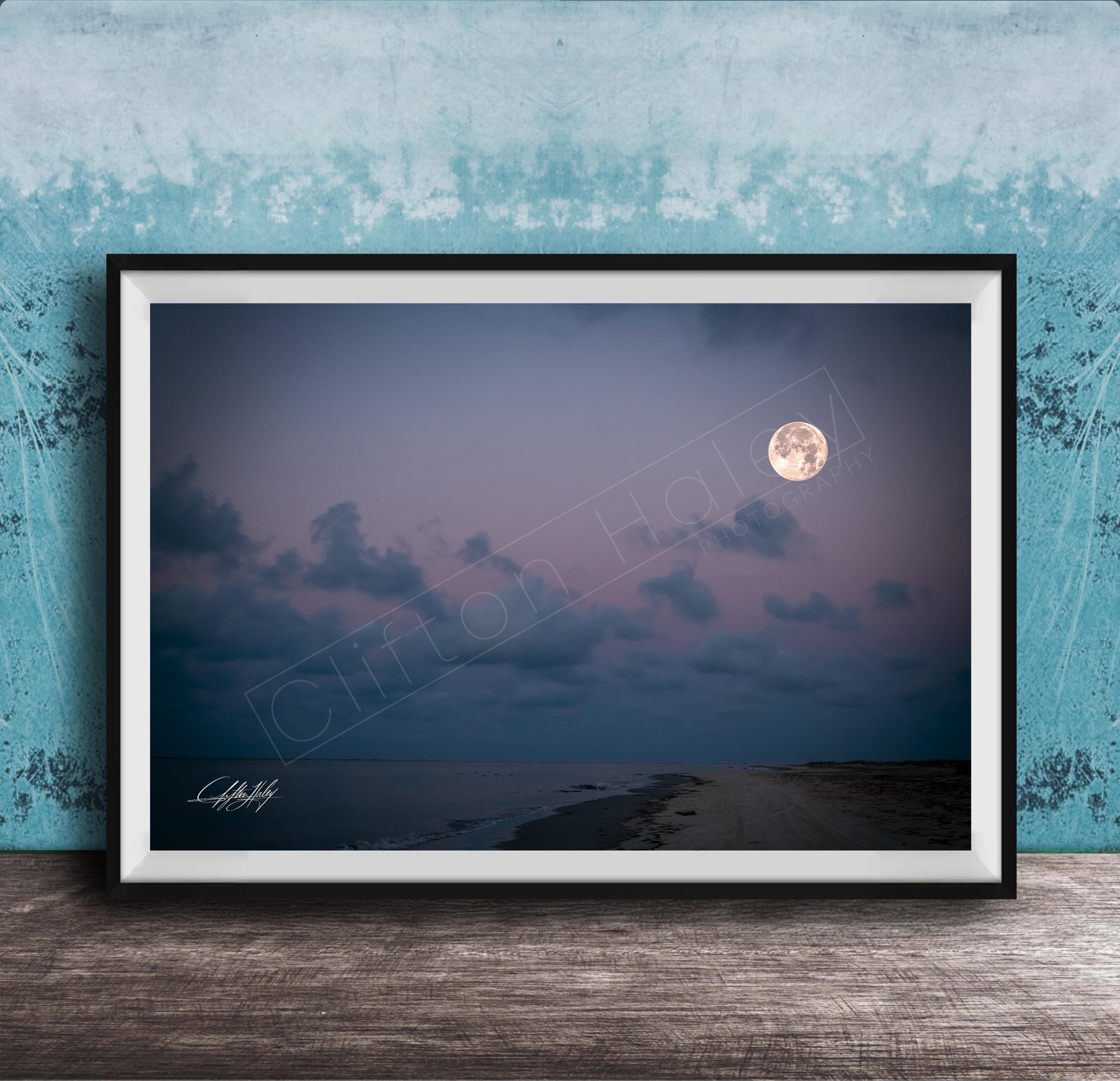 Moon Over Shoreline reveals a tranquil coastal beach scene bathed in the gentle glow of the moon during blue hour. This serene nature decor print brings the calm ocean horizon into your home, creating a peaceful retreat with its fine art wall decor charm.