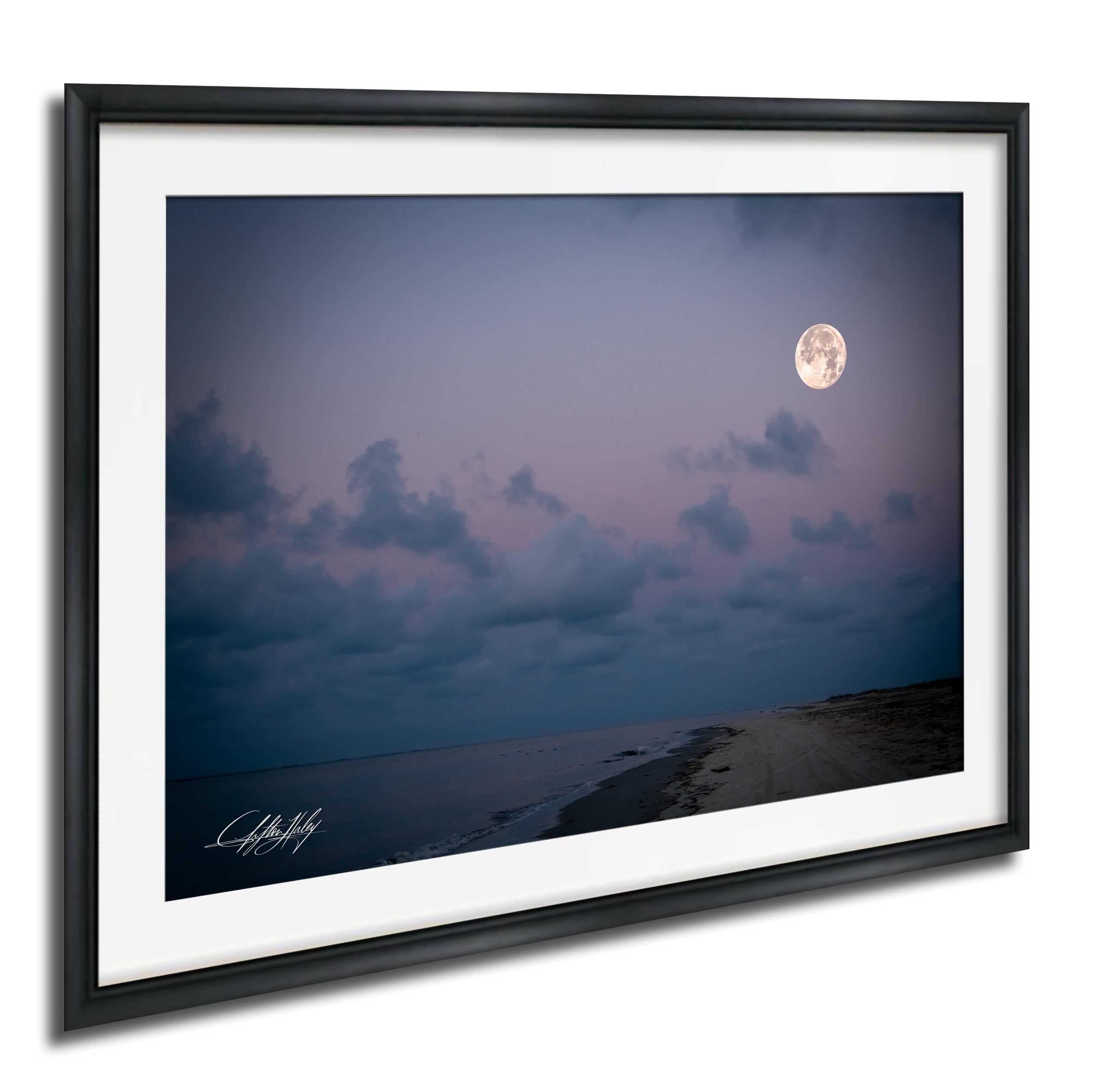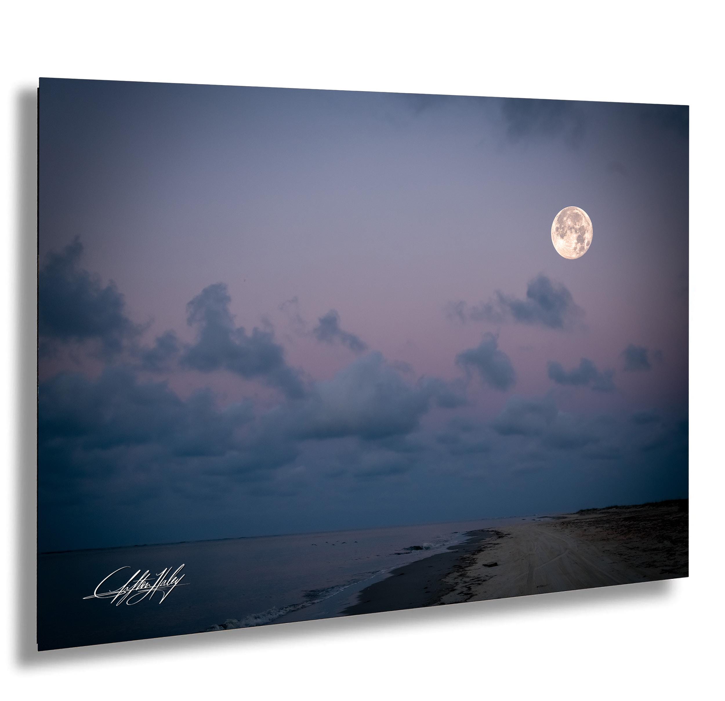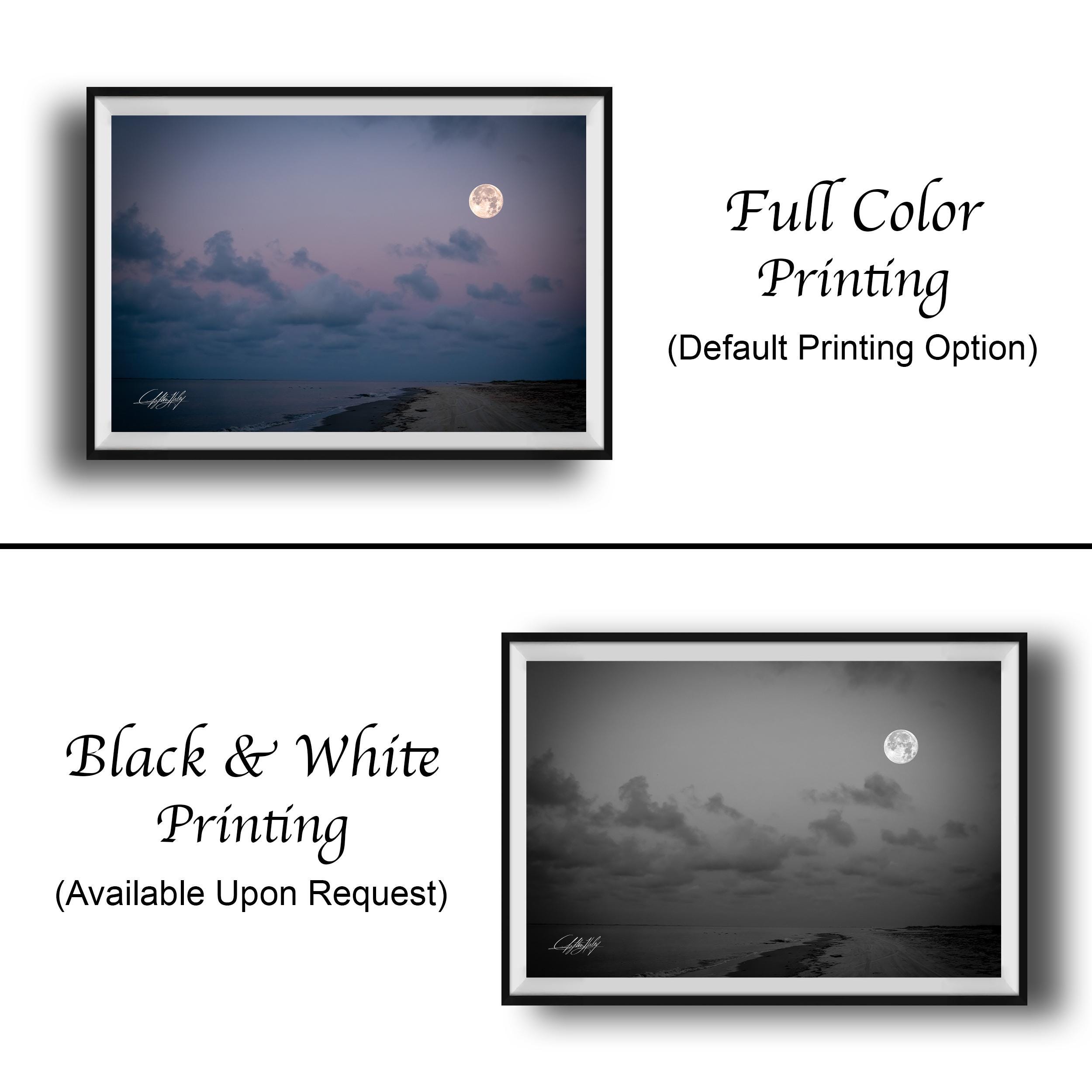 Moon Over Shoreline reveals a tranquil coastal beach scene bathed in the gentle glow of the moon during blue hour. This serene nature decor print brings the calm ocean horizon into your home, creating a peaceful retreat with its fine art wall decor charm.