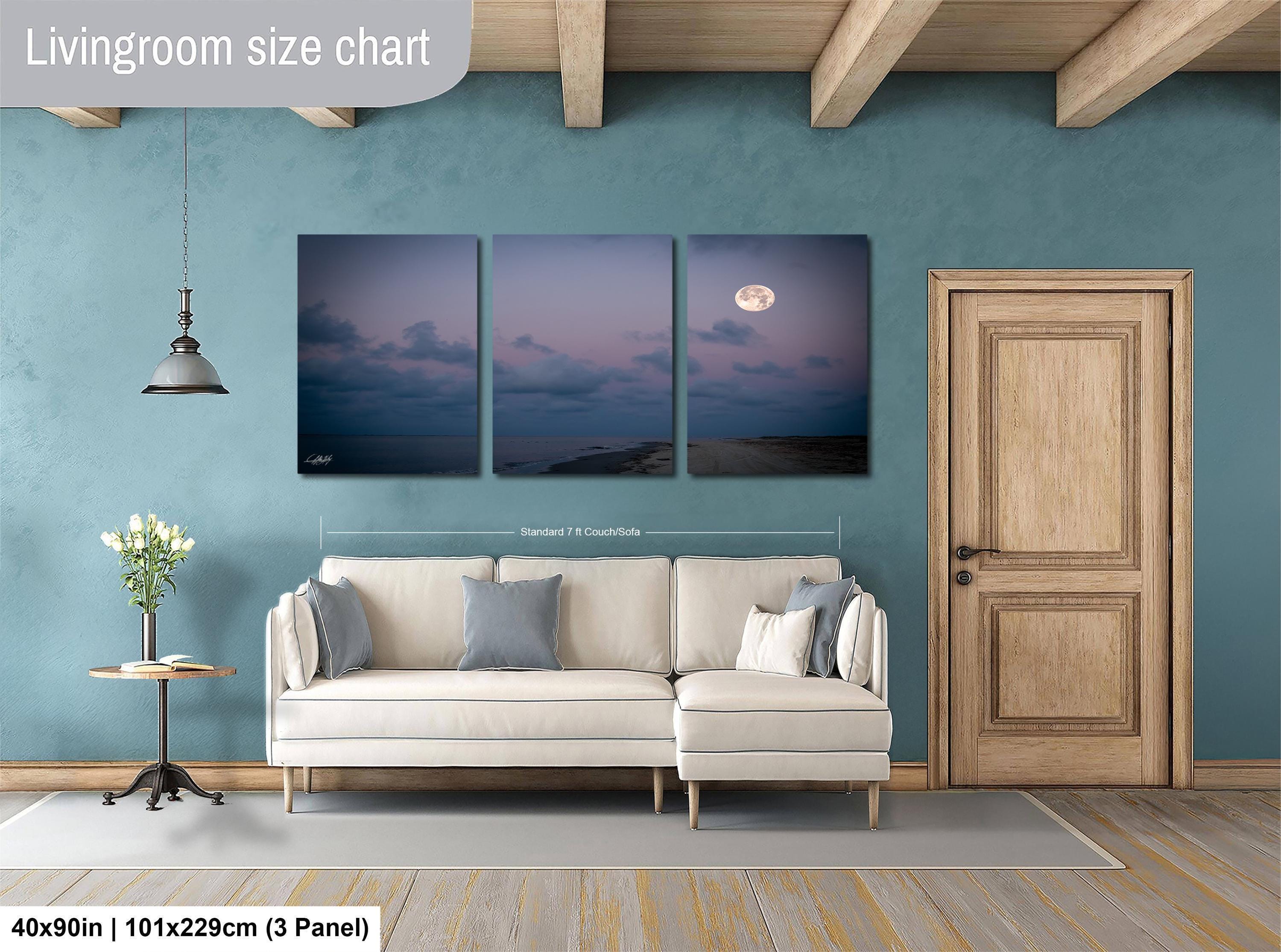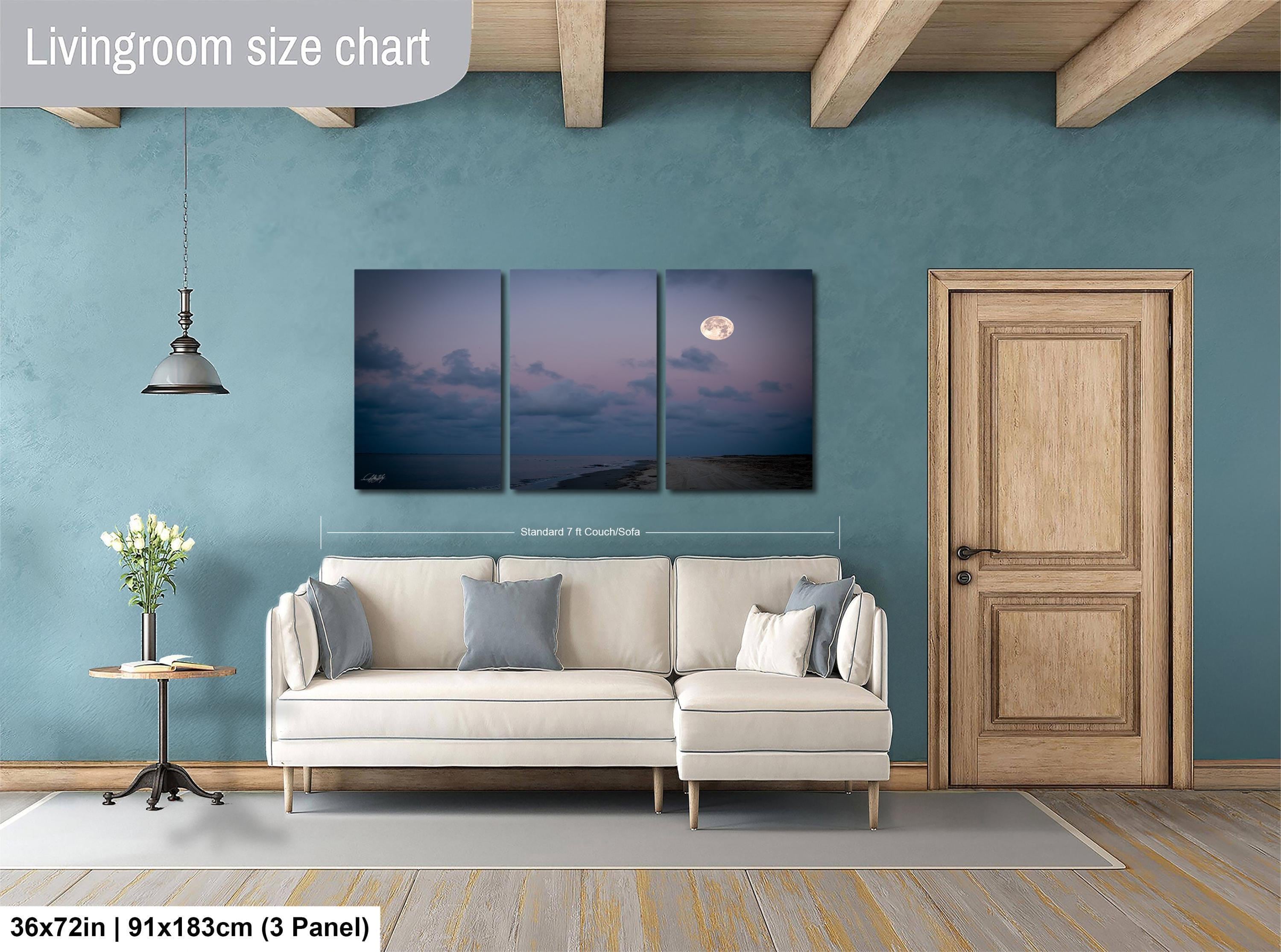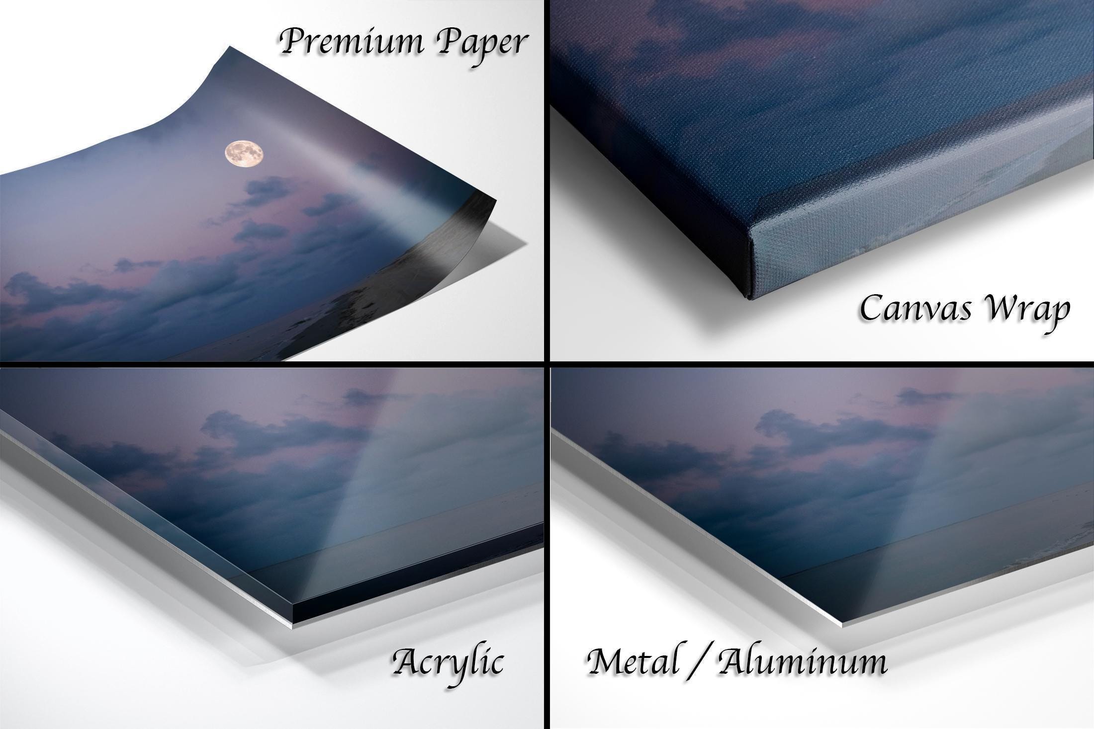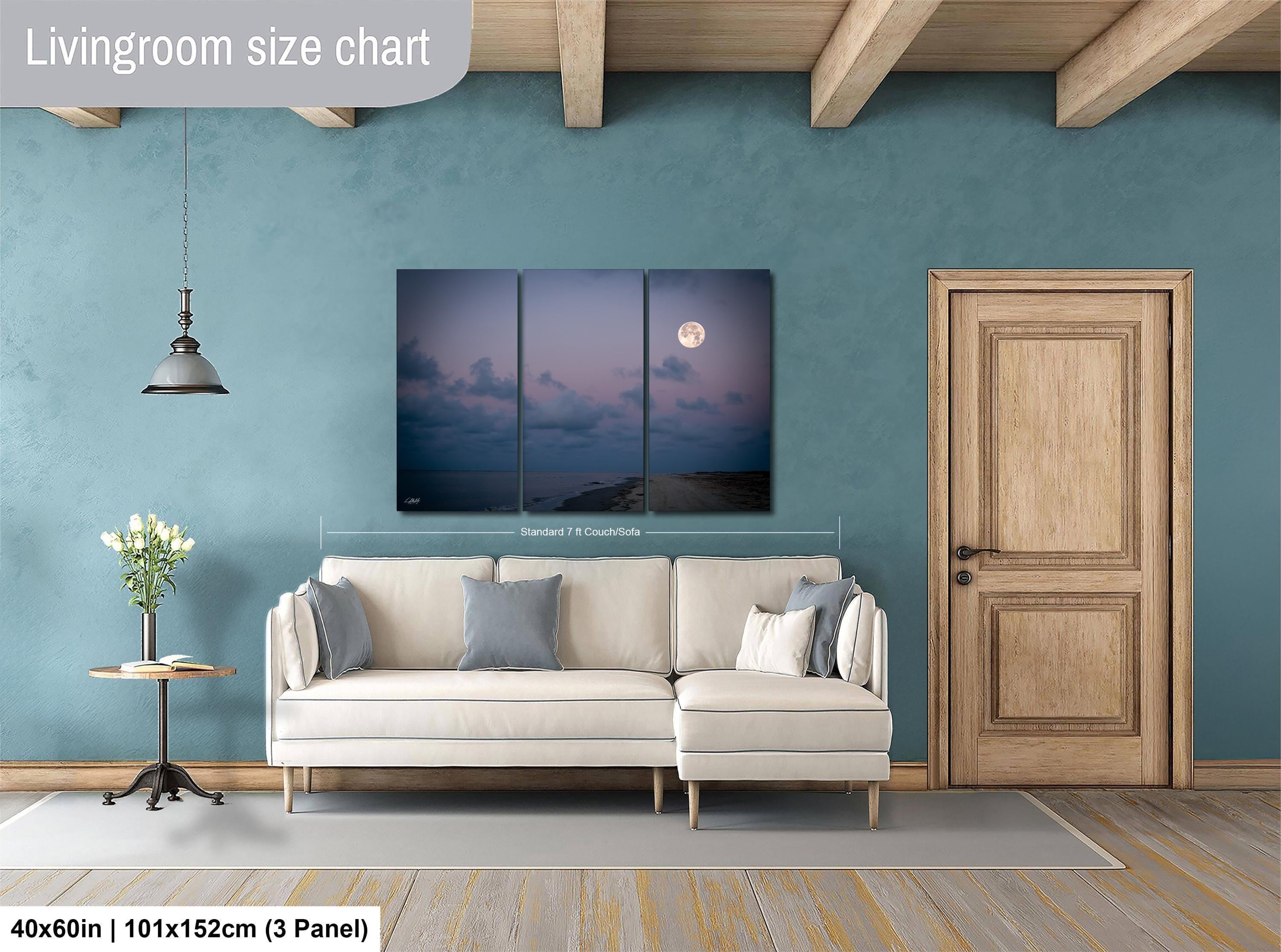 Moon Over Shoreline reveals a tranquil coastal beach scene bathed in the gentle glow of the moon during blue hour. This serene nature decor print brings the calm ocean horizon into your home, creating a peaceful retreat with its fine art wall decor charm.