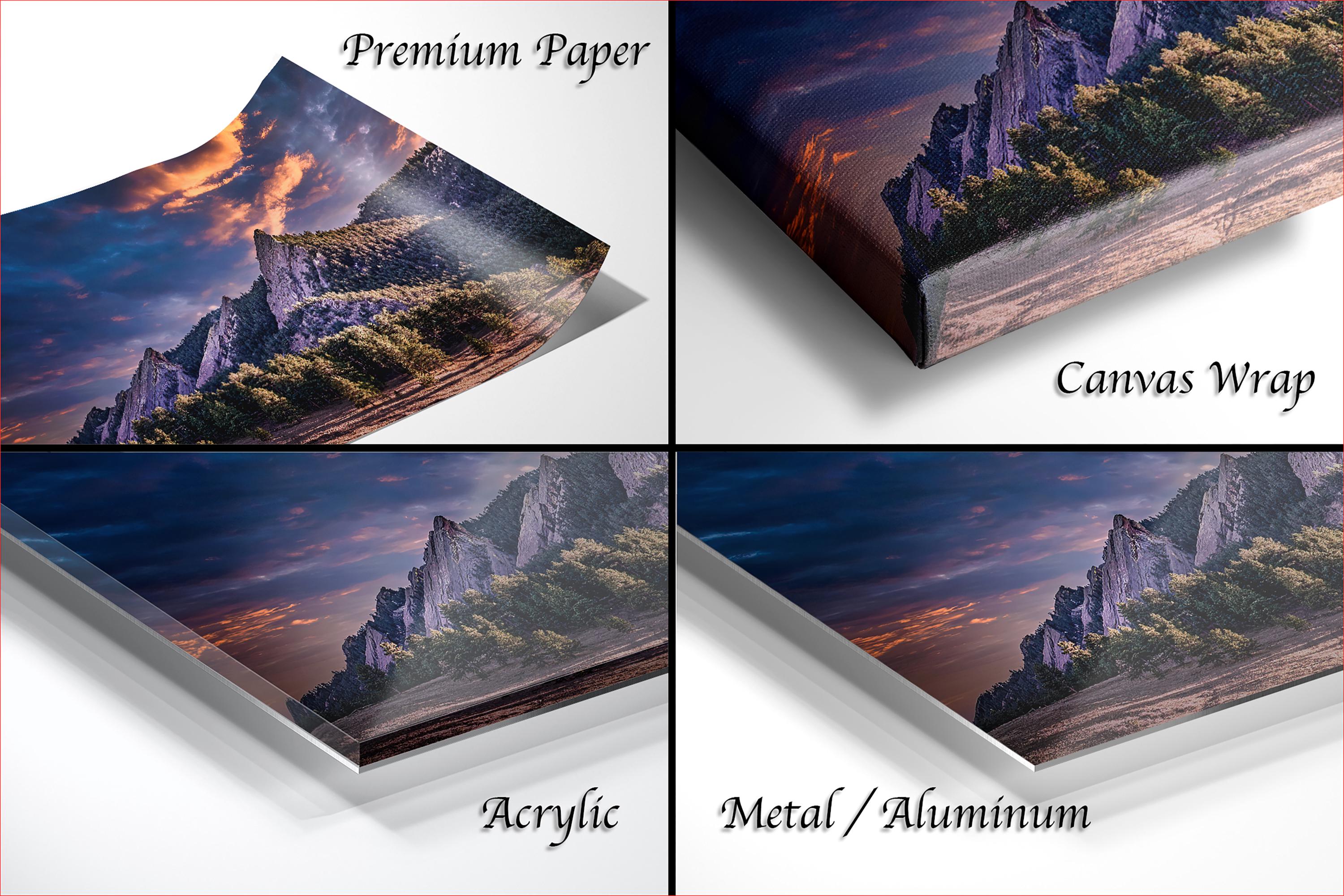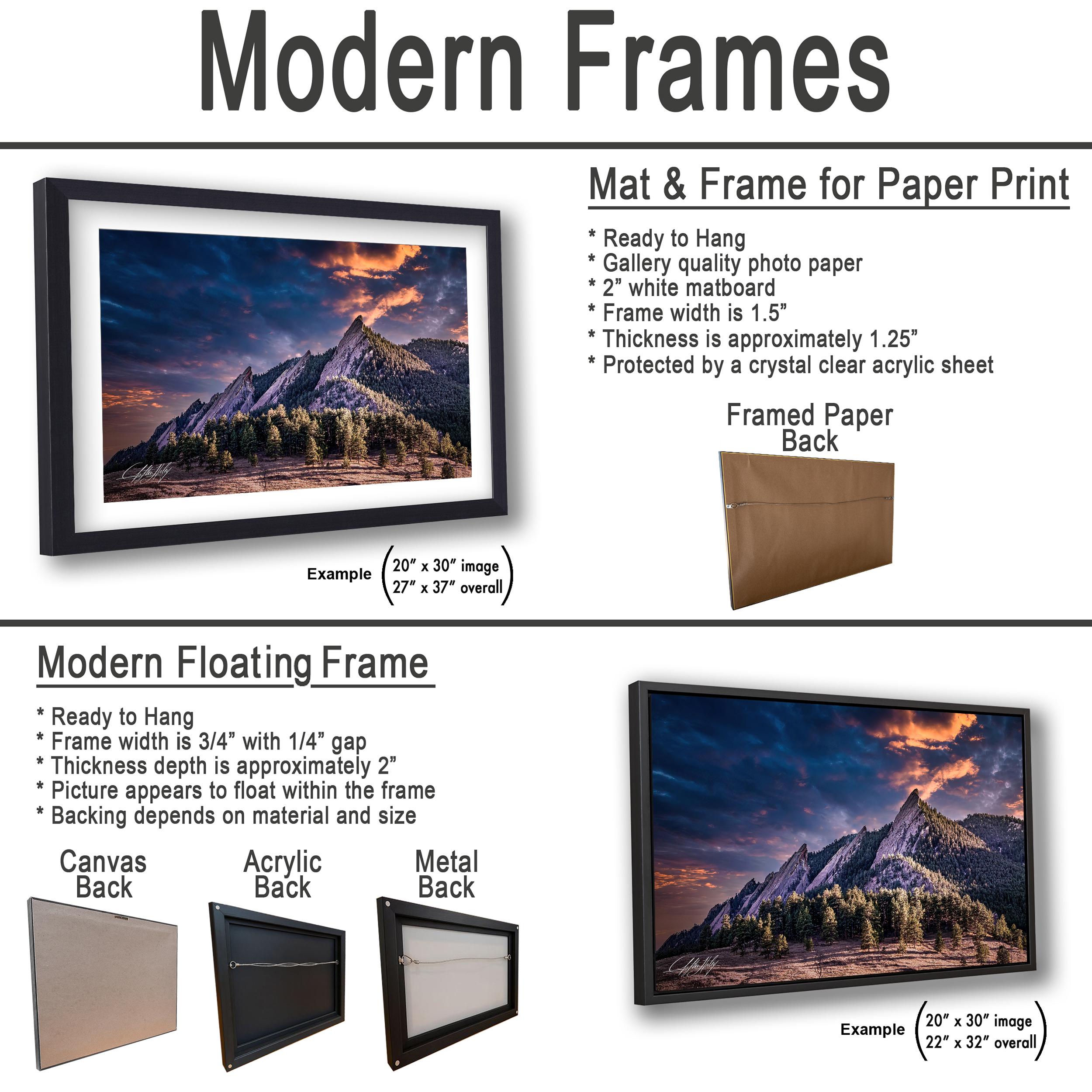 3.1) Only framed paper prints, acrylics and aluminum/metal prints will have a 2" white mat border. 3.2) Canvas prints will be a flush mounted (no mat border) to the frame.