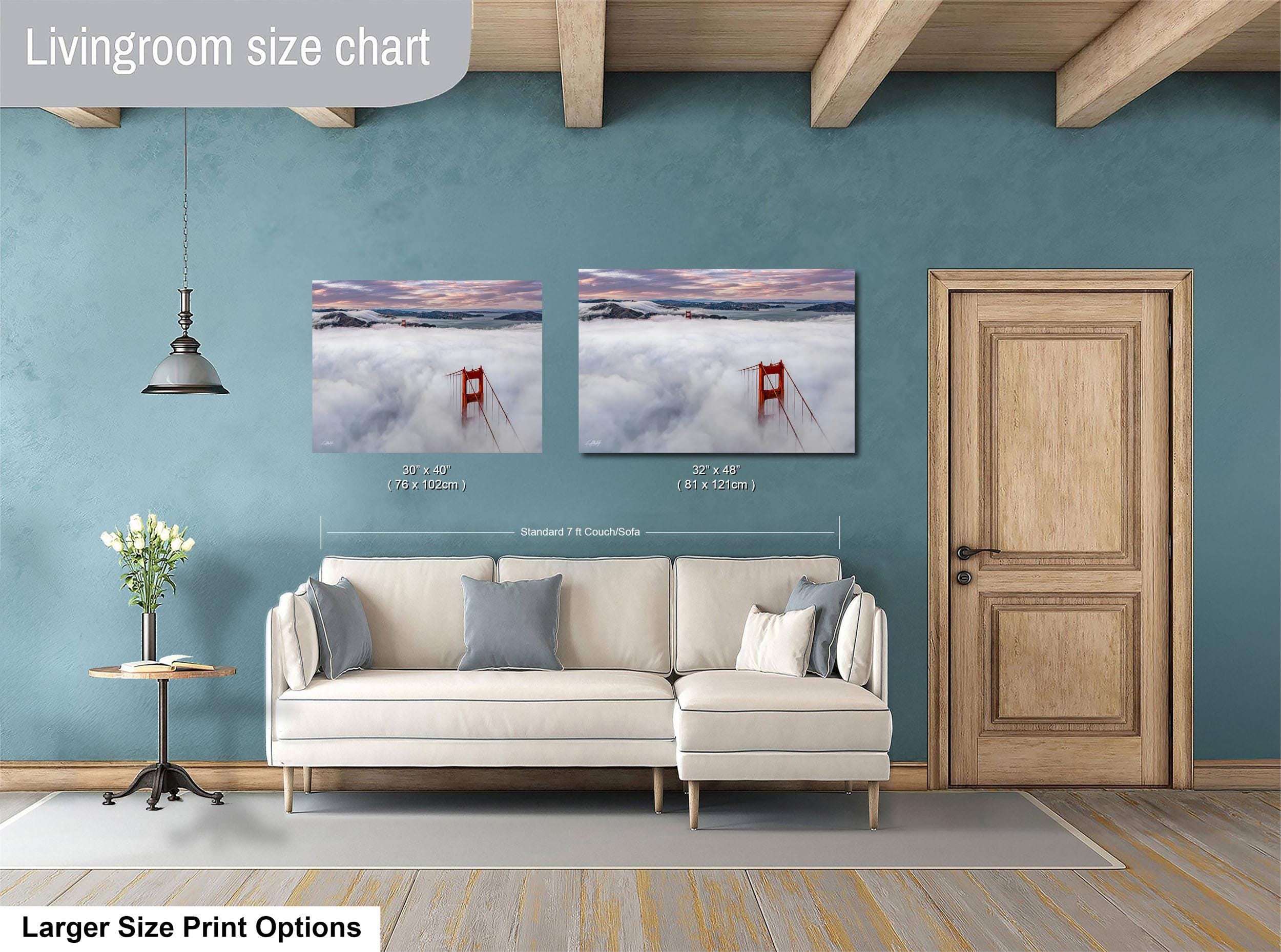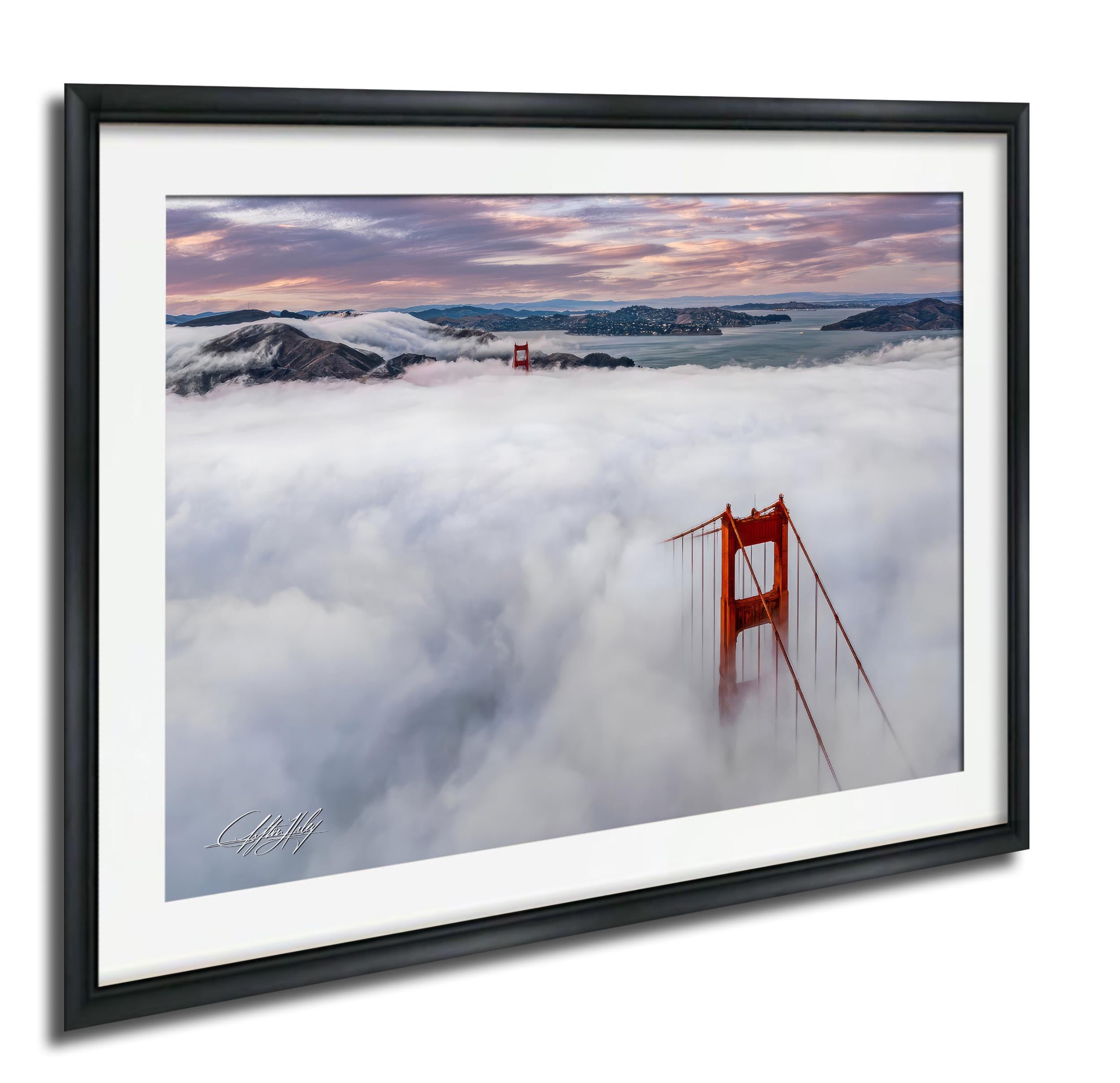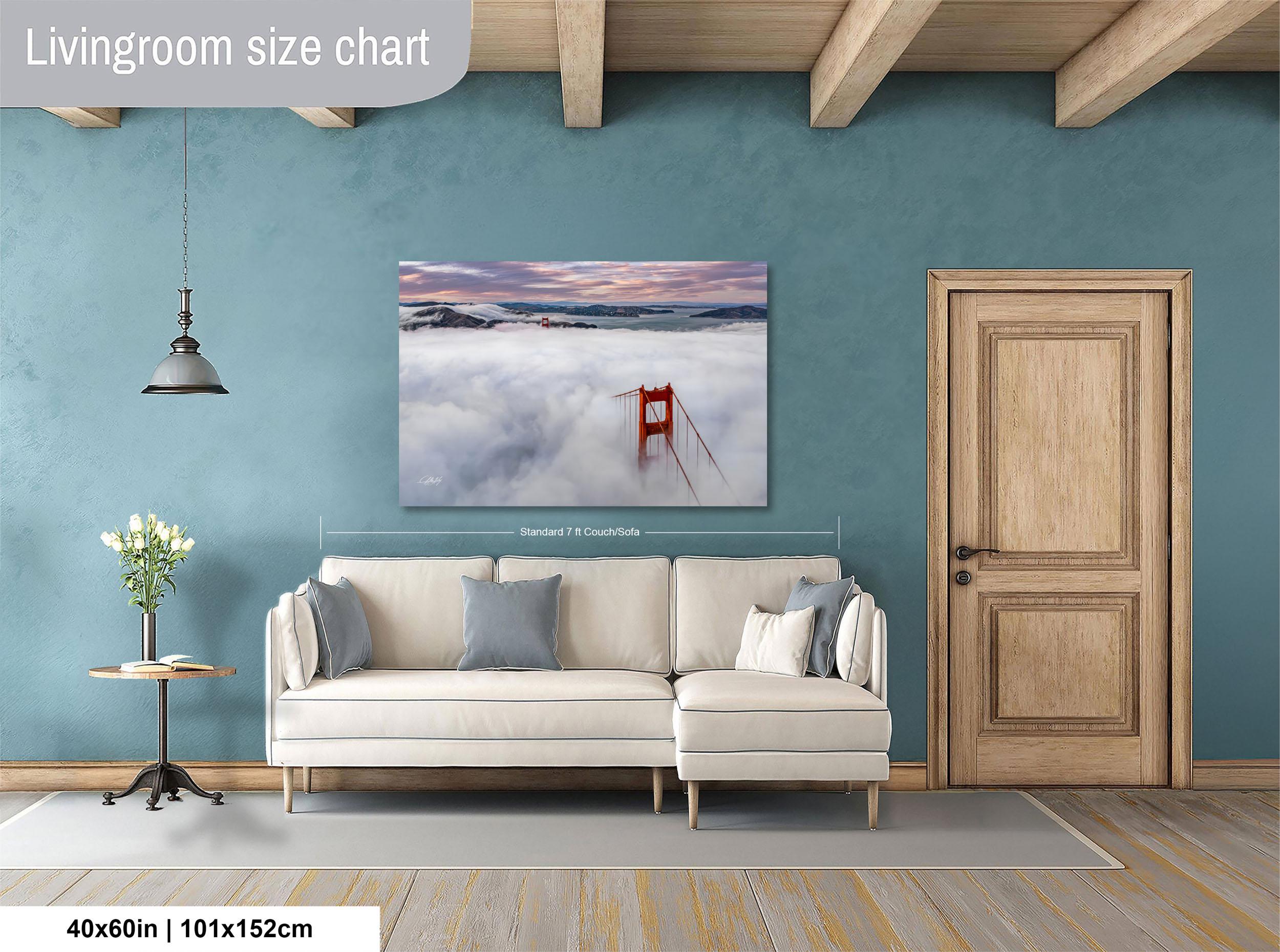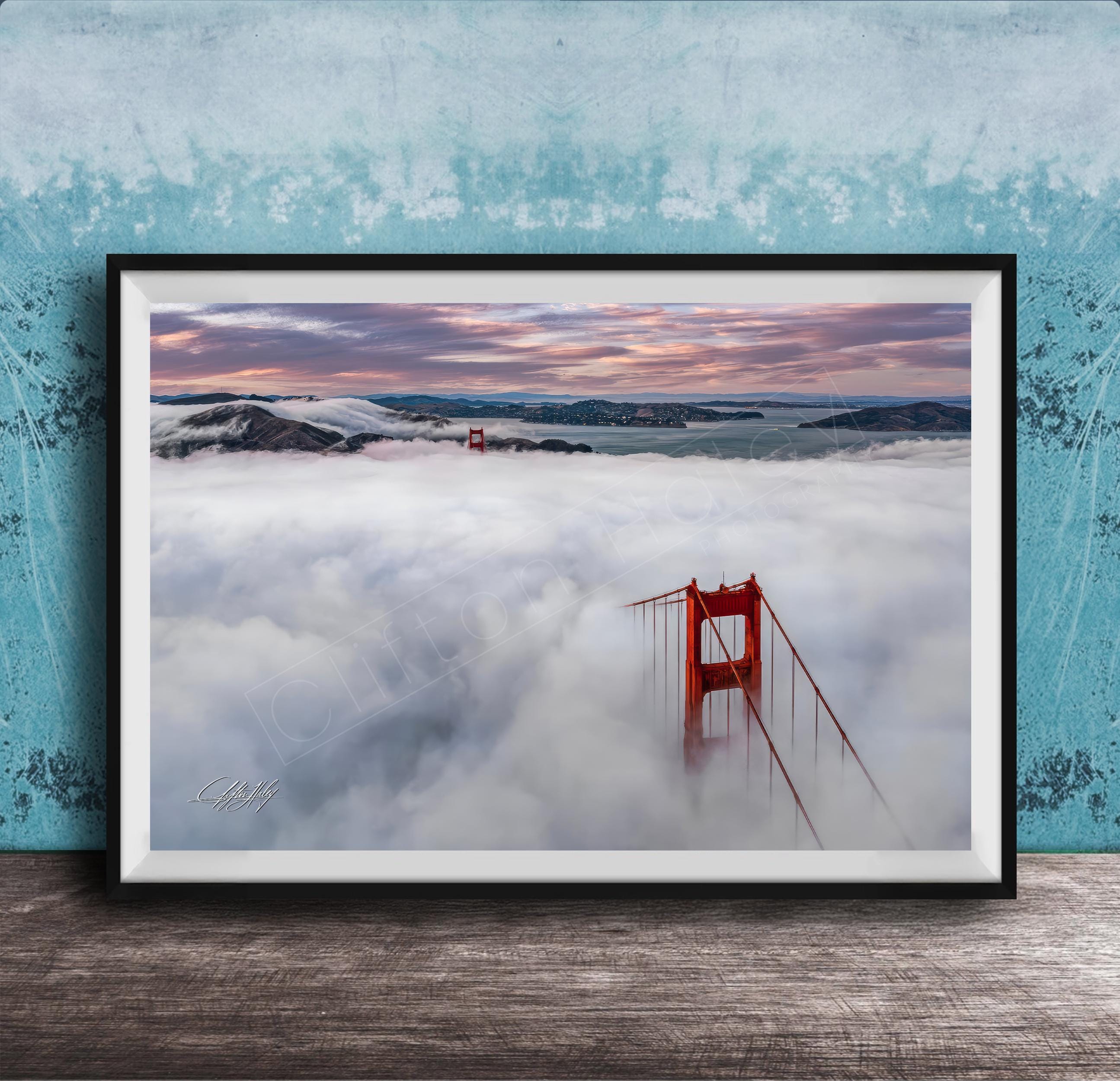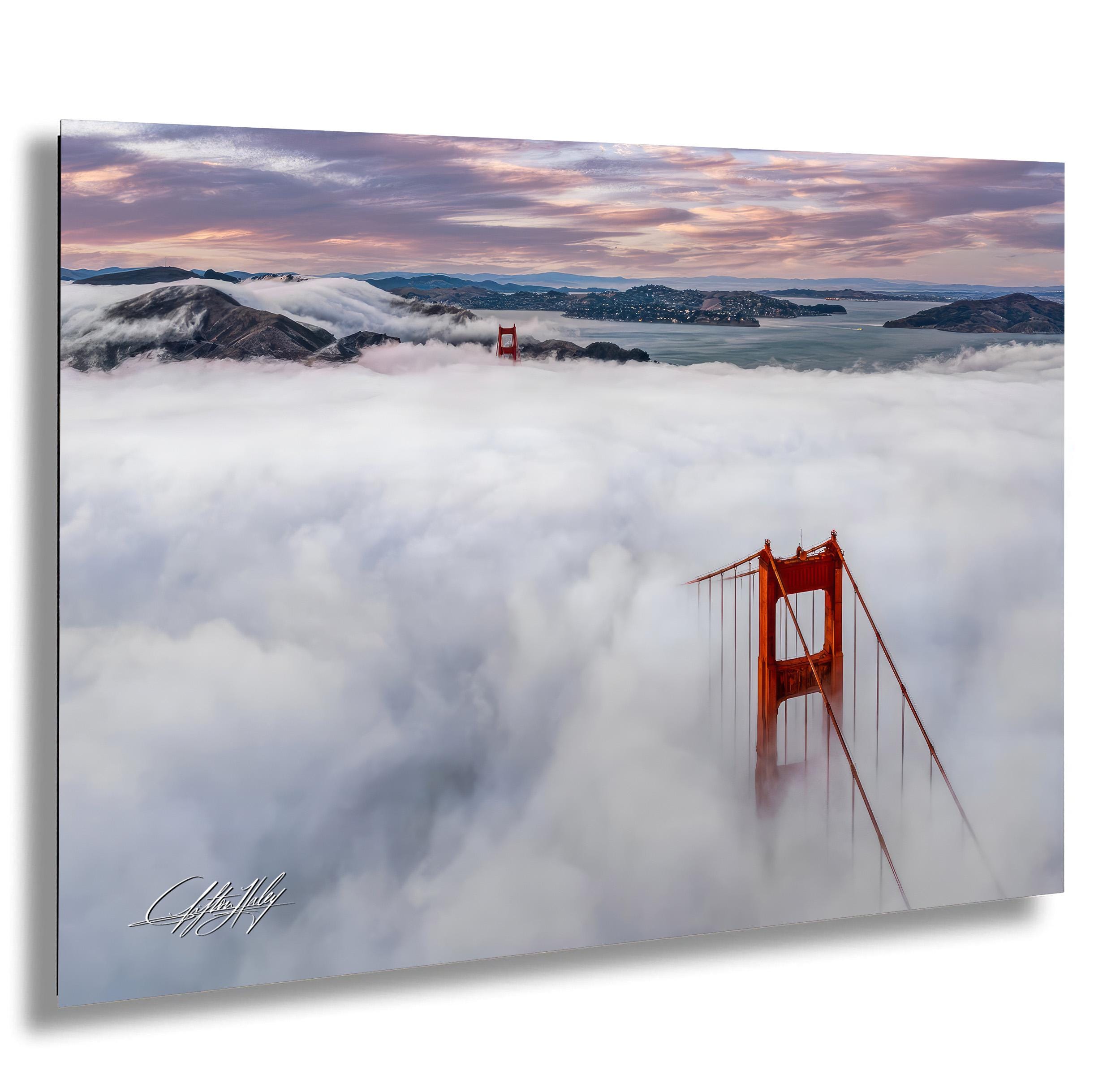 Experience the magic of San Francisco with this striking Golden Gate Bridge in Fog wall art. Captured by drone at sunset, the bridge rises through swirling fog beneath a colorful sky, blending mystery with beauty. Perfect for travel lovers and California landscape fans, this print brings the iconic charm of the Bay Area into any space.