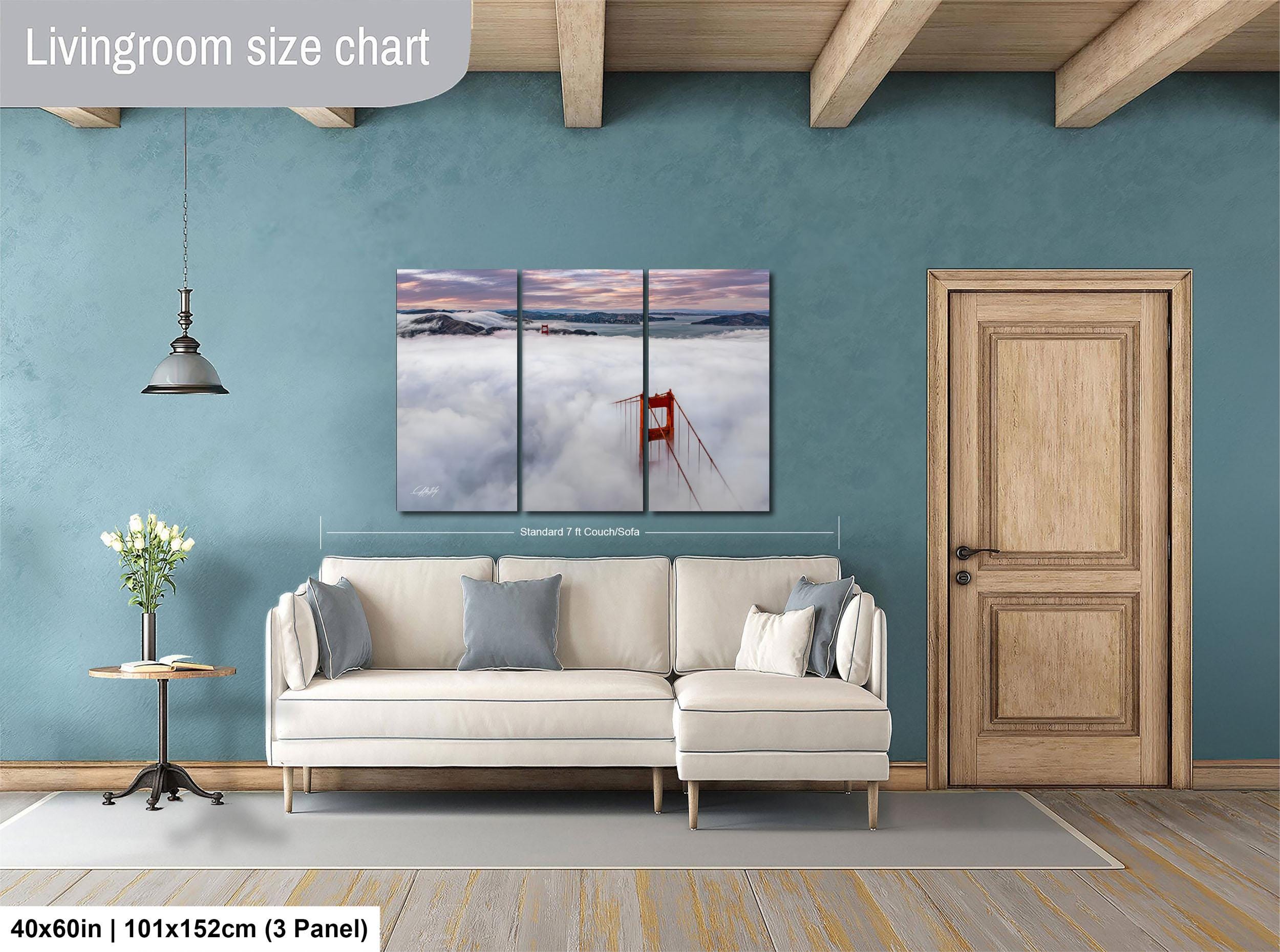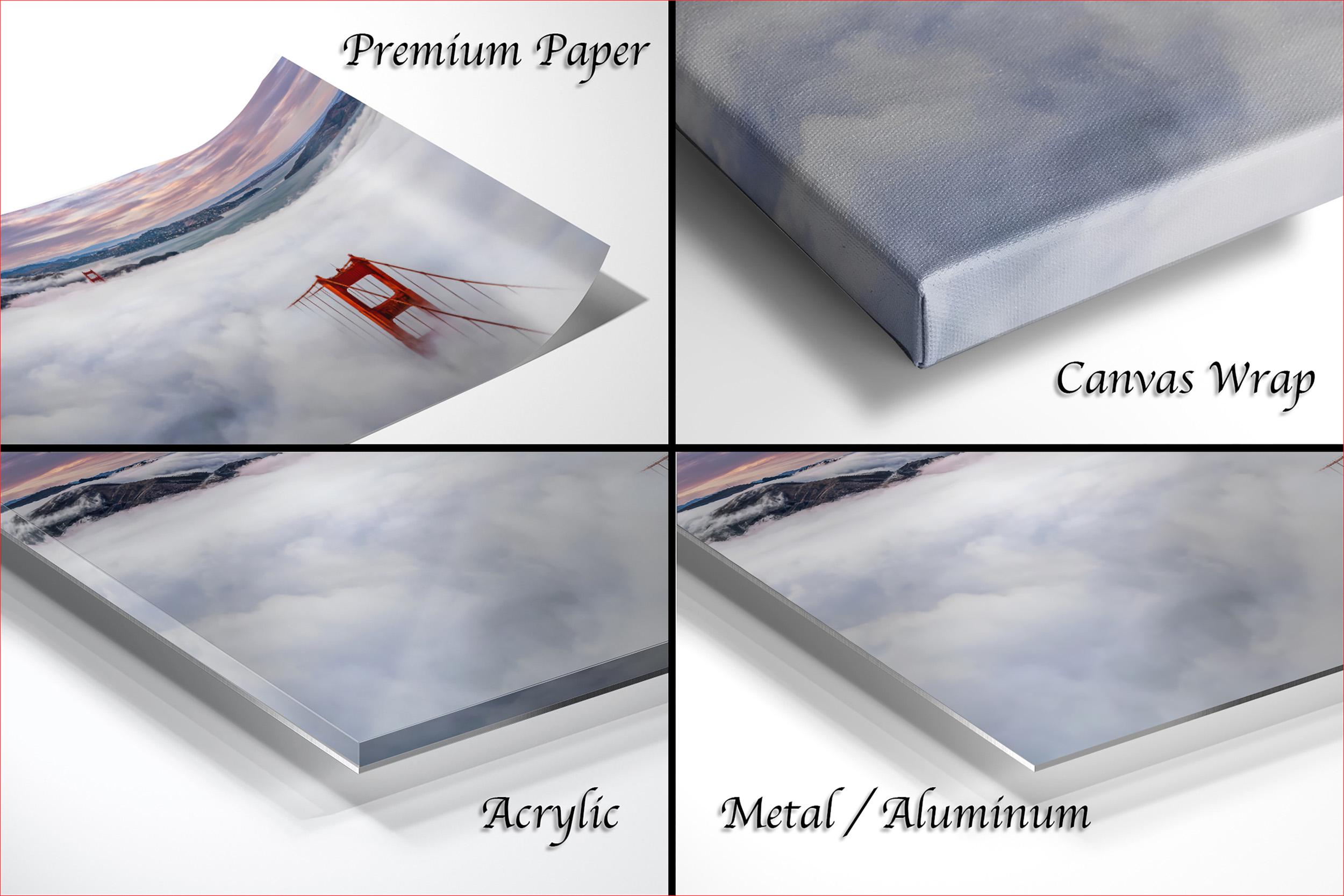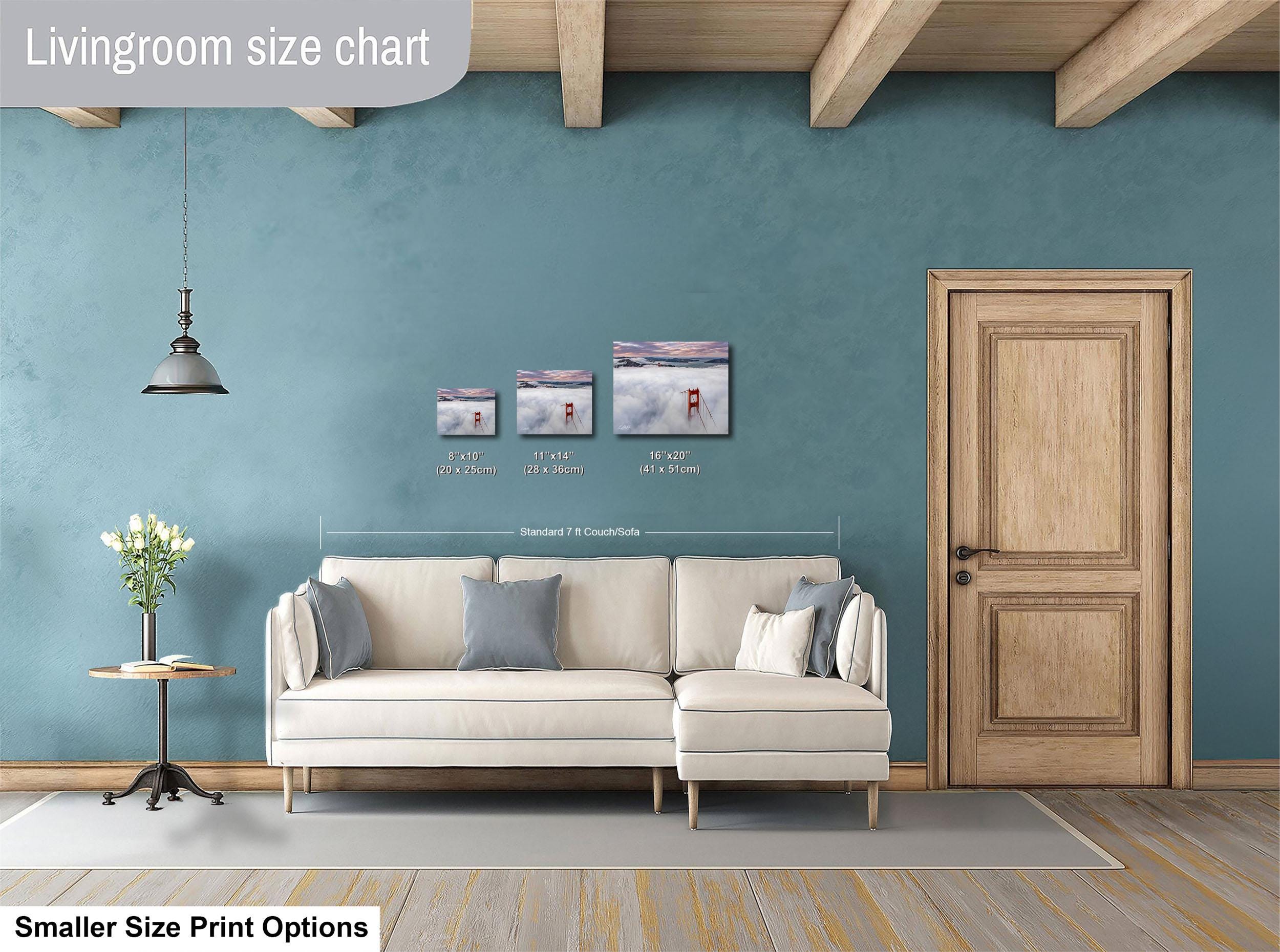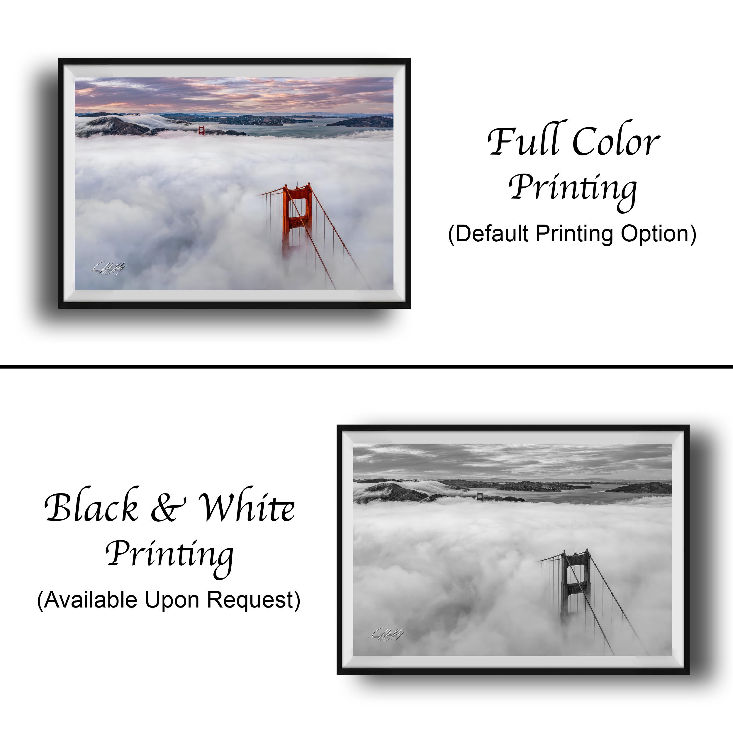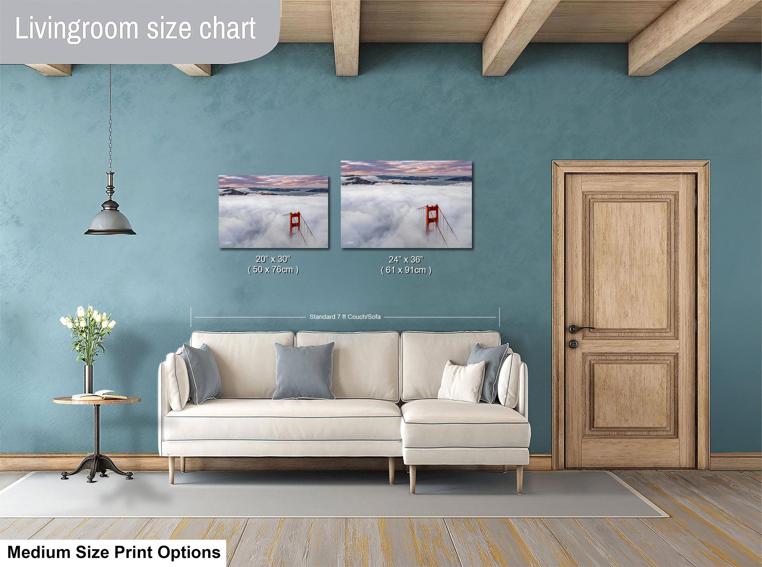 Experience the magic of San Francisco with this striking Golden Gate Bridge in Fog wall art. Captured by drone at sunset, the bridge rises through swirling fog beneath a colorful sky, blending mystery with beauty. Perfect for travel lovers and California landscape fans, this print brings the iconic charm of the Bay Area into any space.
