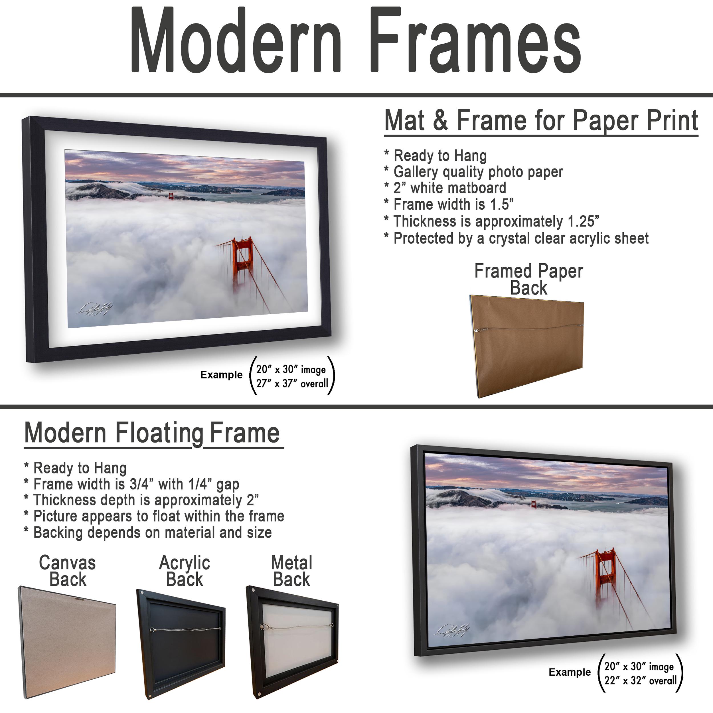 3.1) Only framed paper prints, acrylics and aluminum/metal prints will have a 2" white mat border. 3.2) Canvas prints will be a flush mounted (no mat border) to the frame.