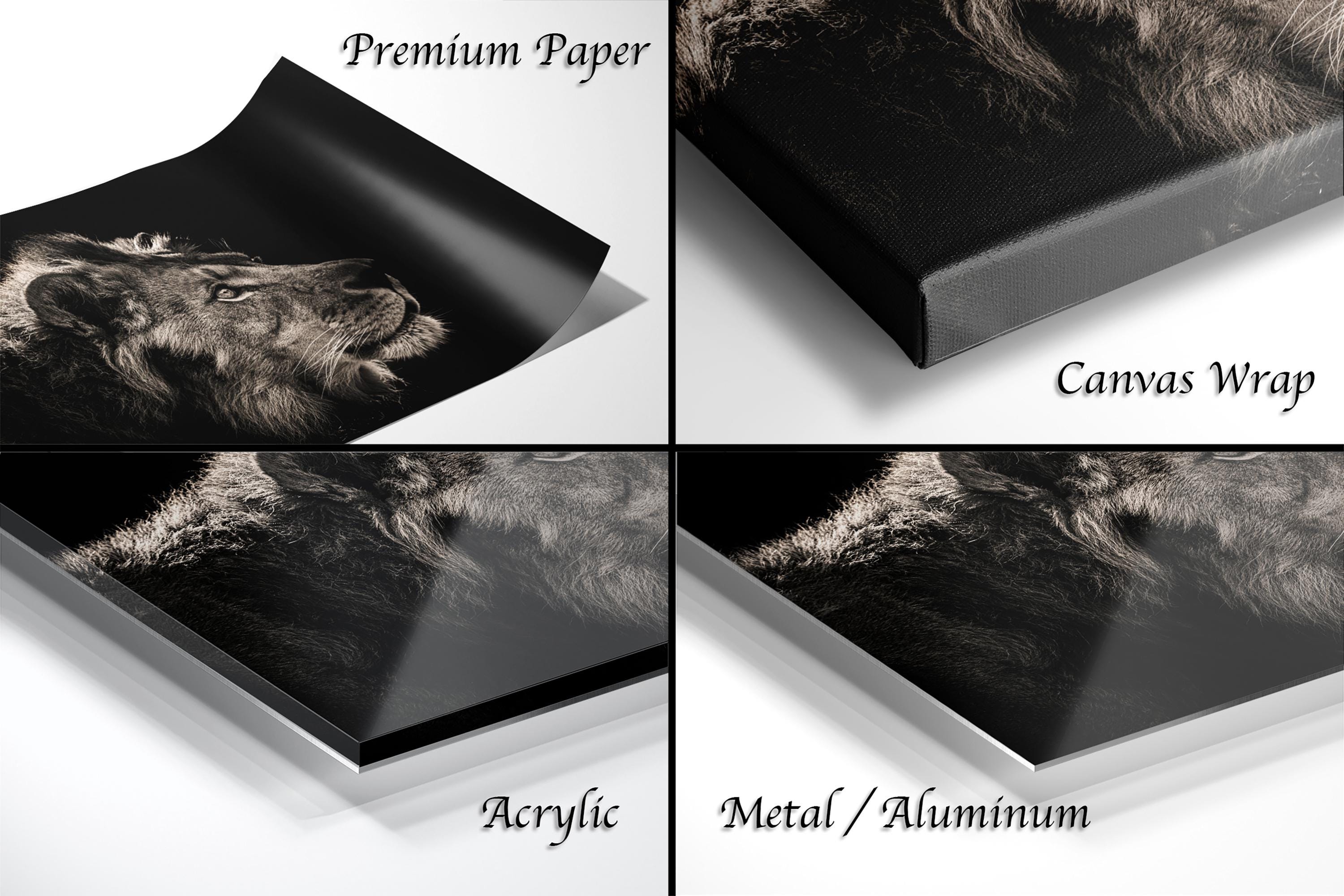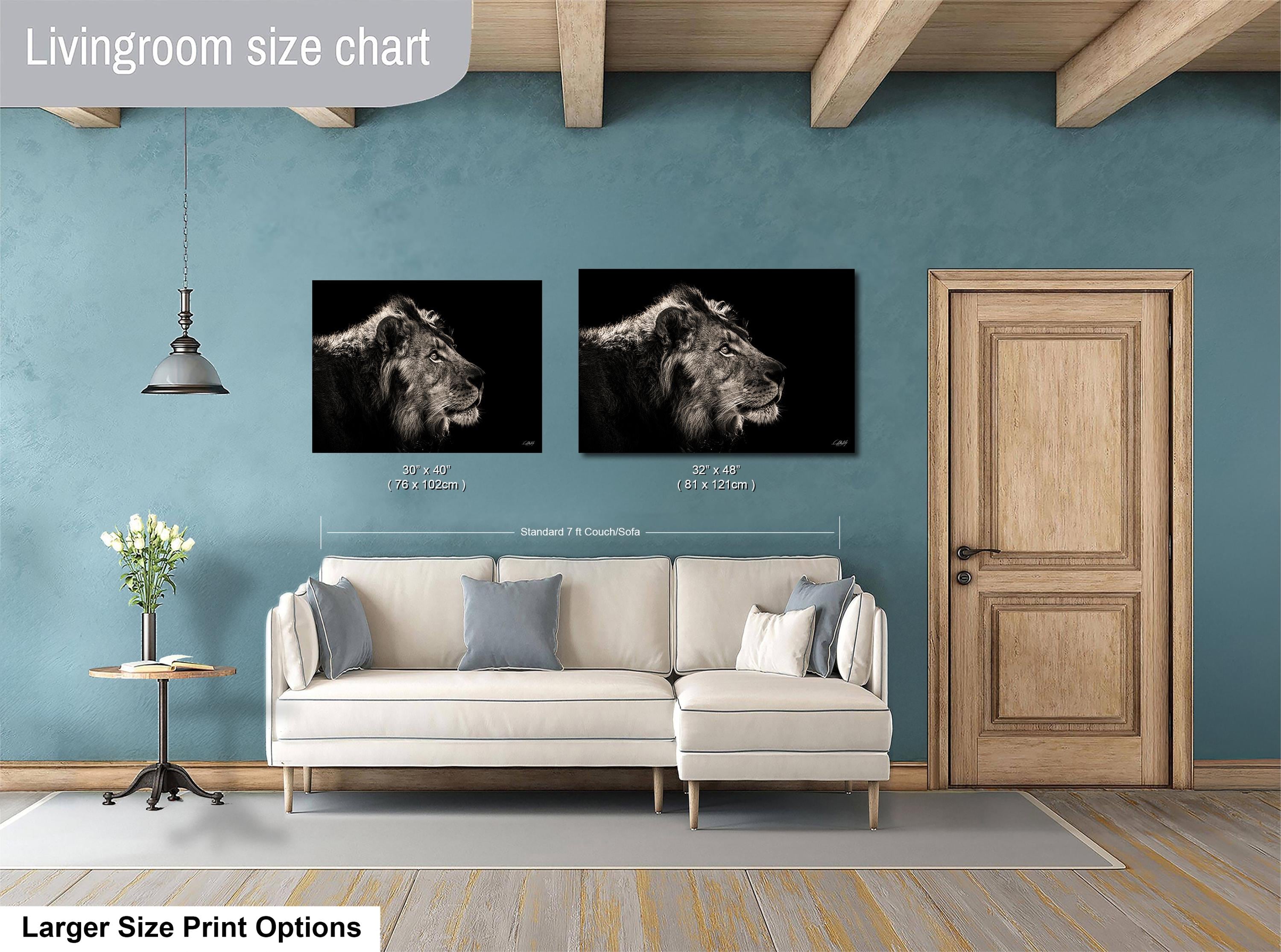 • Dimensions: Custom sizes available upon request • Material: High-quality canvas stretched over a sturdy frame • Style: Black and white luxury canvas print showcasing the lioness family art and king of savannah theme