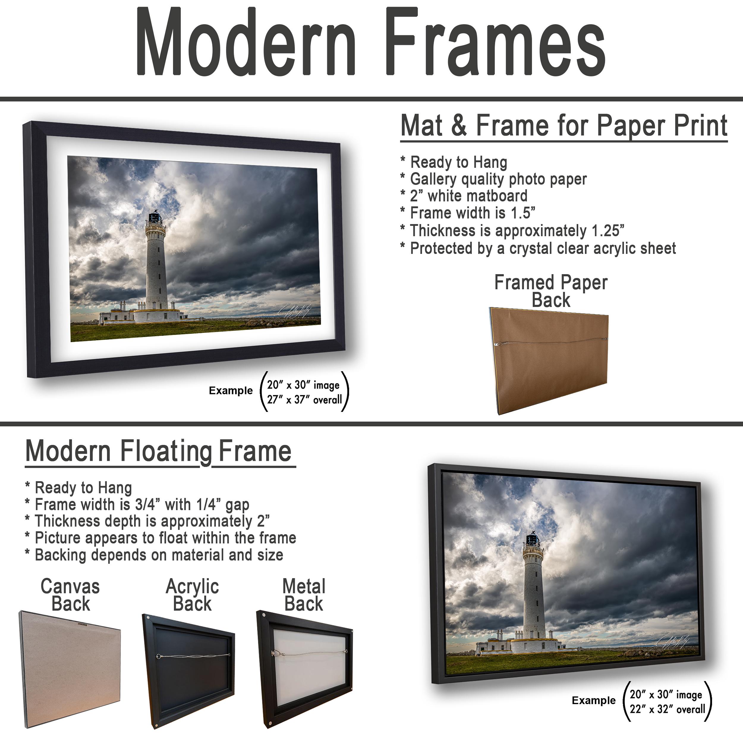 3.1) Only framed paper prints, acrylics and aluminum/metal prints will have a 2" white mat border. 3.2) Canvas prints will be a flush mounted (no mat border) to the frame.