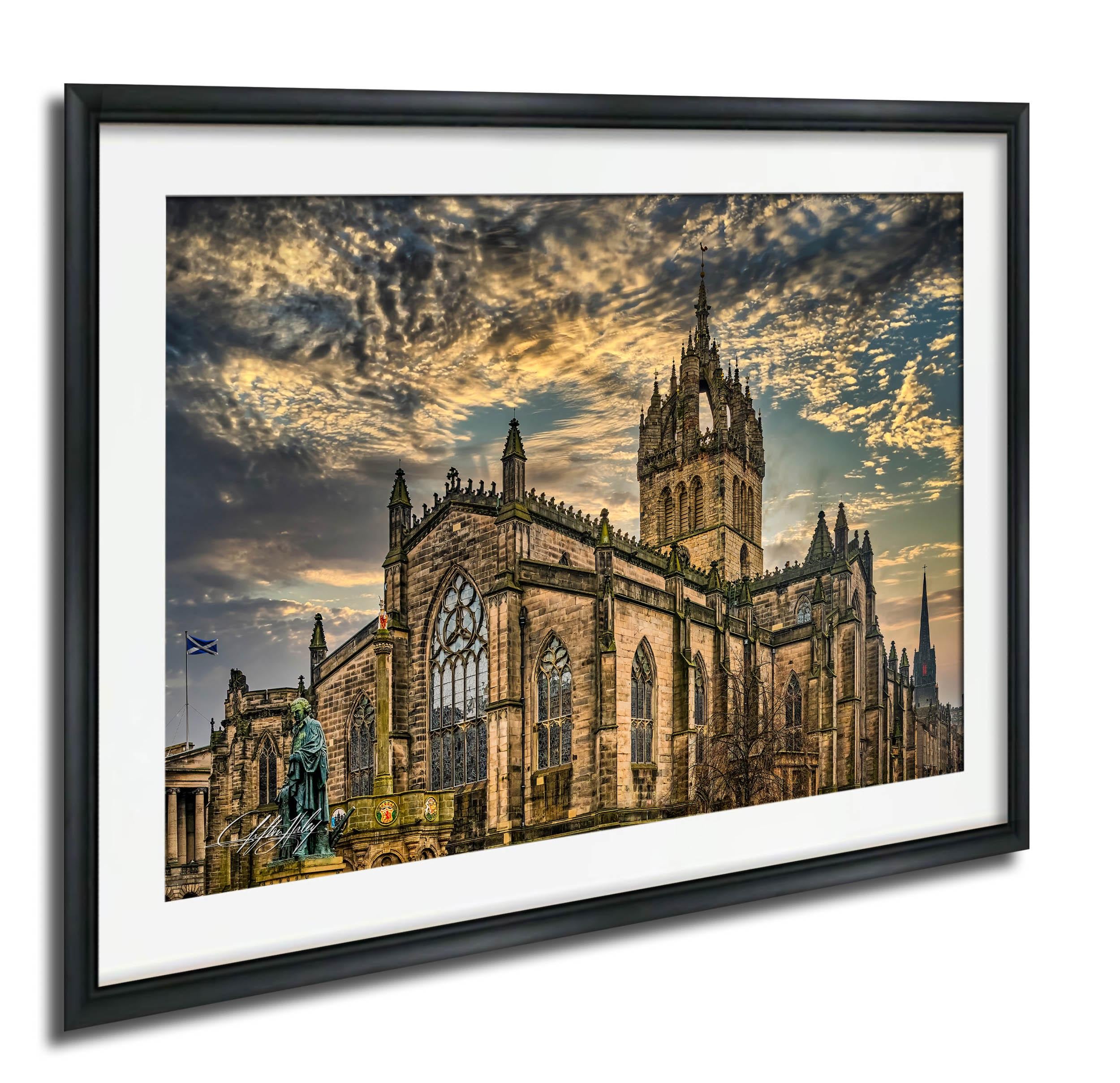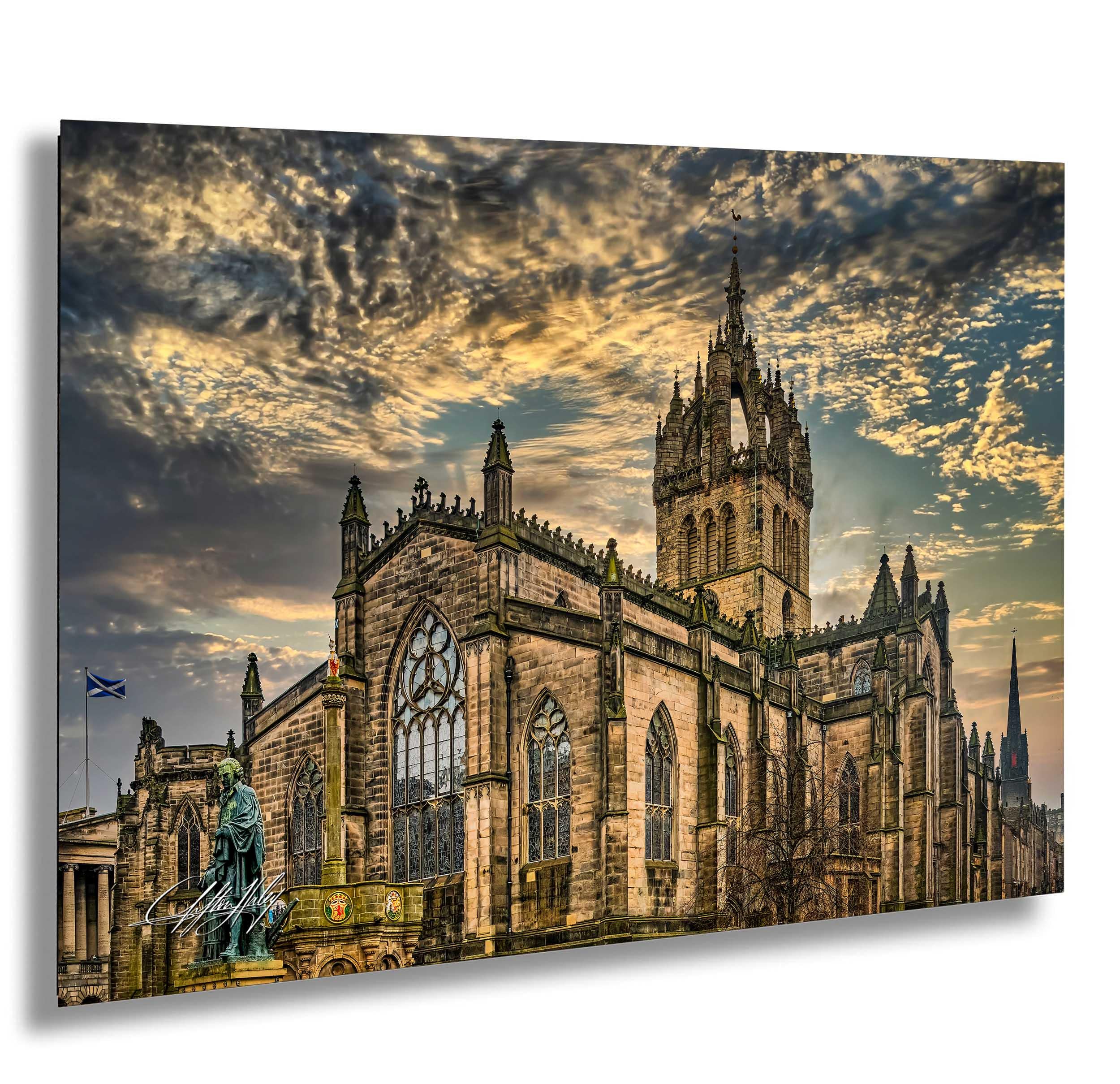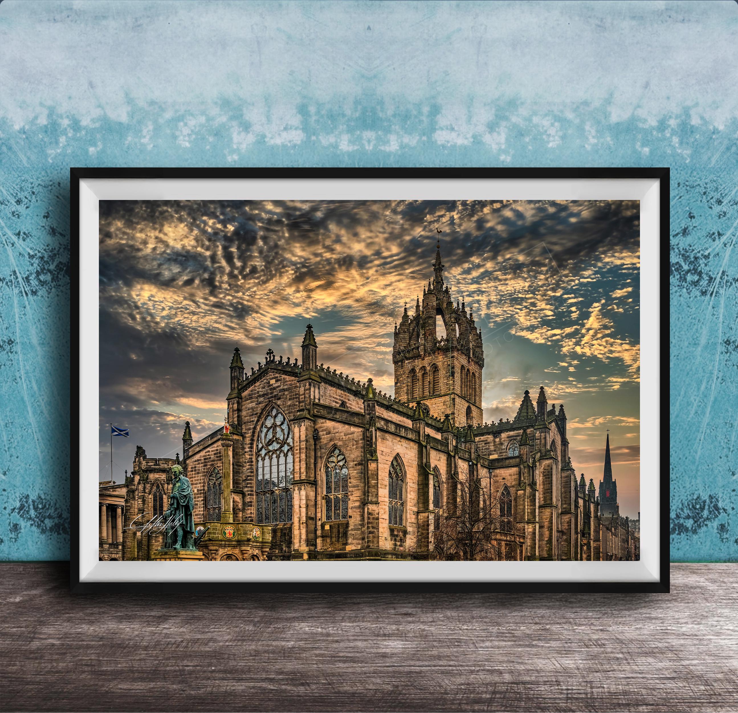 Discover the majestic St Giles Cathedral, Edinburgh Castle, and gothic cathedral landmarks in this stunning travel photography print, capturing Scotland's rich heritage.