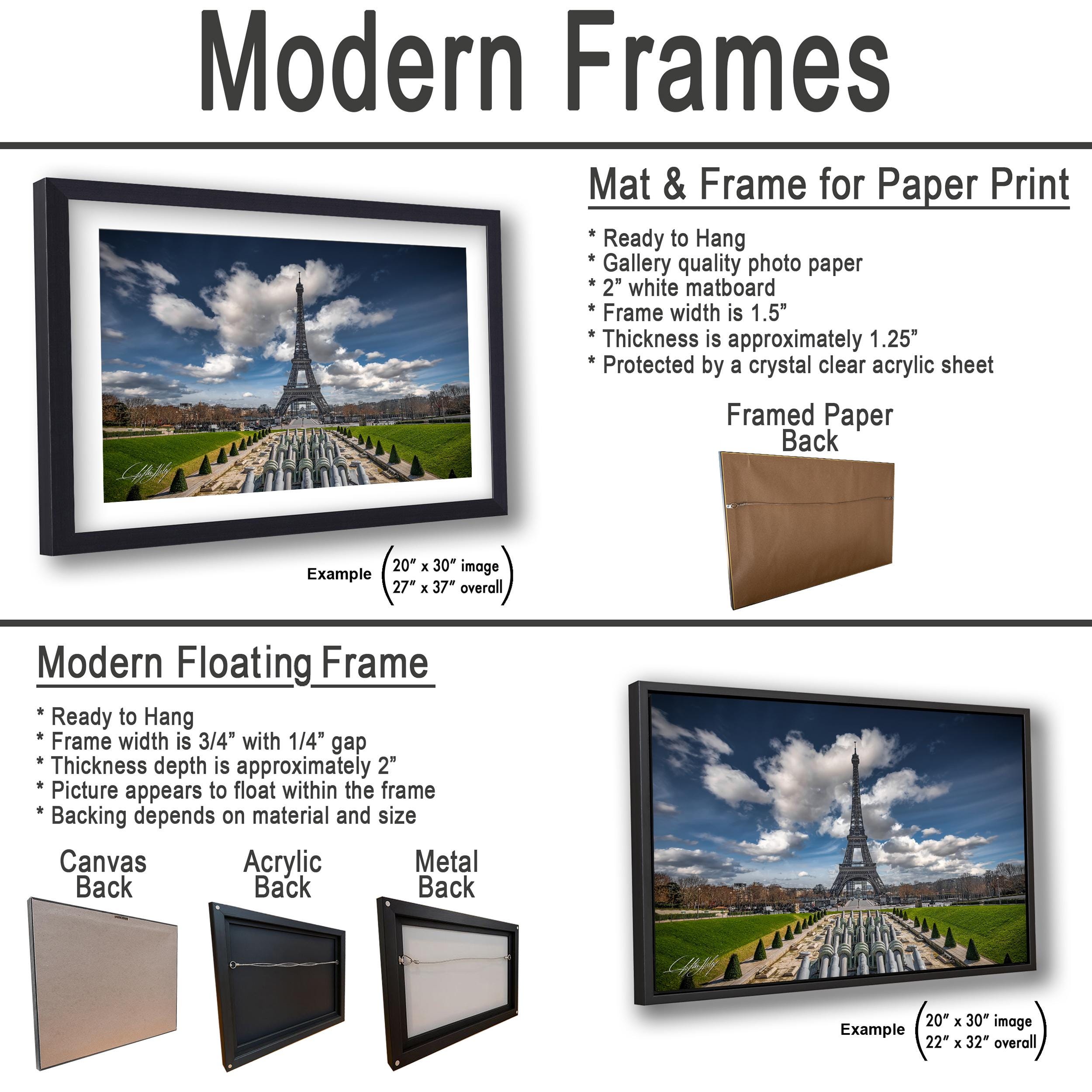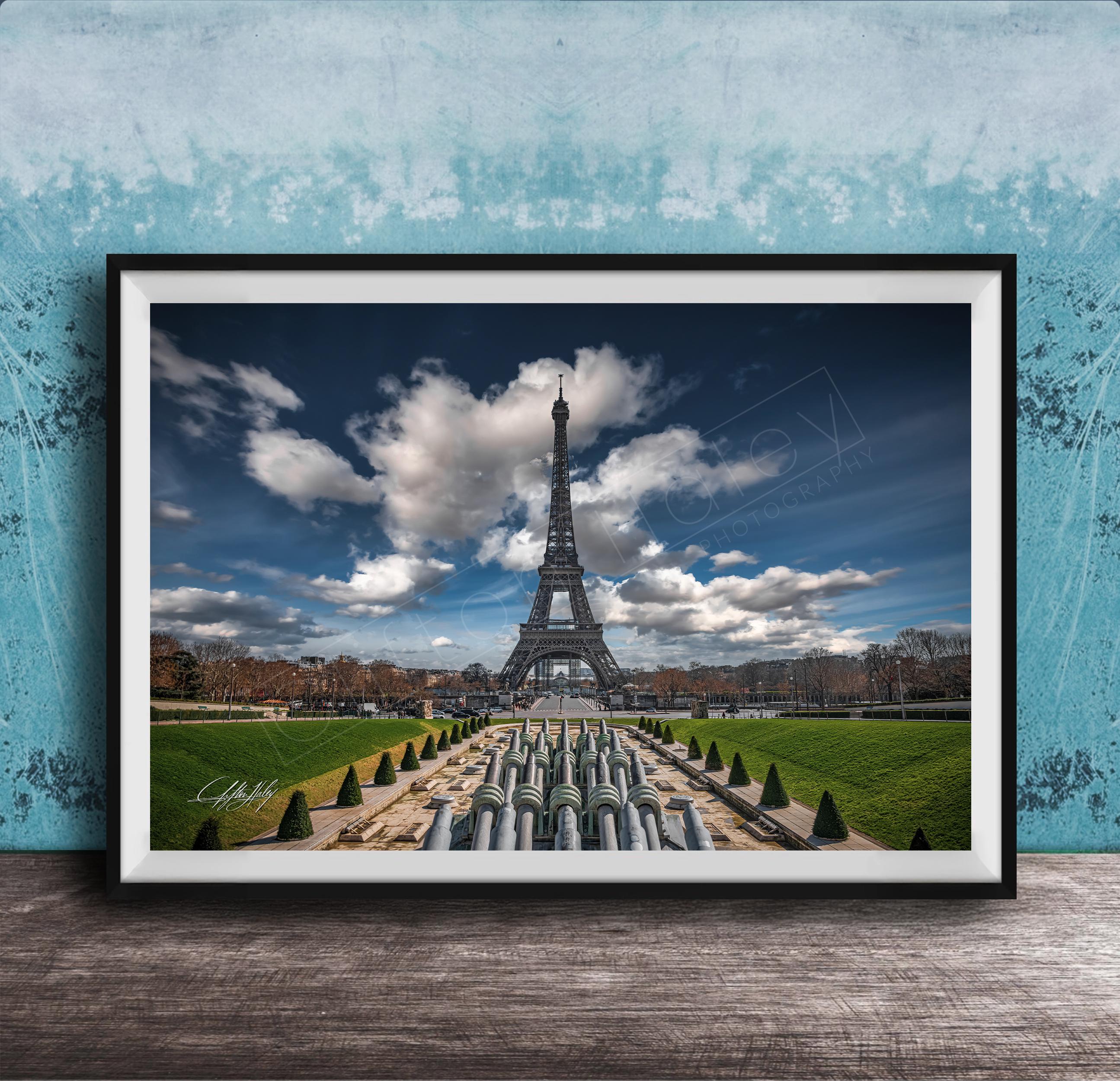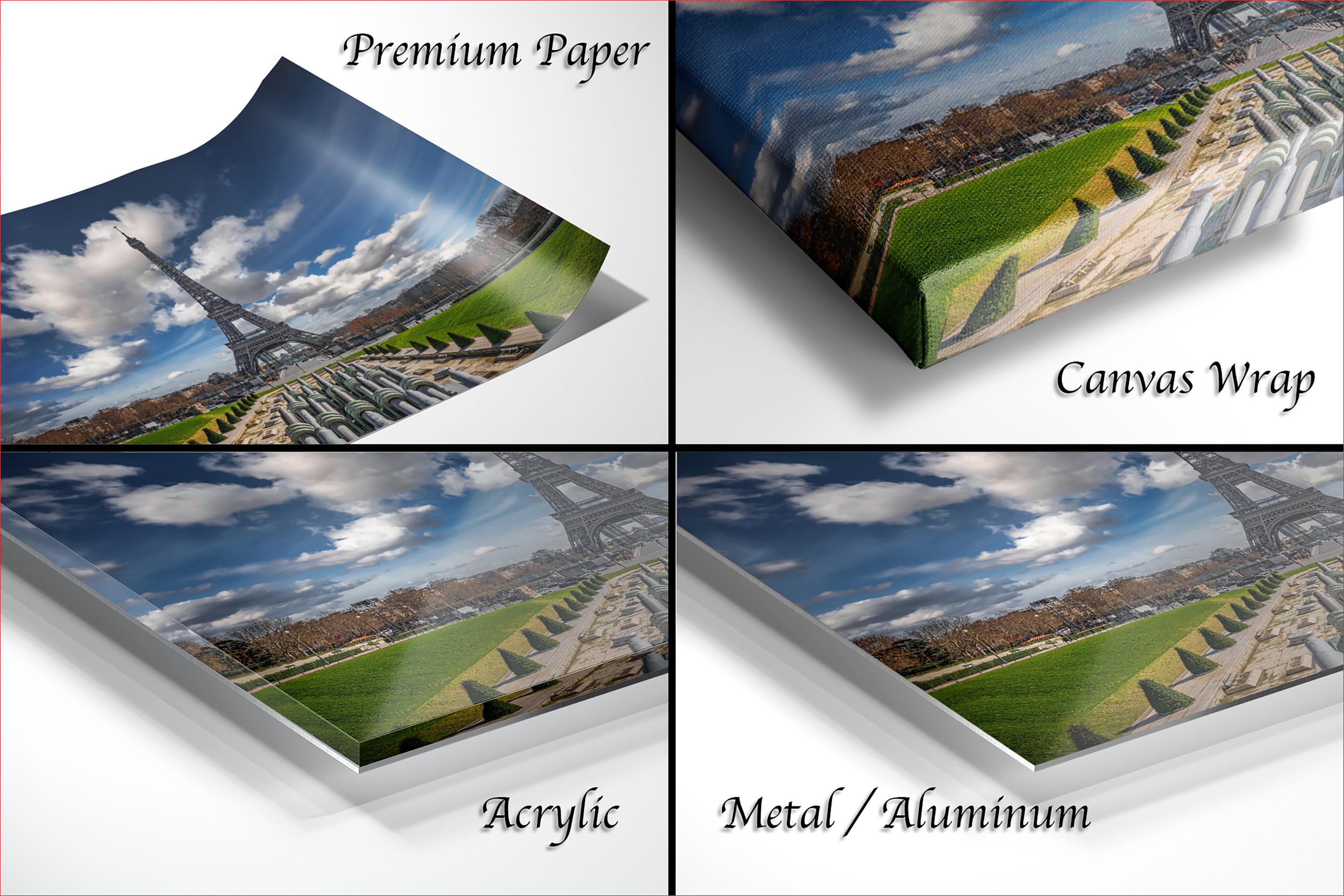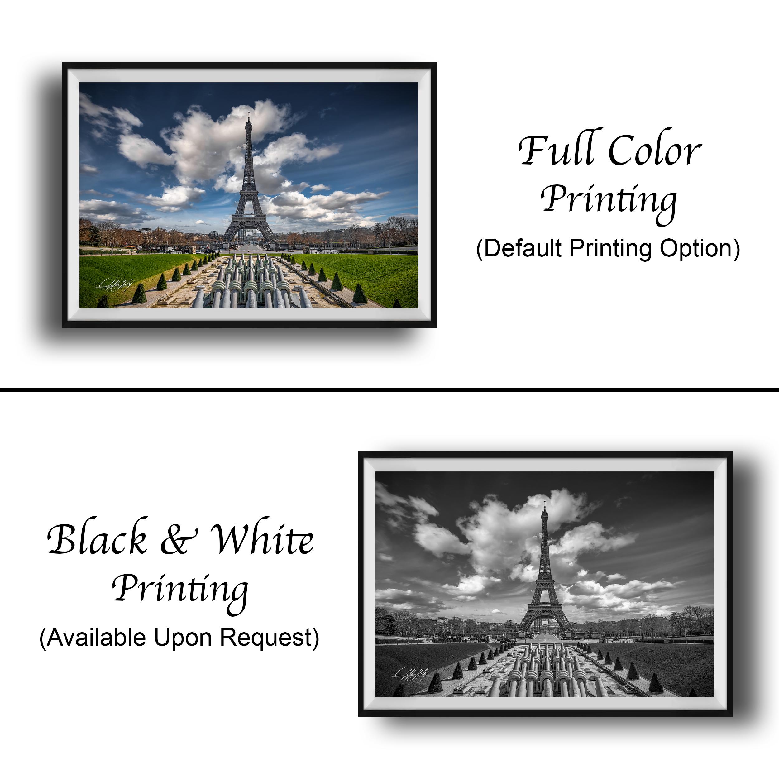 This made-to-order fine art photo print brings the iconic Paris landmark to life with rich detail and vibrant mood. Printed on high-quality aluminum metal, canvas, or framed paper with a 2" white mat border (for framed, acrylic, and metal prints), this unique Paris decor piece adds elegance to any space.