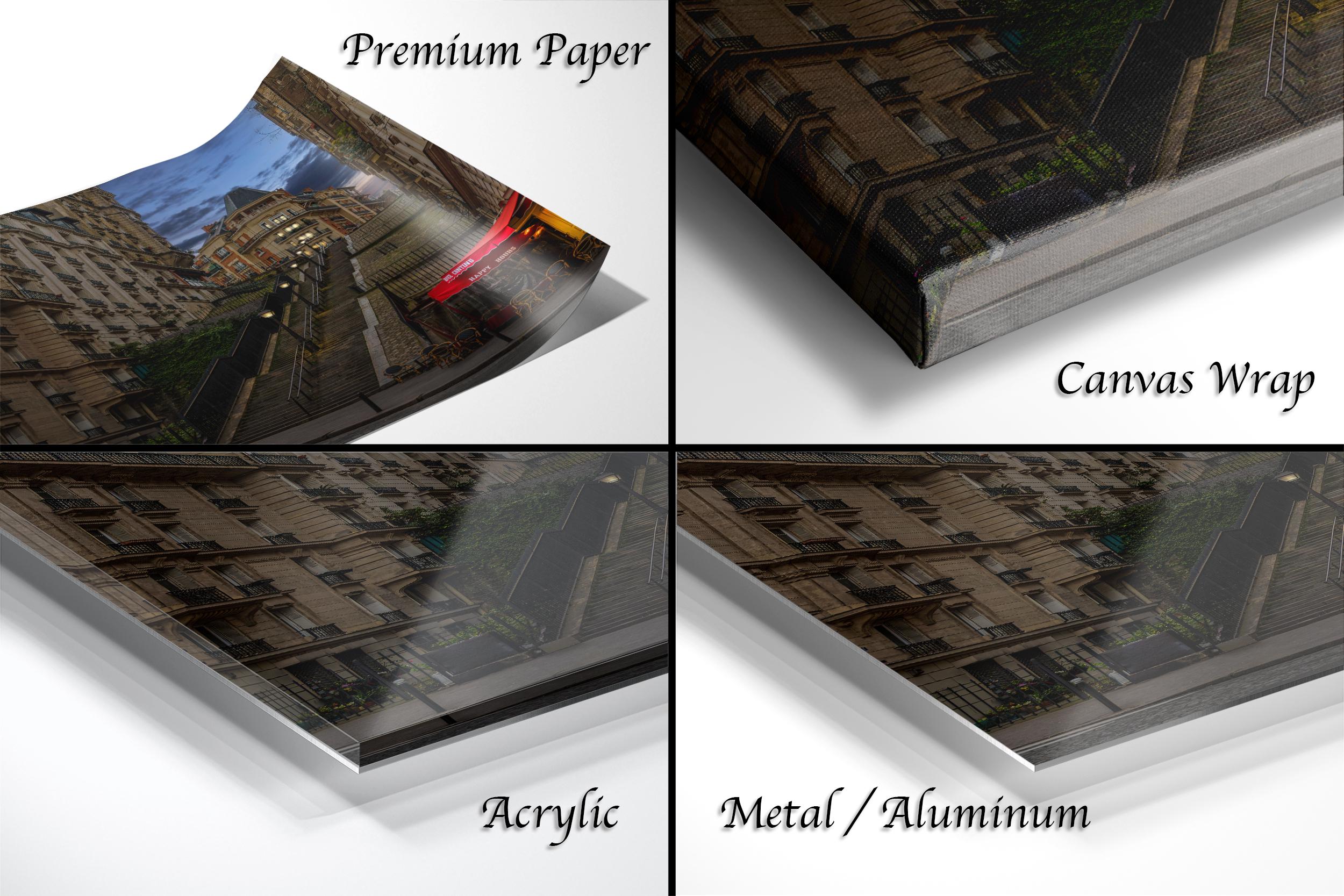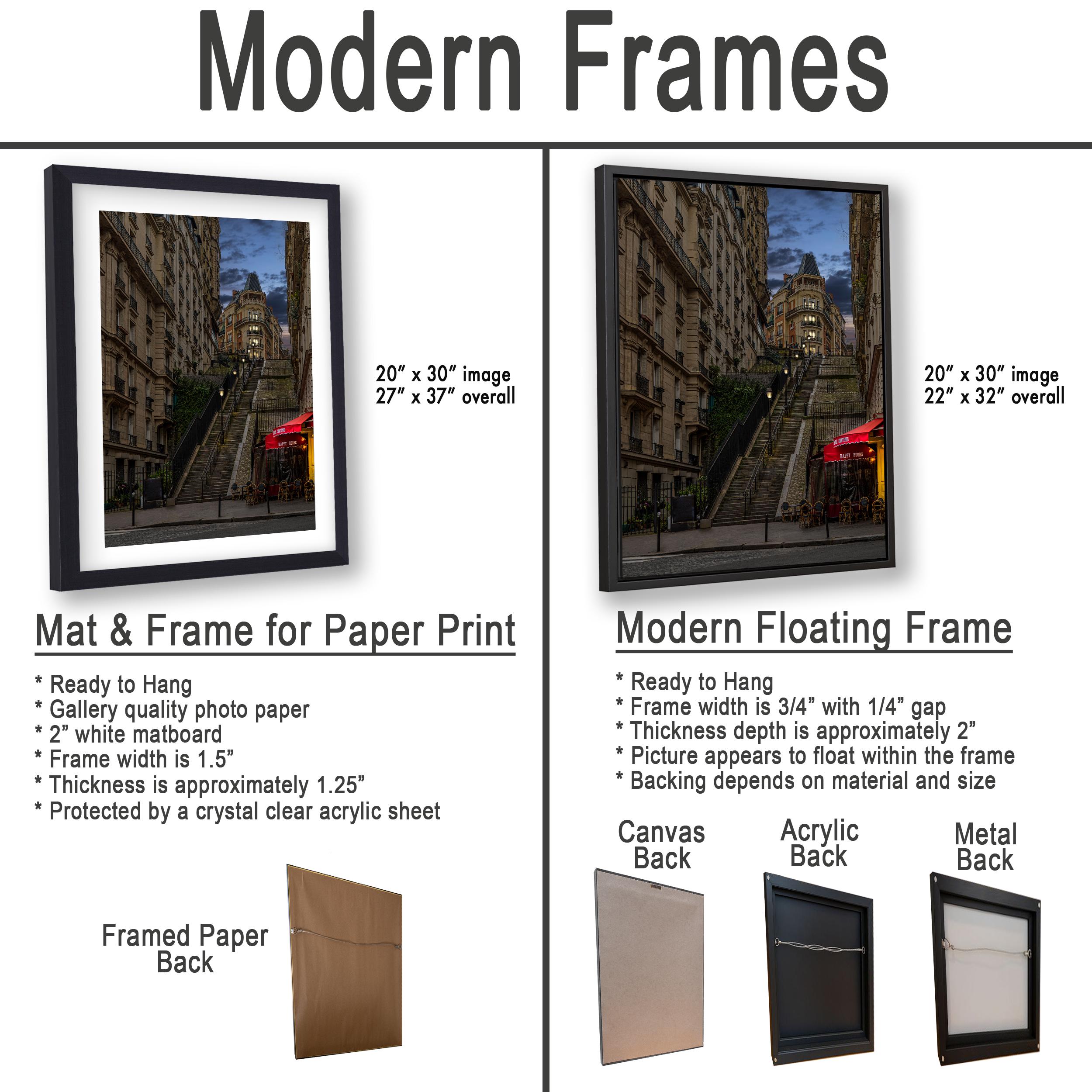 3.1) Only framed paper prints, acrylics and aluminum/metal prints will have a 2" white mat border. 3.2) Canvas prints will be a flush mounted (no mat border) to the frame.