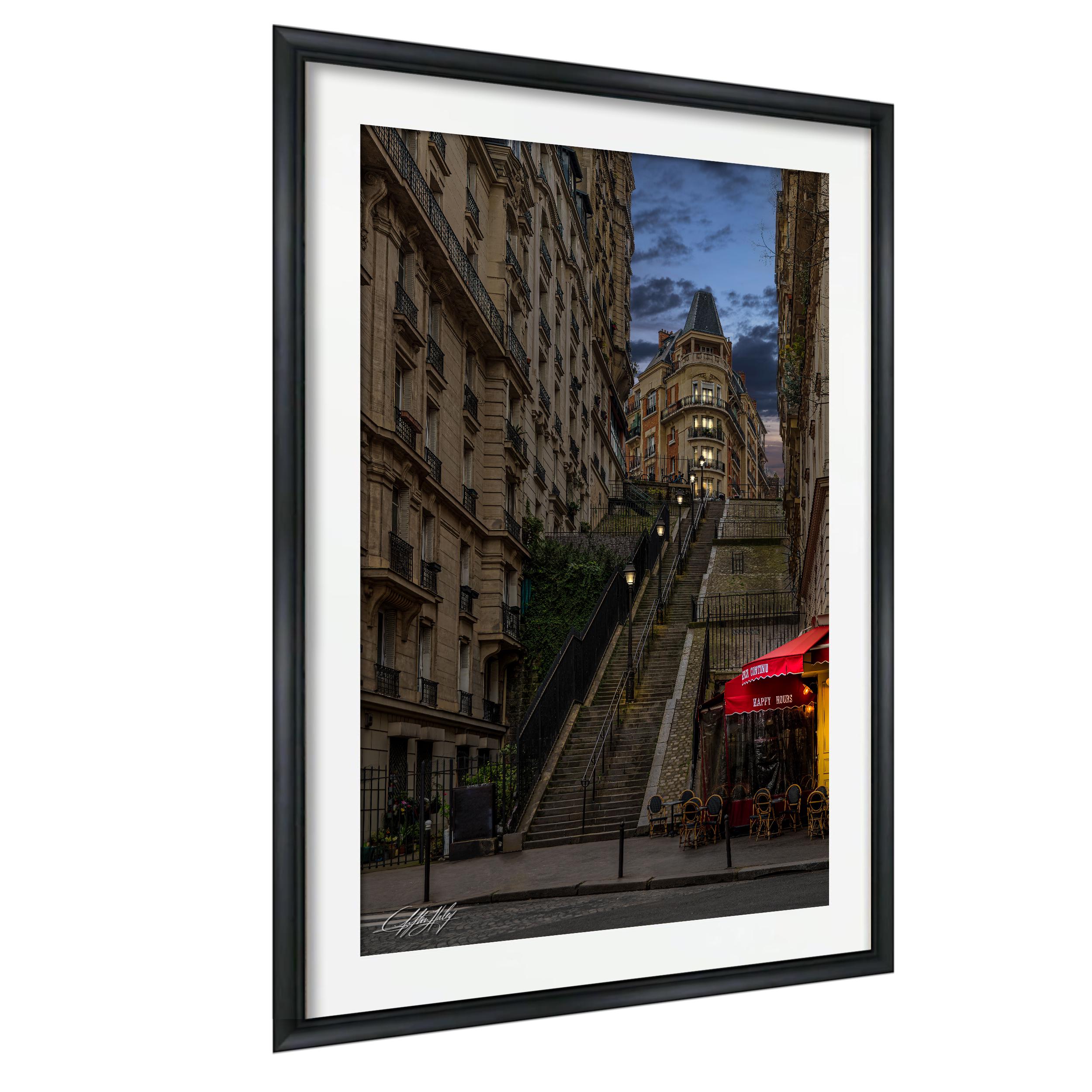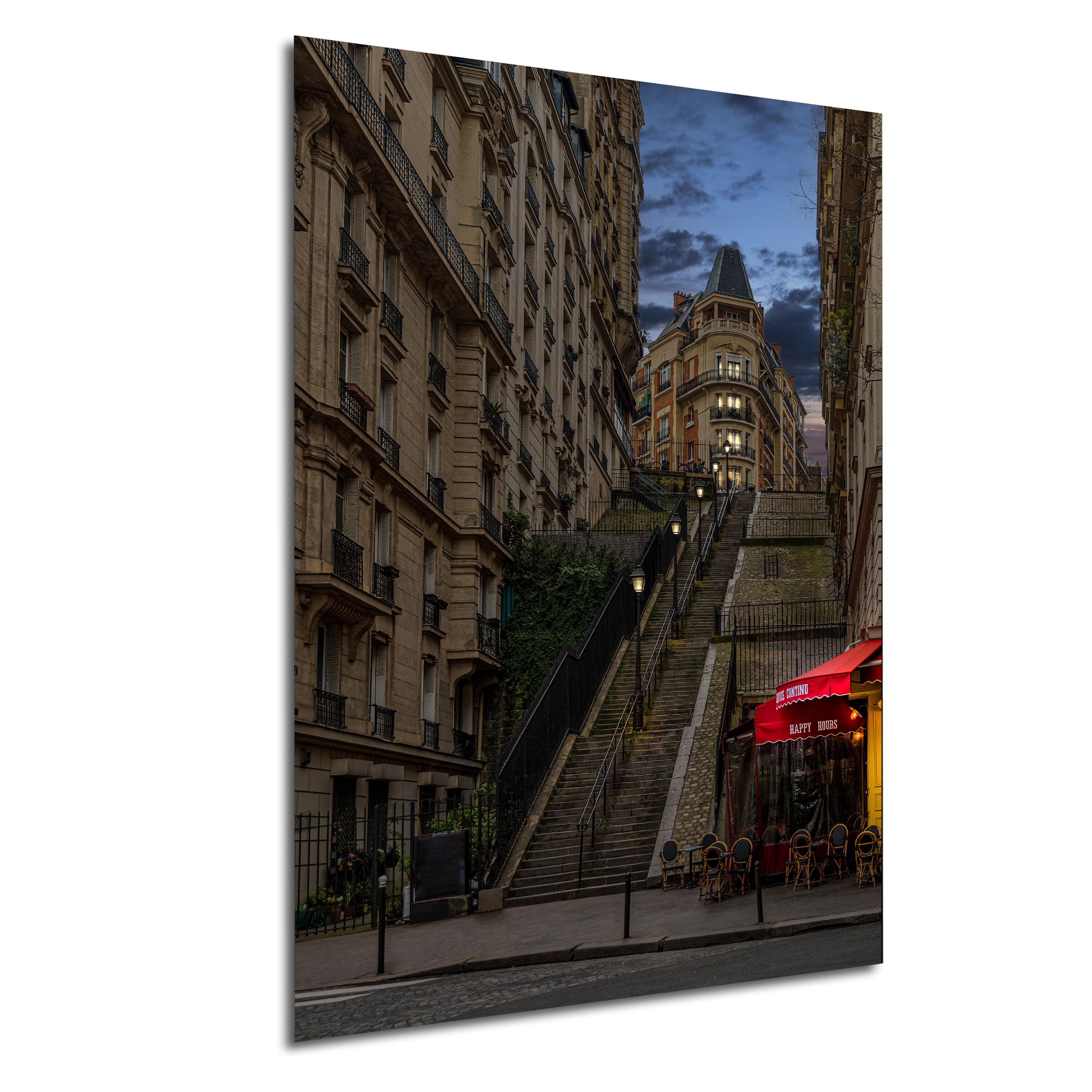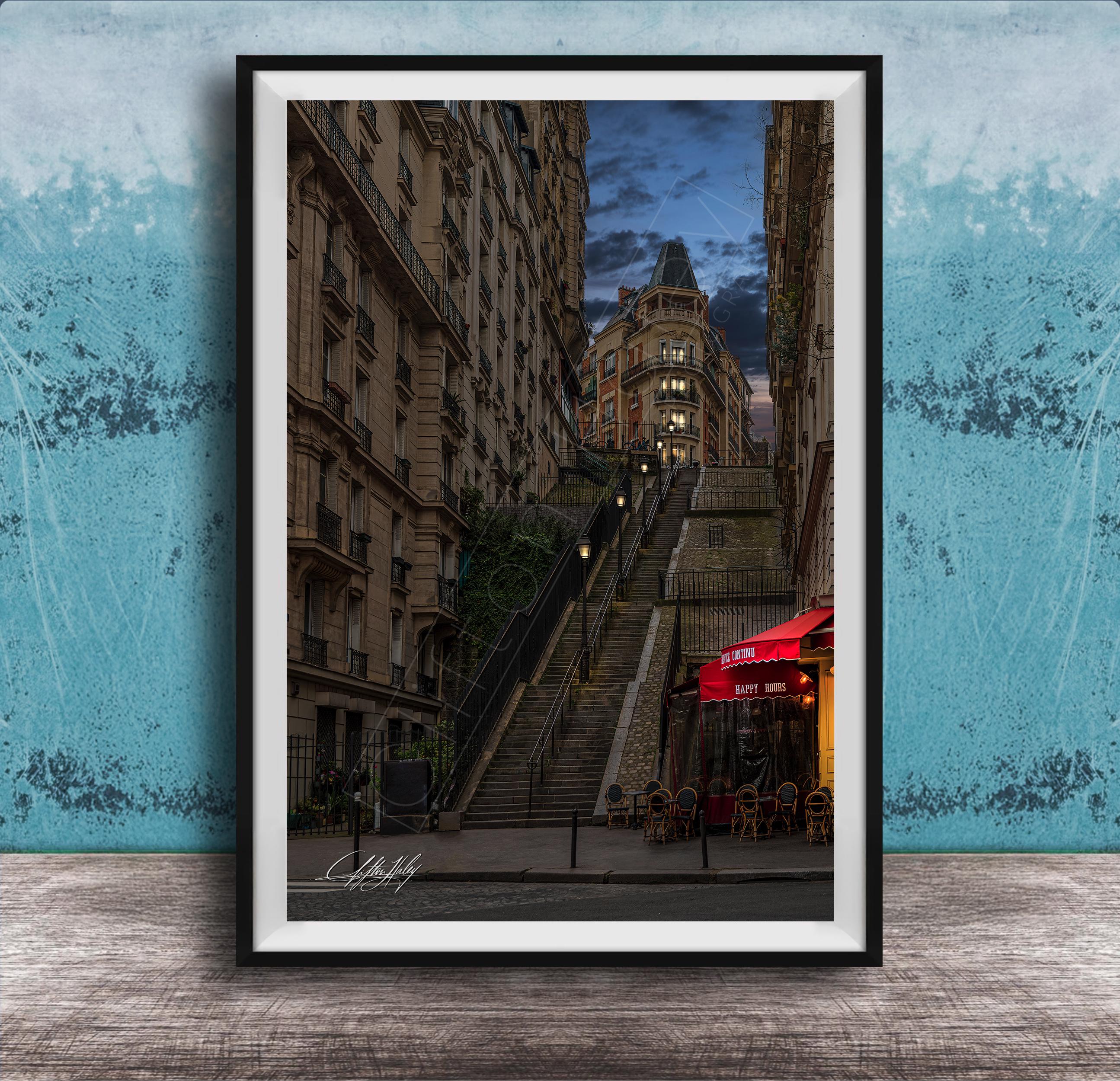 I arrived at La Halte Staircase just as the sun was setting over the city of Paris. The sky was awash with vibrant hues of orange and pink, and I couldn't wait to capture the beauty of this iconic landmark during the magical blue hour.