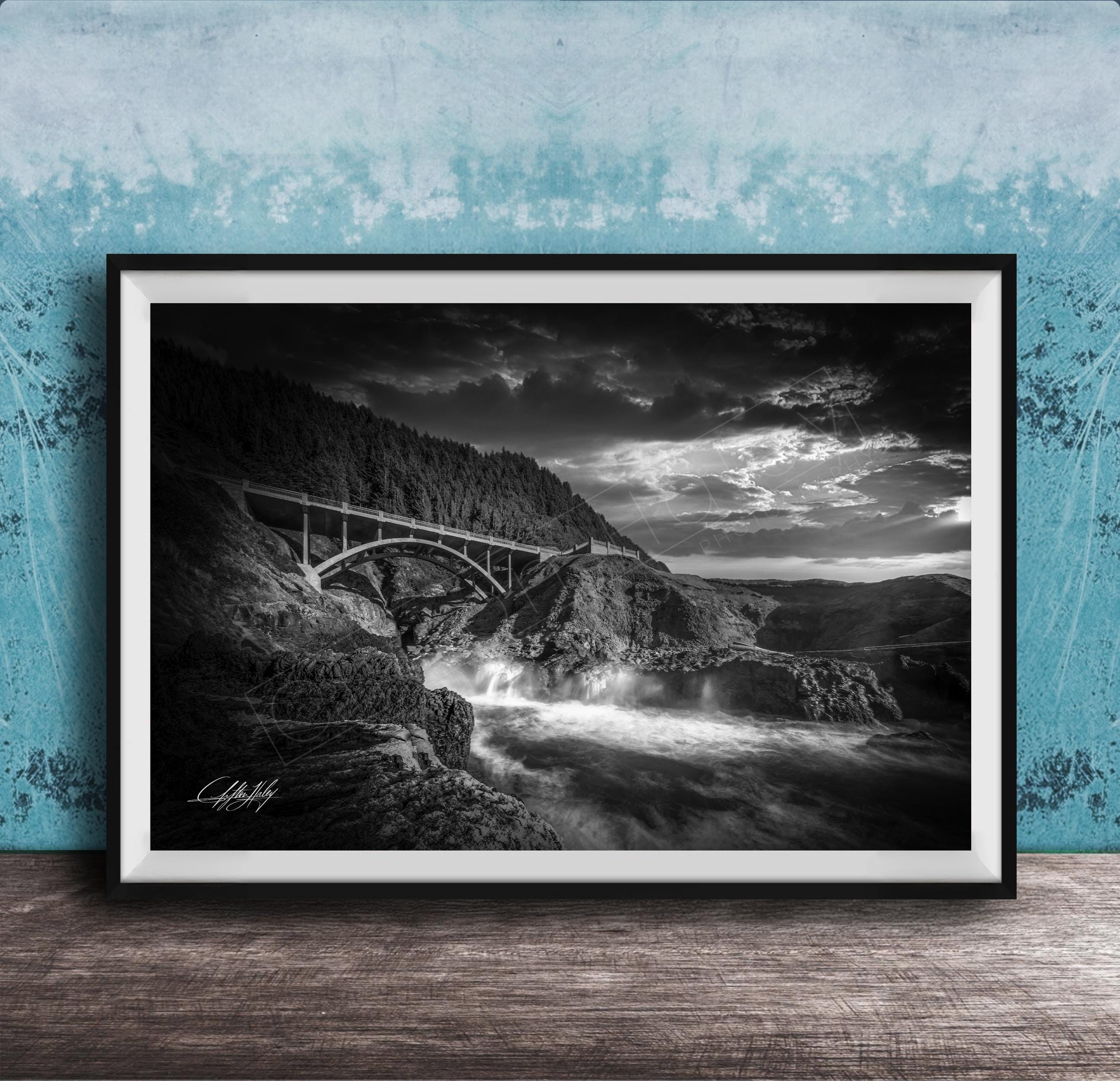 Experience the breathtaking Oregon coast with this Sprouting Horn and Yachats seascape art print, capturing sunrise and sunset moments over the ocean bridge view.