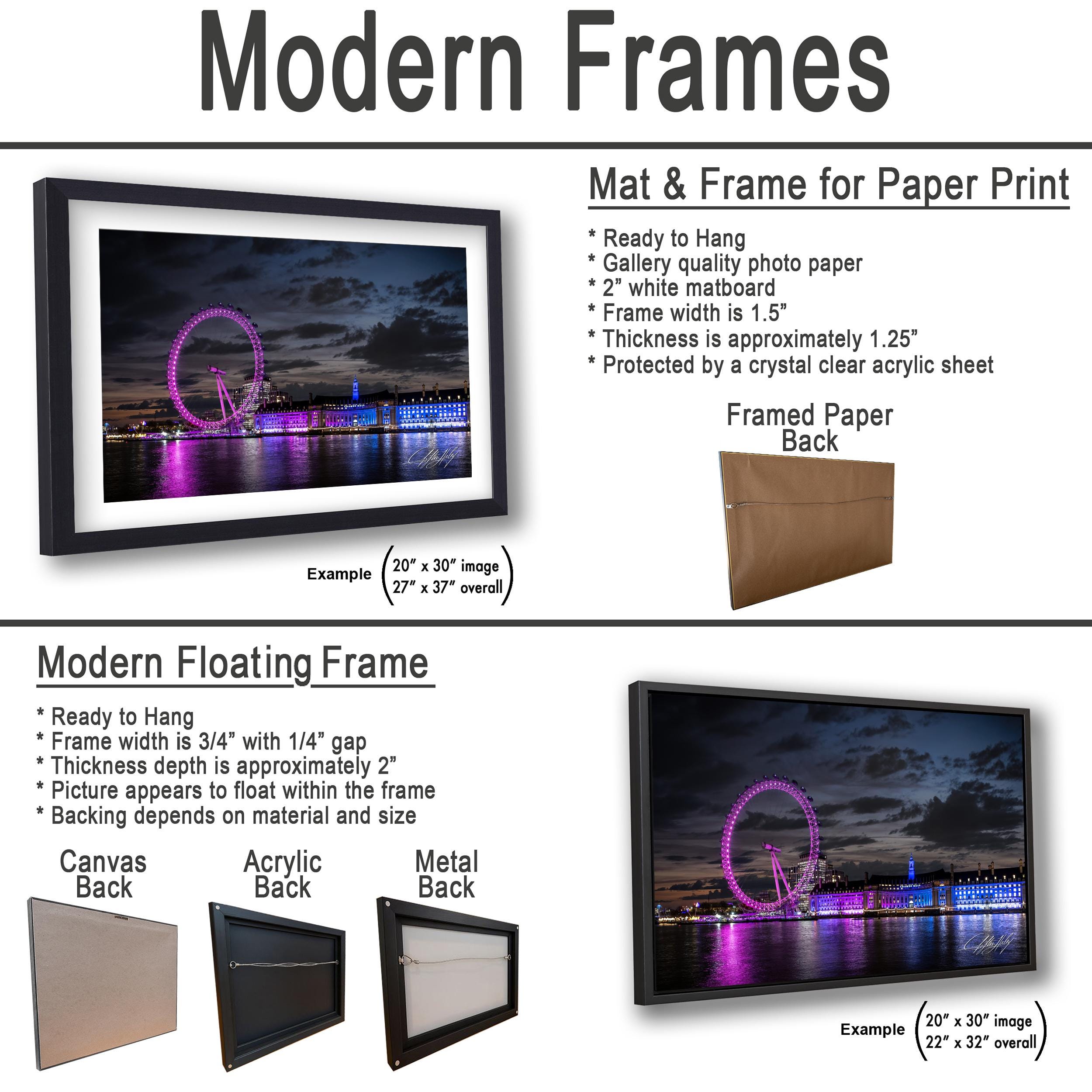 3.1) Only framed paper prints, acrylics and aluminum/metal prints will have a 2" white mat border. 3.2) Canvas prints will be a flush mounted (no mat border) to the frame.