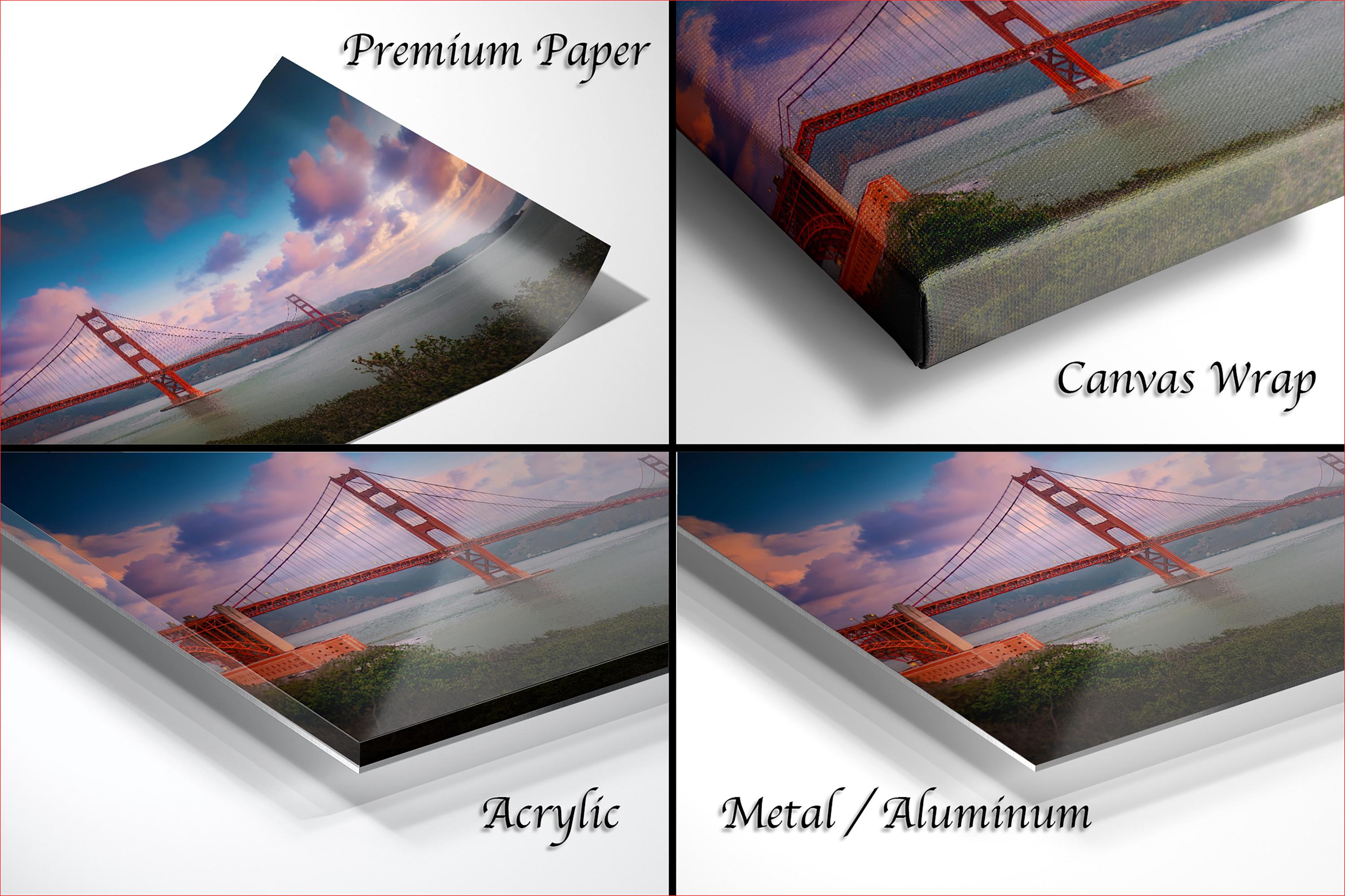 3.1) Only framed paper prints, acrylics and aluminum/metal prints will have a 2" white mat border. 3.2) Canvas prints will be a flush mounted (no mat border) to the frame.