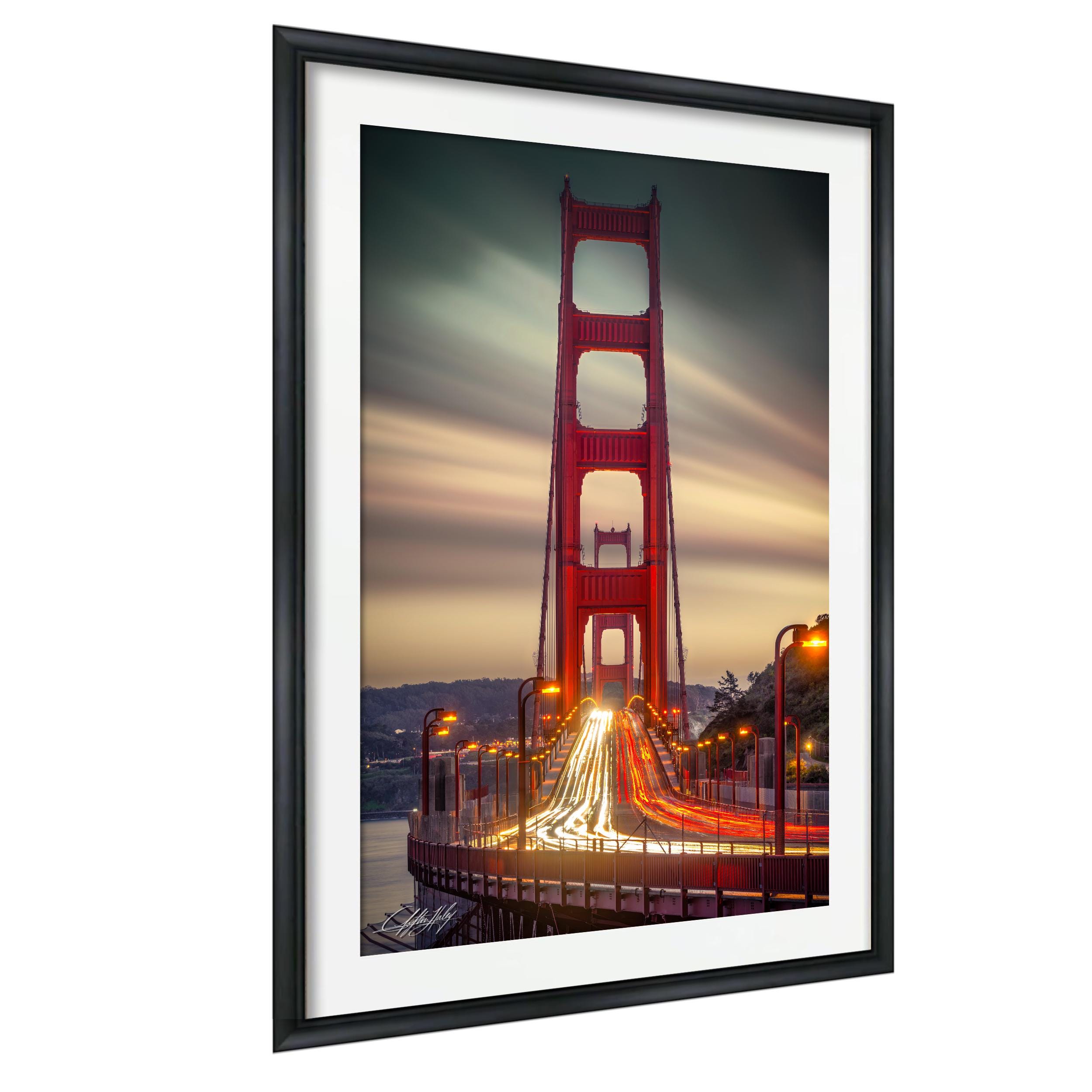 In the fierce dance of light and wind, could the Golden Gate Bridge reveal its true strength, standing as a sentinel between the wild sea and the serene sky? This travel poster print immortalizes that moment where nature and engineering meet in perfect harmony.