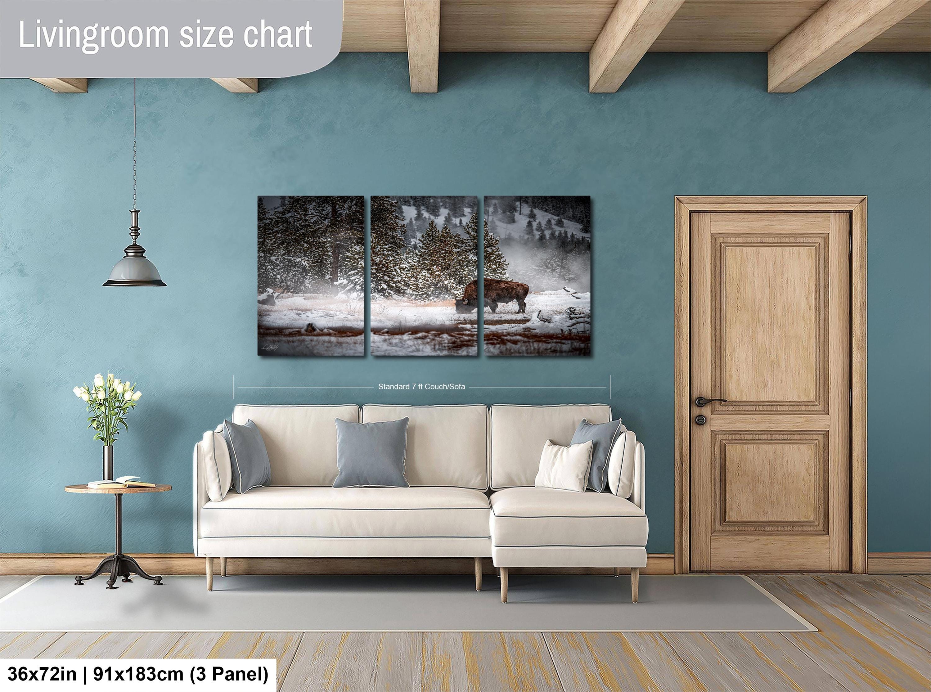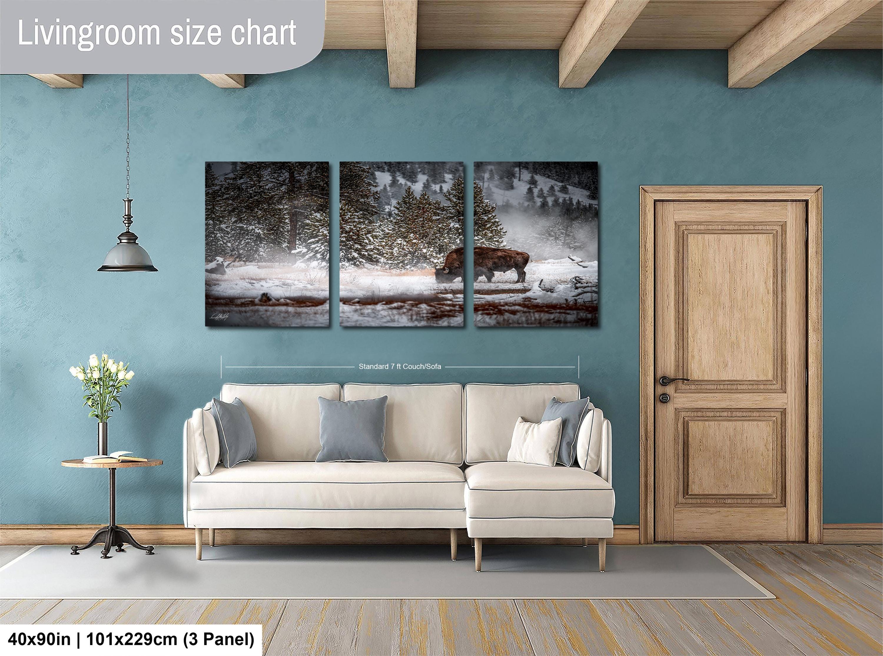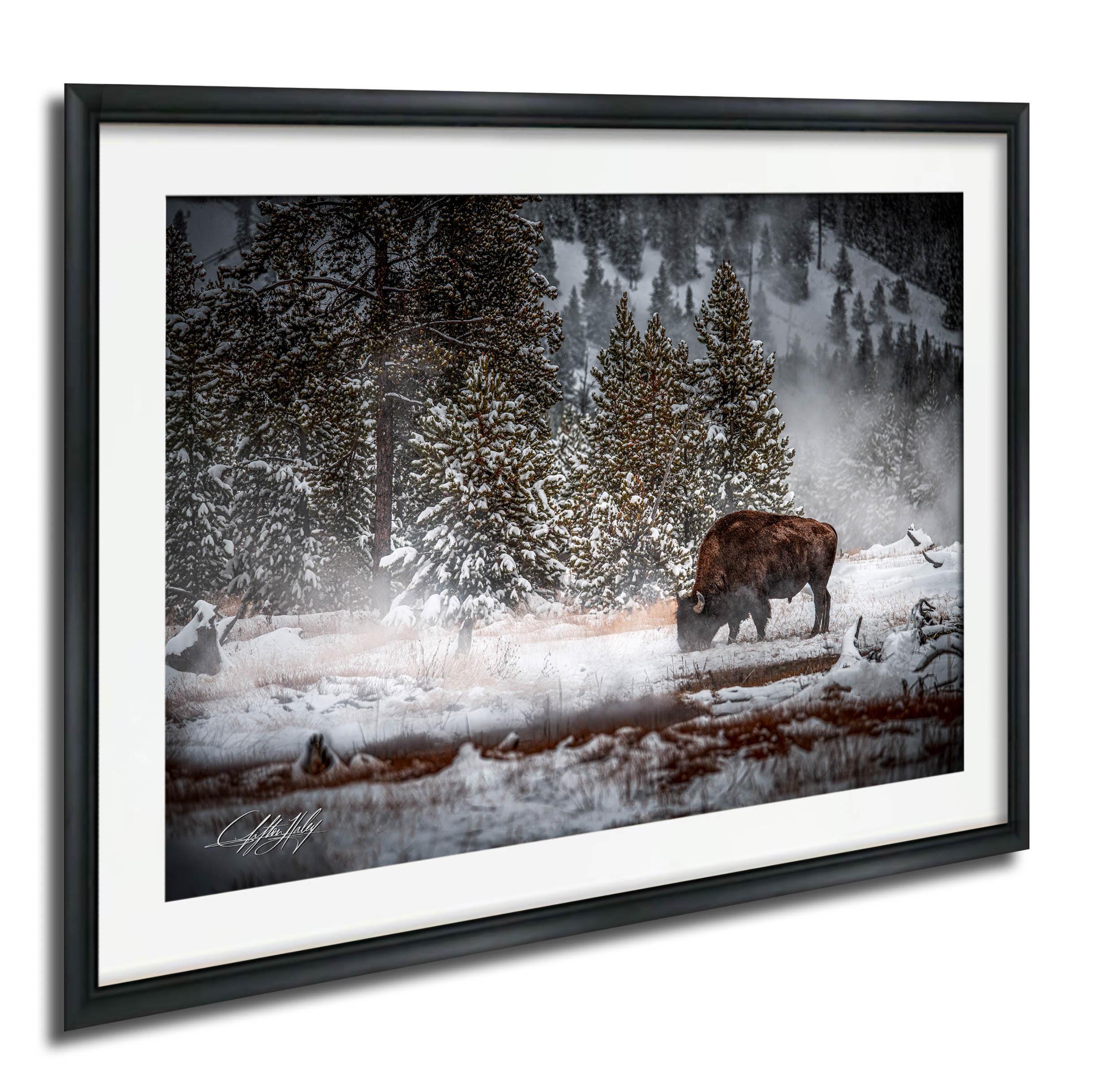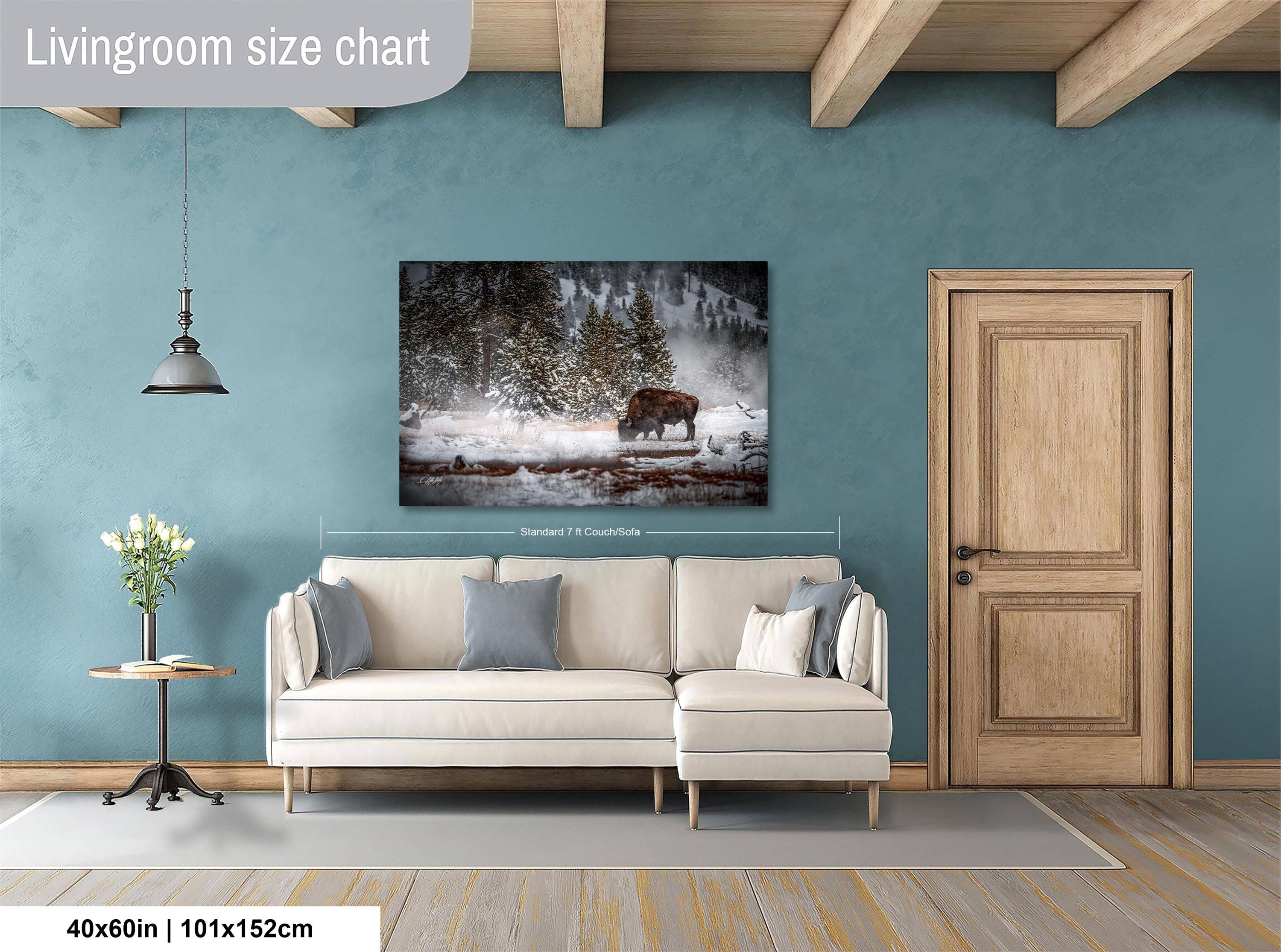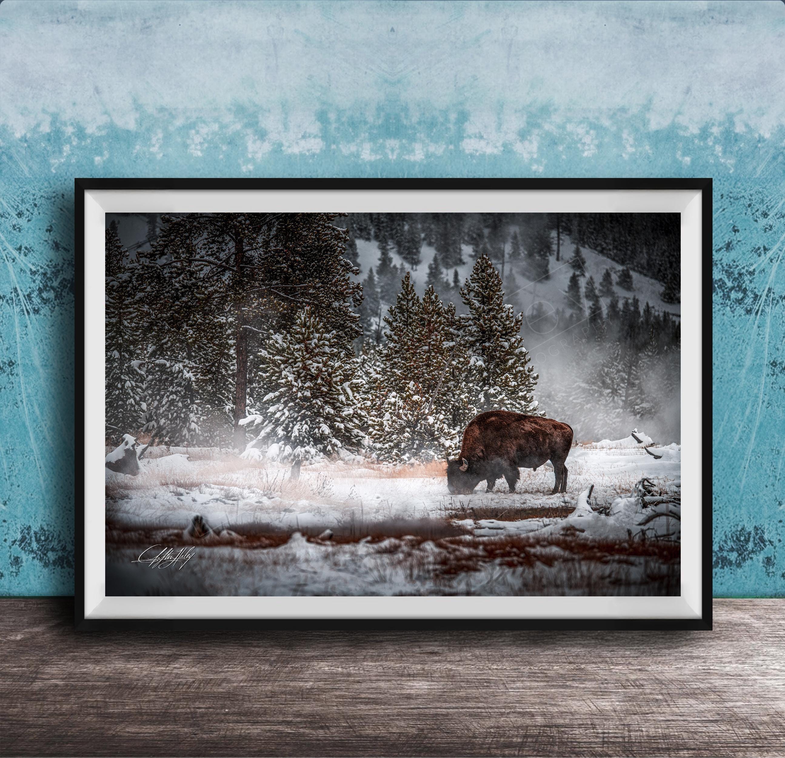 Discover stunning bison wall art featuring the majestic American bison in a Yellowstone snow landscape, perfect for rustic wildlife and nature-inspired home decor.