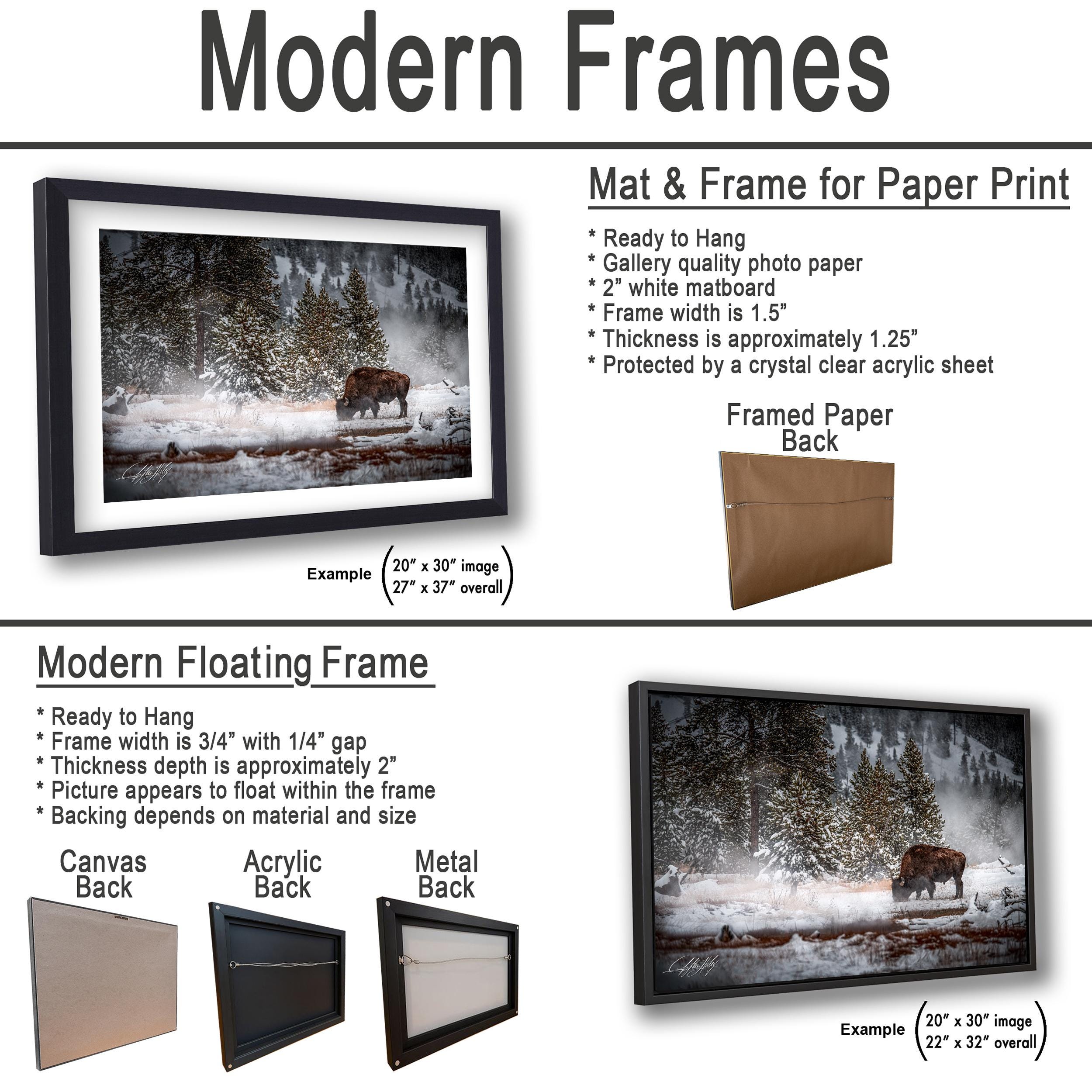 Please note: 1) We do not accept returns since each artwork is custom made, but damaged items will be replaced or exchanged promptly. 2) Framed paper prints, acrylics, and metal prints include a 2" white mat border; canvas prints do not.