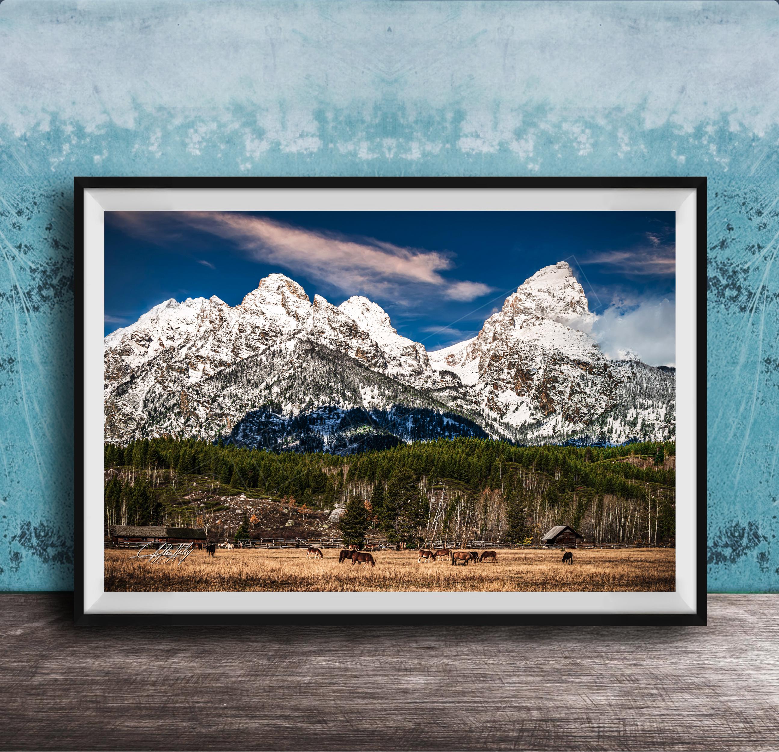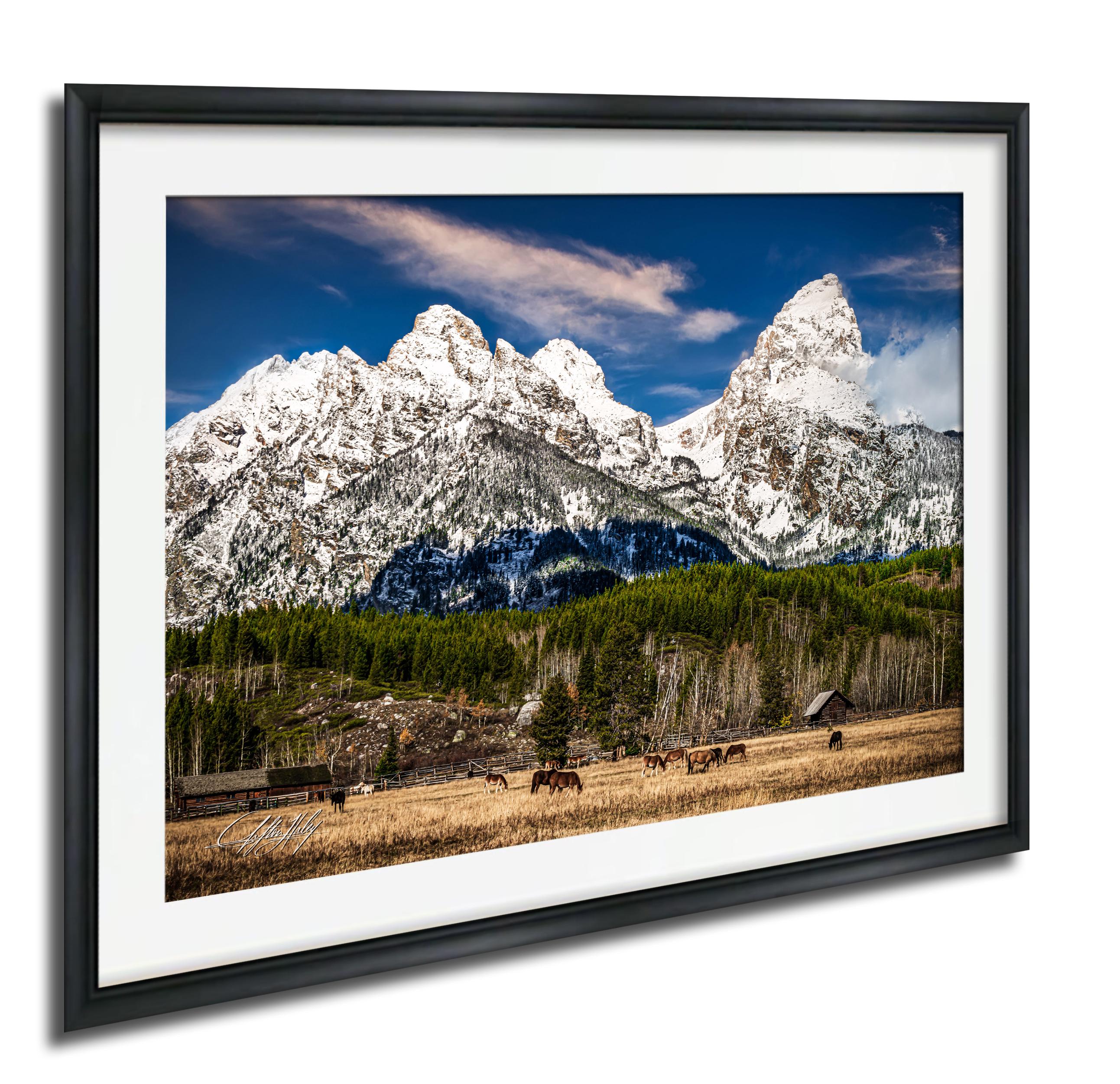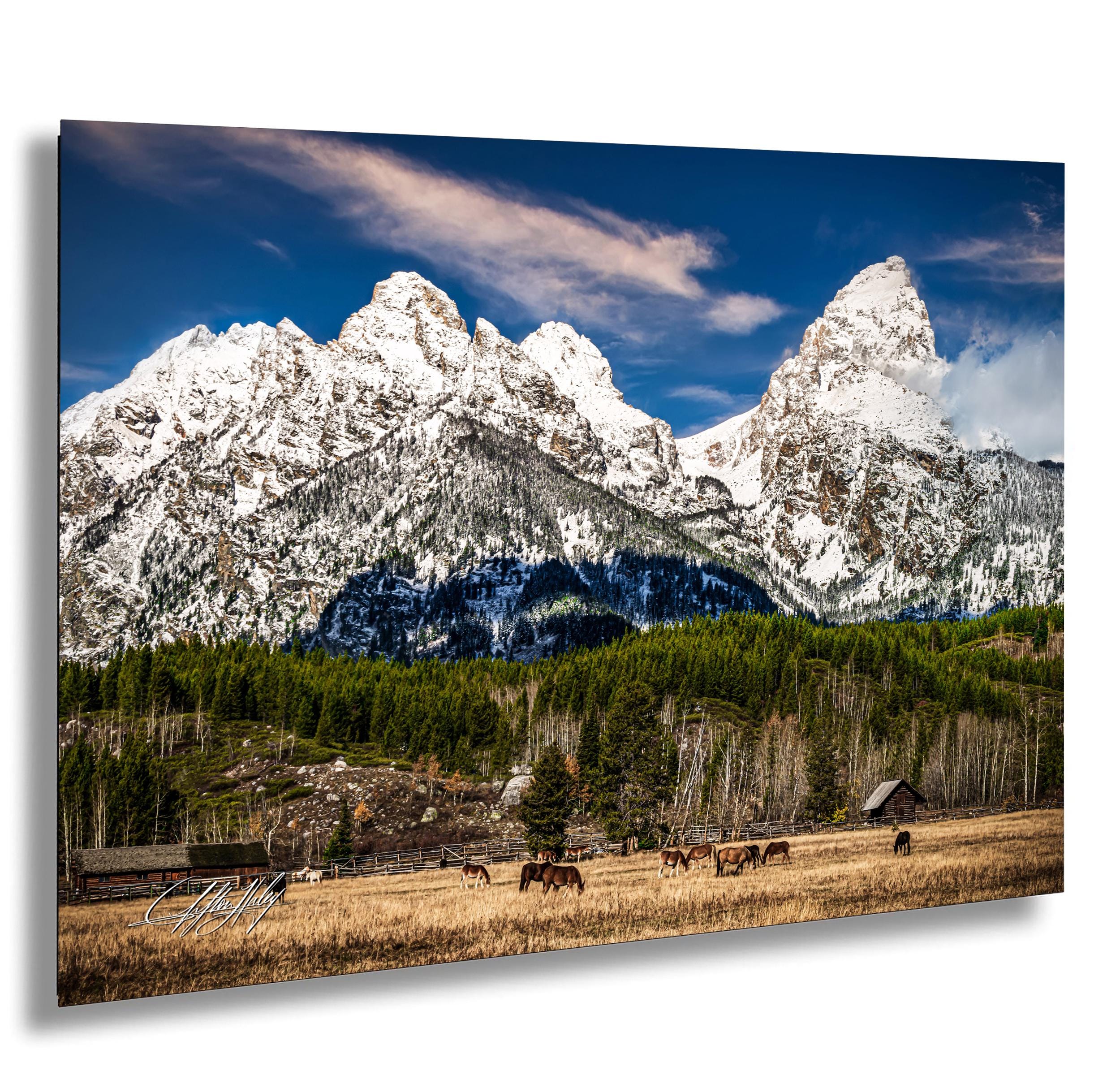 Dude Ranch Grand Teton prints invite you to bring the rugged charm of Wyoming’s cowboy country into your living space. This signed artwork beautifully captures wild horses roaming freely beneath the iconic Grand Tetons, showcasing rustic western decor at its finest.