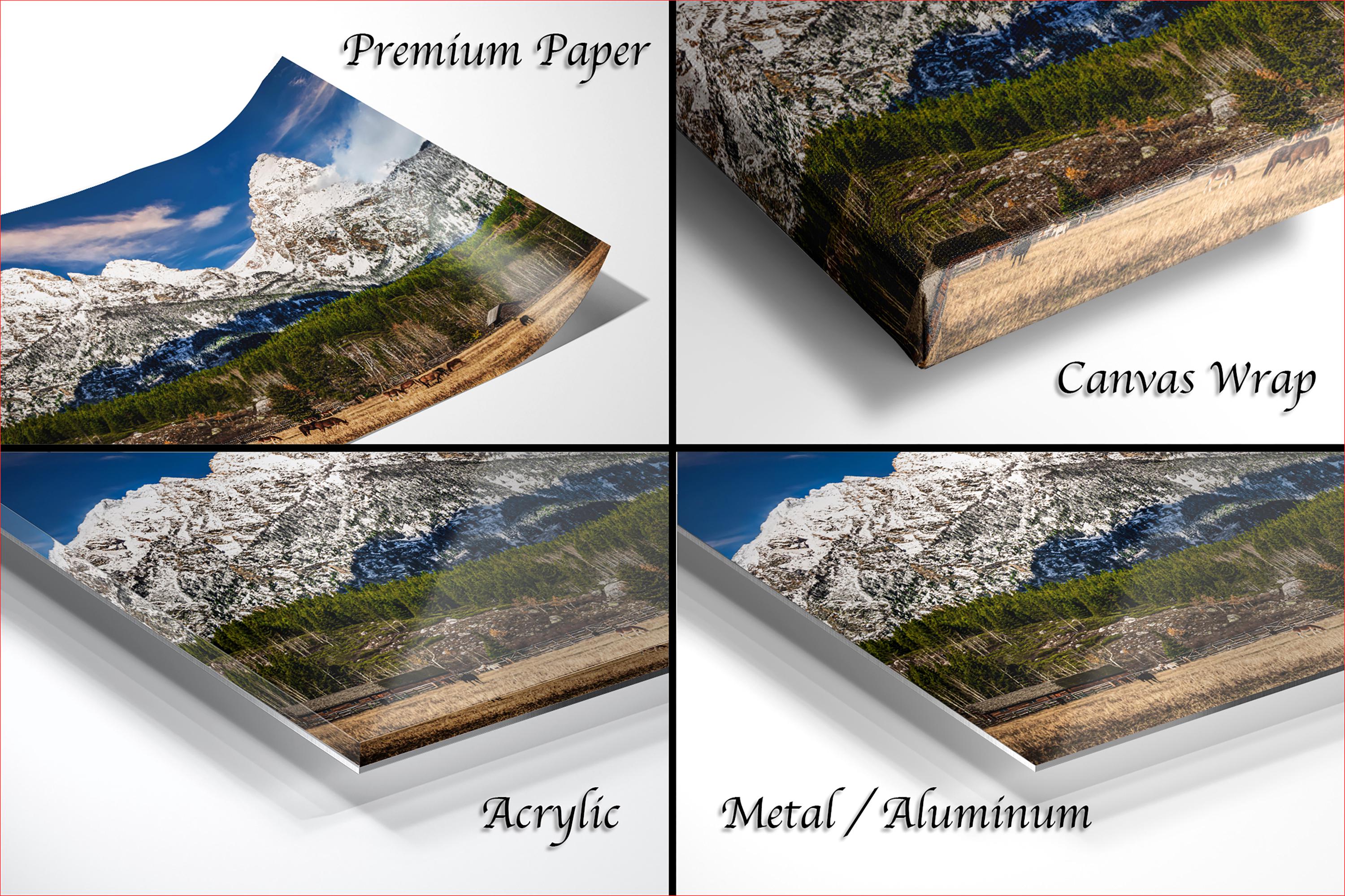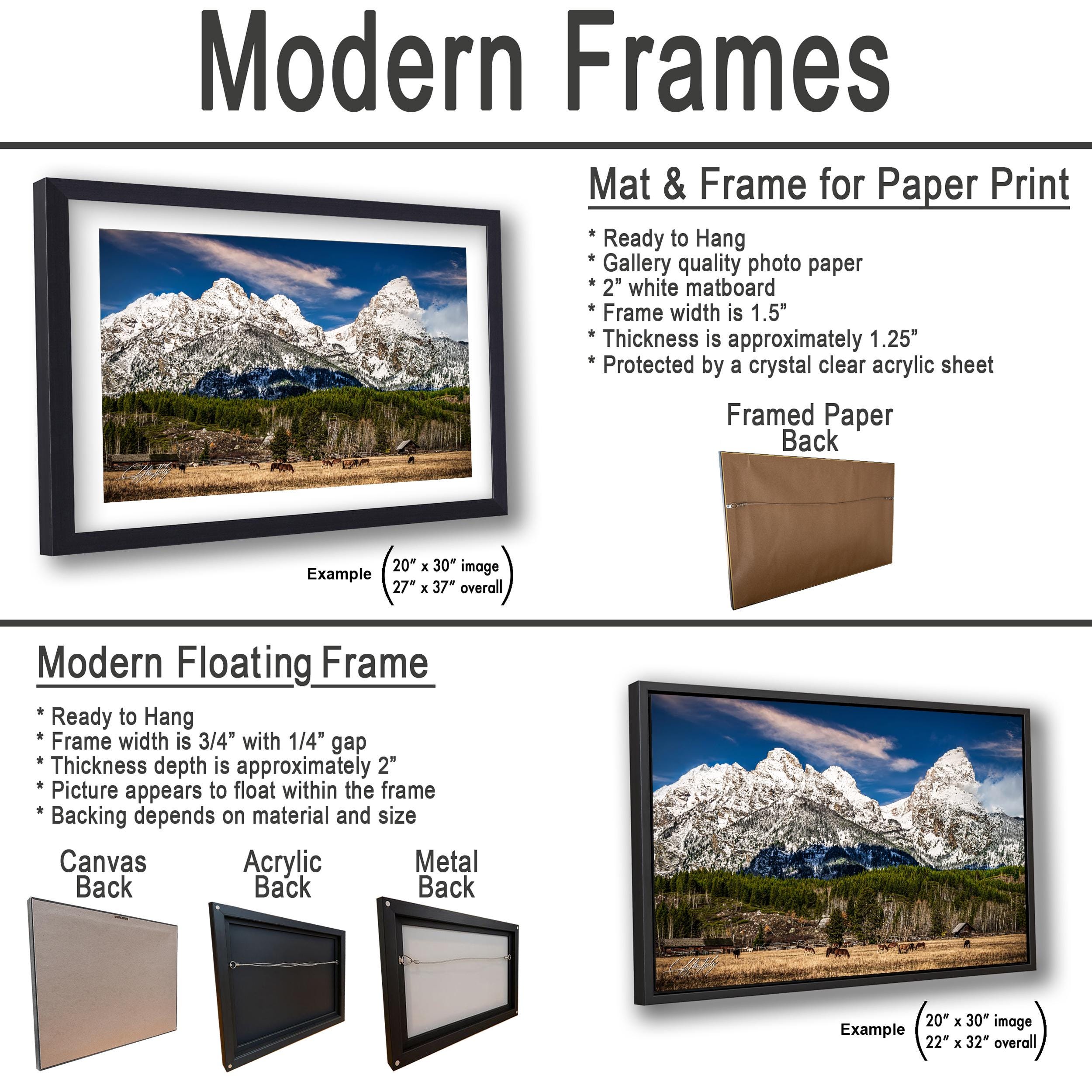 1. Choose from framed paper prints, acrylics, or aluminum/metal options, all featuring a 2" white mat border. 2. Canvas prints are flush mounted to the frame without a mat border for a sleek look. 3. We carefully package each piece to protect your artwork; if it arrives damaged or unsatisfactory, exchanges or replacements are available.