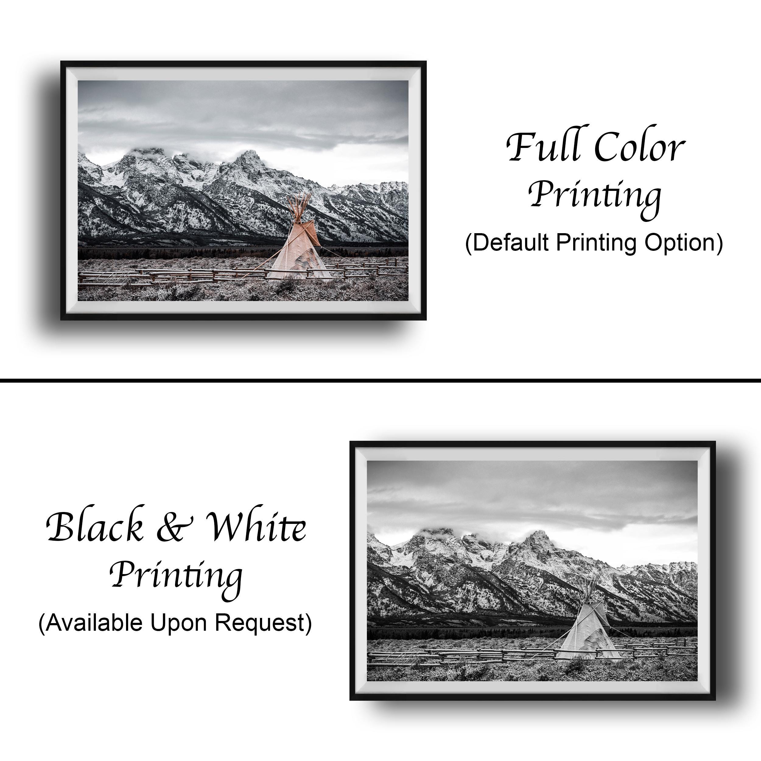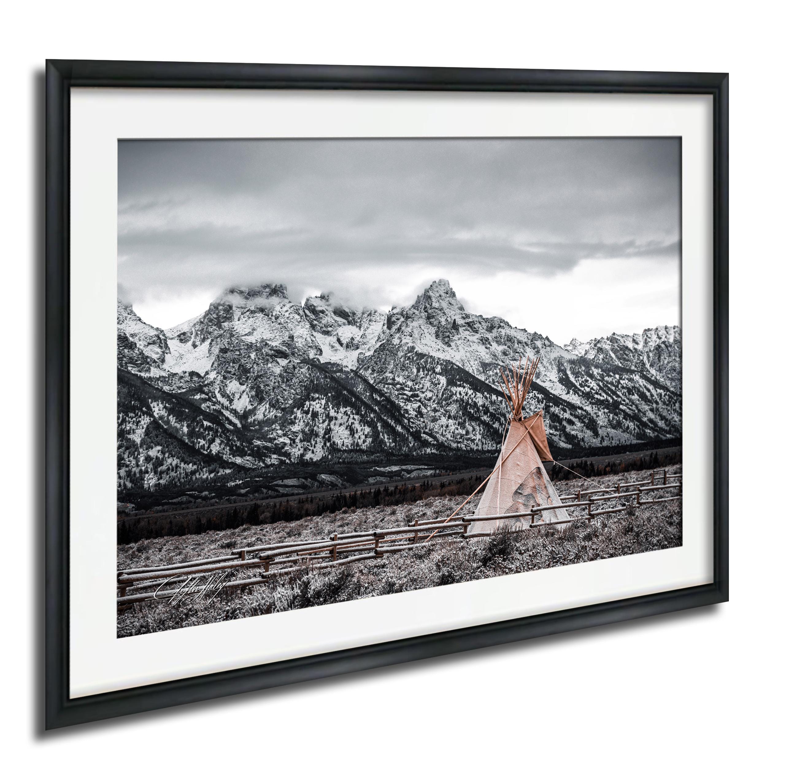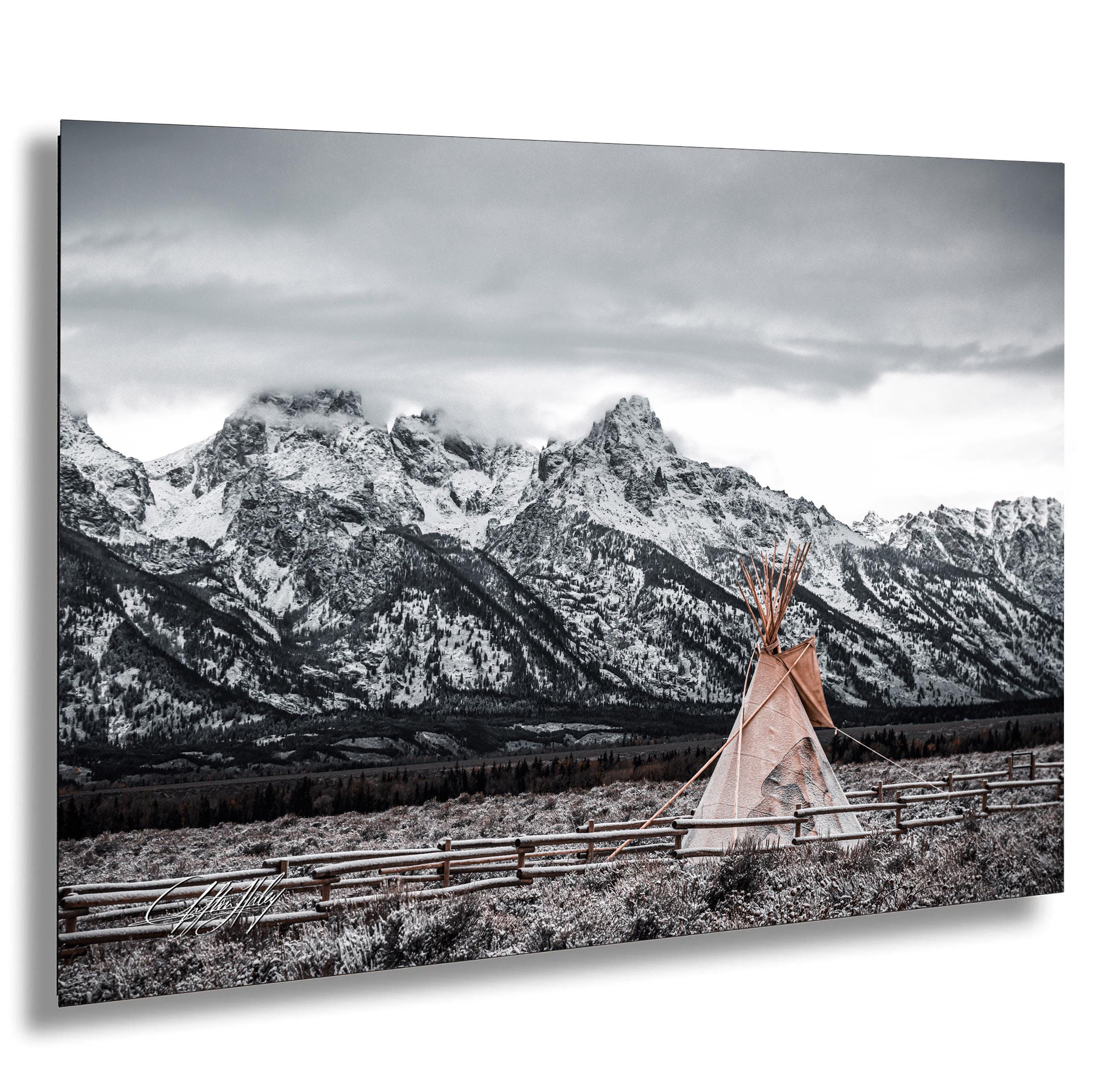 This fine art print showcases a stunning view of the Tetons, framed by a traditional teepee in the foreground, blending natural splendor with rich Native American history. Each piece is made-to-order, ensuring your artwork is unique and personalized. The artist’s signature authenticates every print, adding a special touch to your home or office decor.