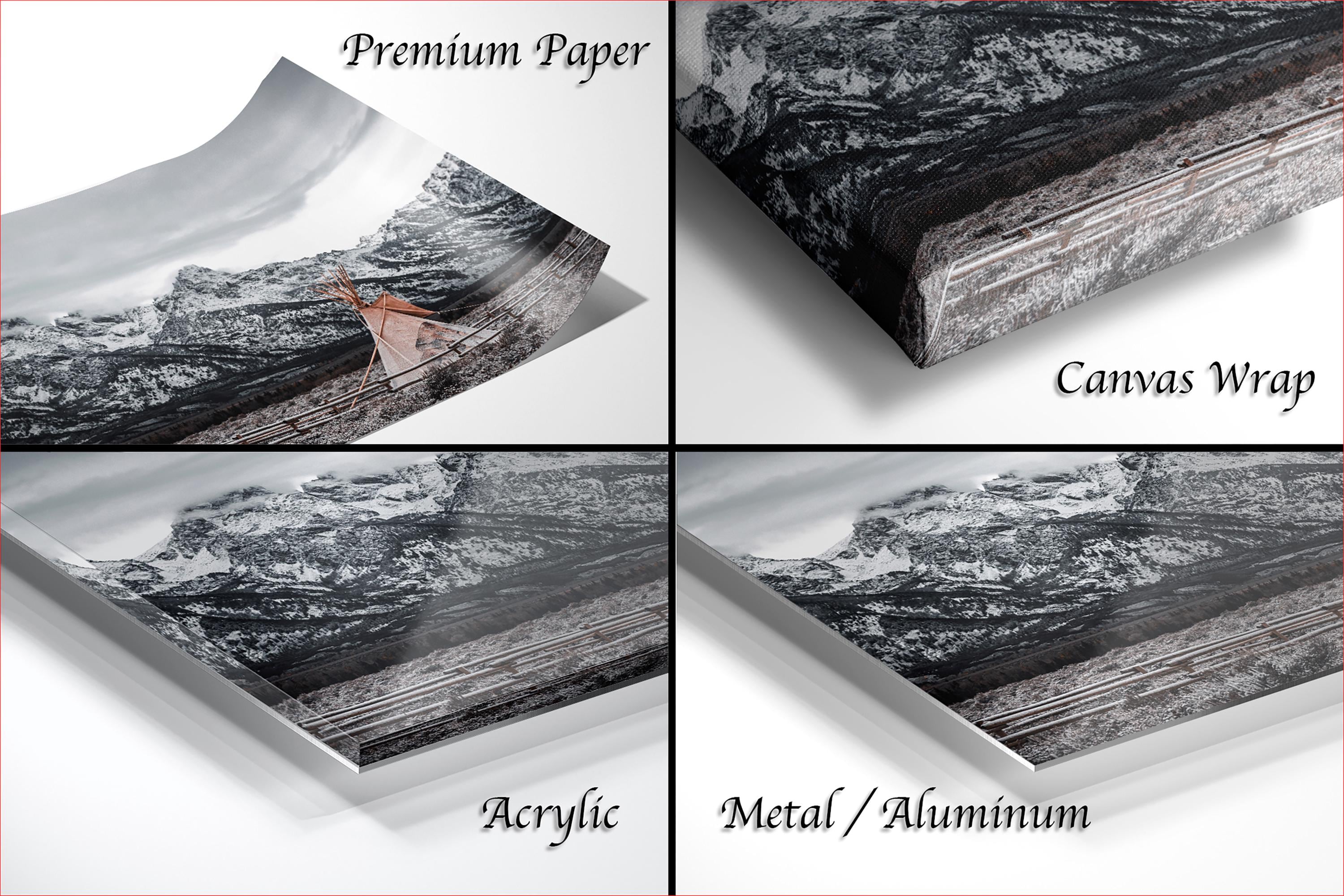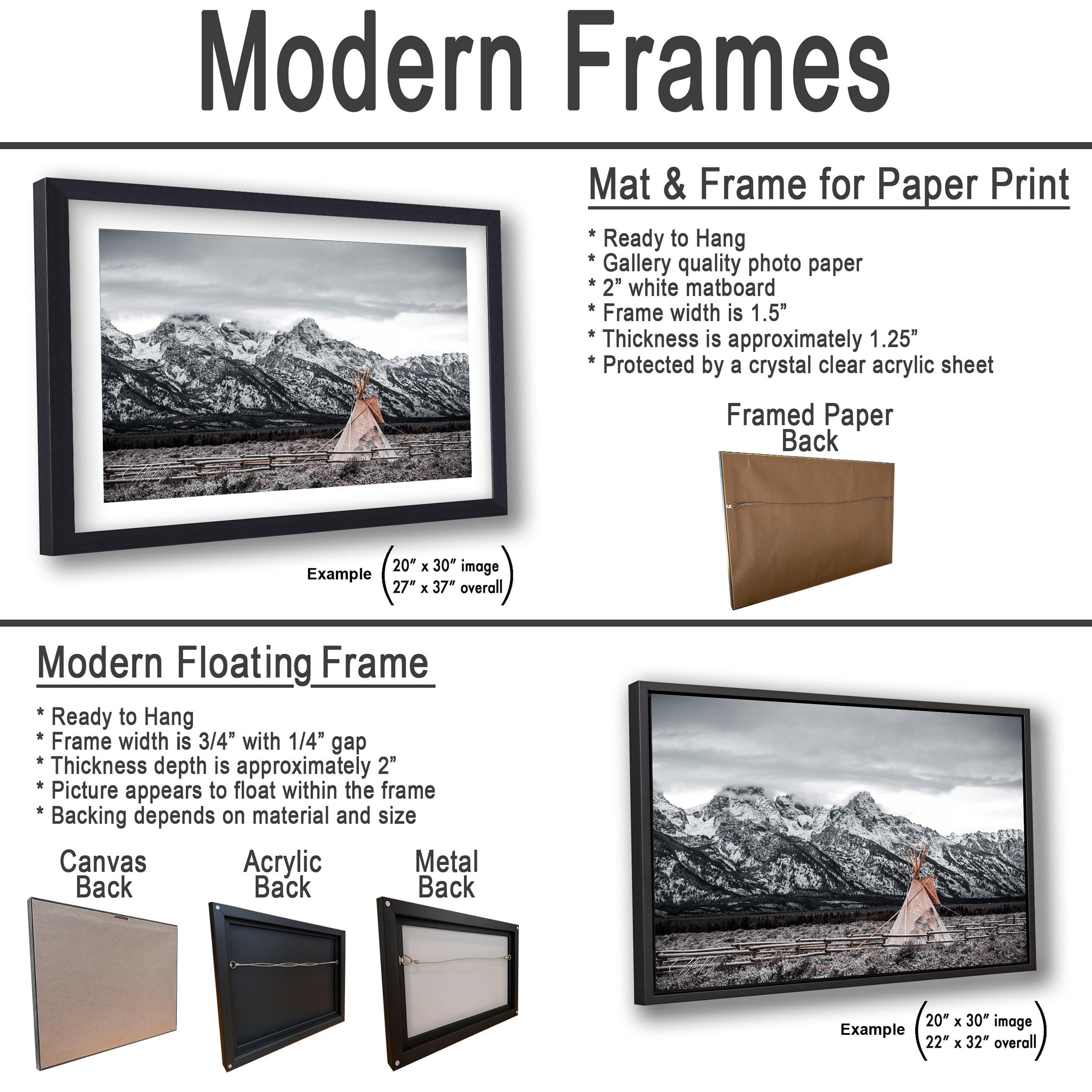 • Dimensions and material options include framed paper prints with a 2" white mat border, acrylics, aluminum/metal prints, and canvas prints with flush mounting. • Crafted from high-quality materials for vibrant colors and lasting durability. • Perfect for lovers of Wyoming travel, mountain landscapes, wildlife scenes, and cultural heritage.