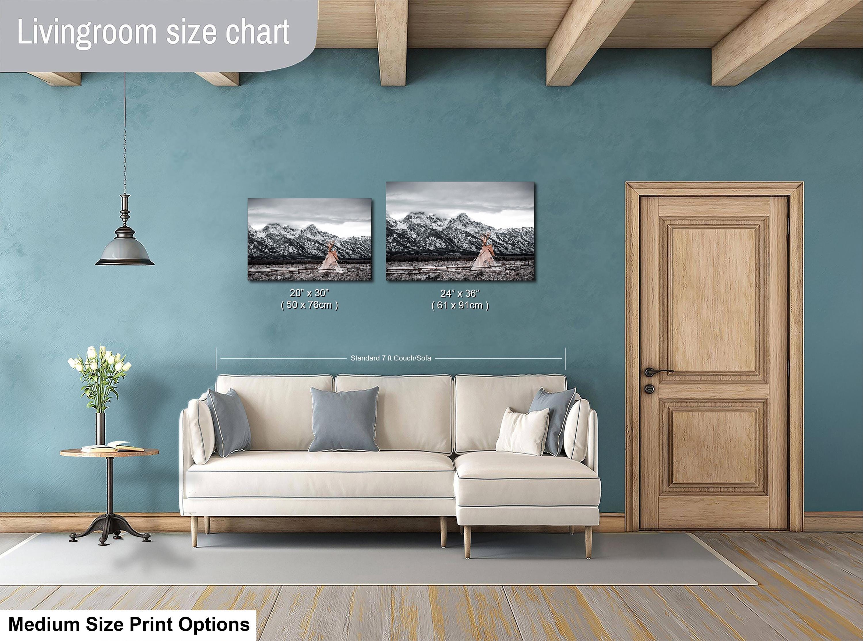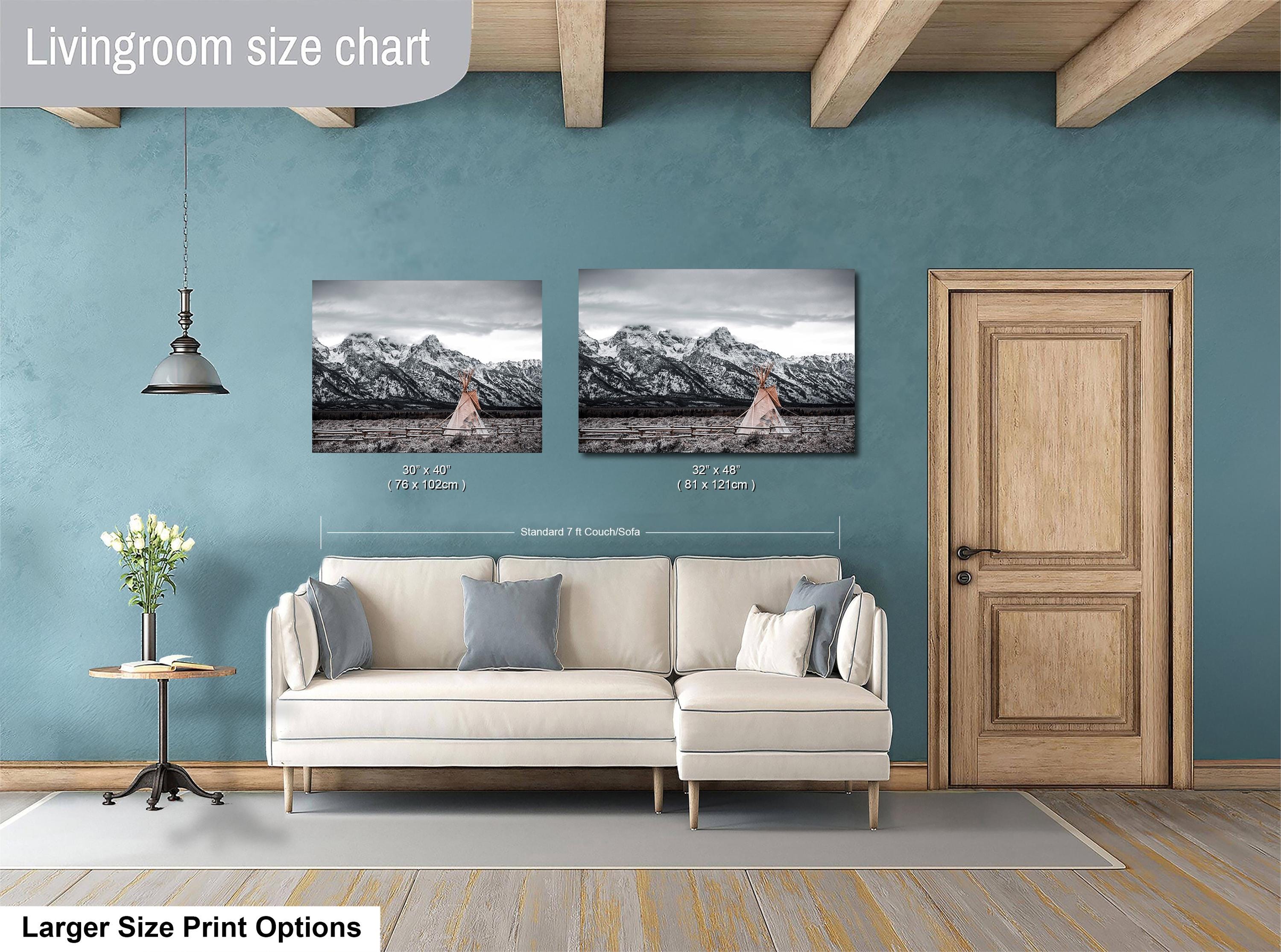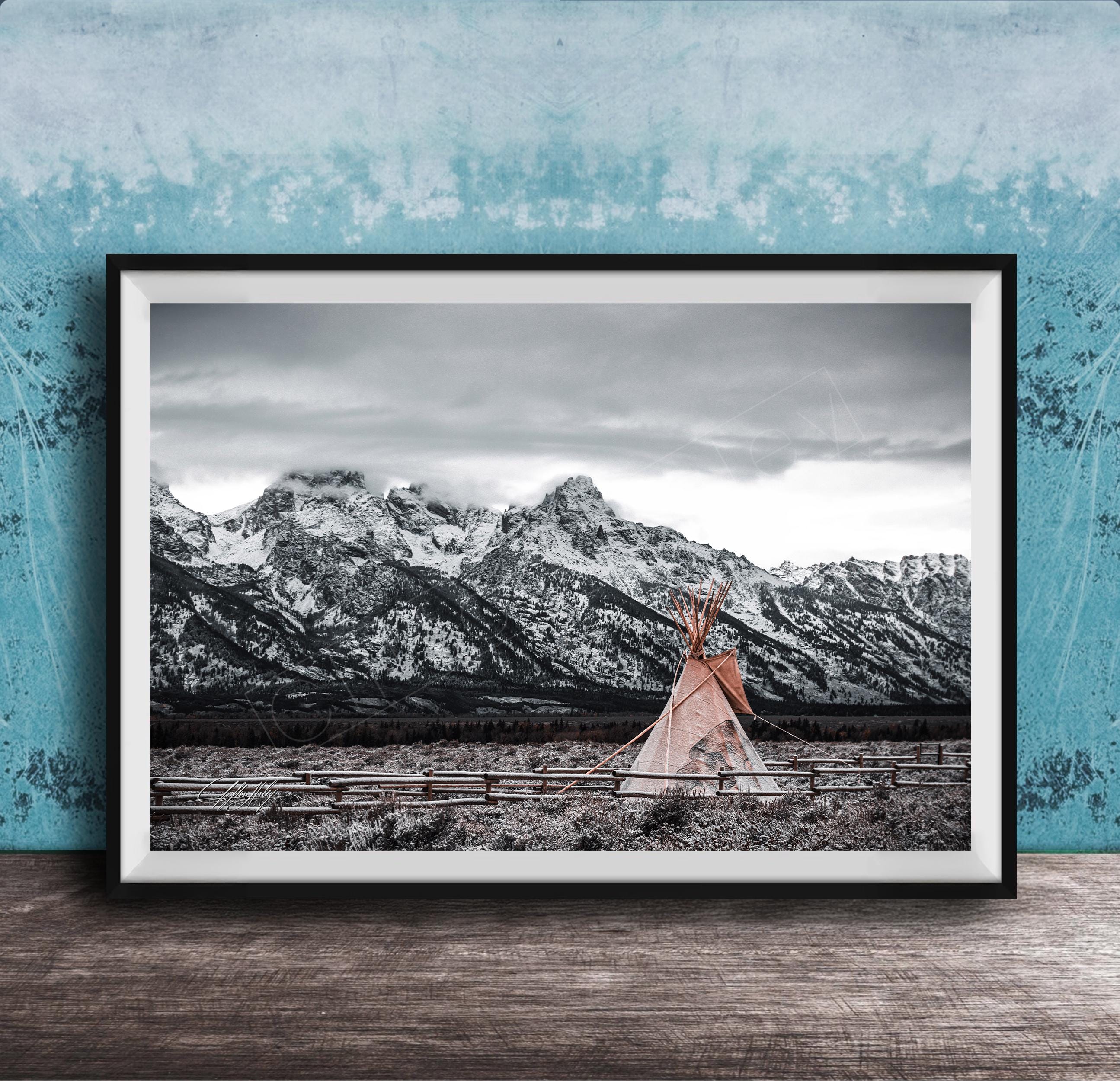 Experience the breathtaking Rocky Mountains and Grand Teton National Park with this scenic teepee landscape art print, capturing Wyoming's majestic beauty.