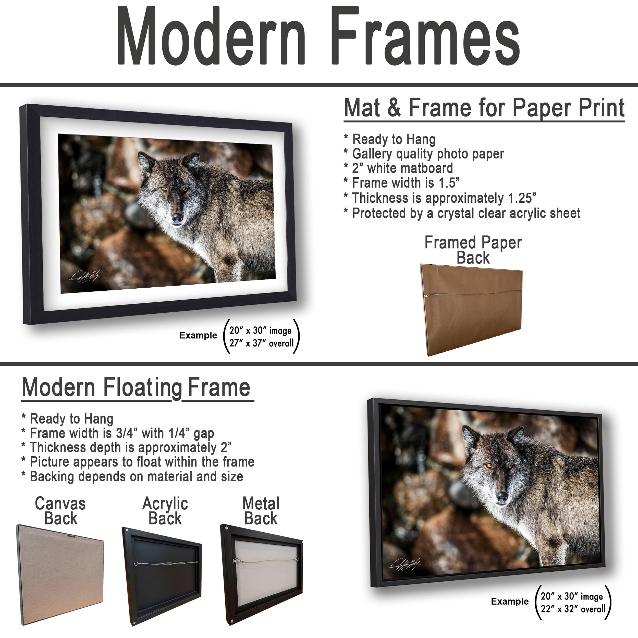 3.1) Only framed paper prints, acrylics and aluminum/metal prints will have a 2" white mat border. 3.2) Canvas prints will be a flush mounted (no mat border) to the frame.