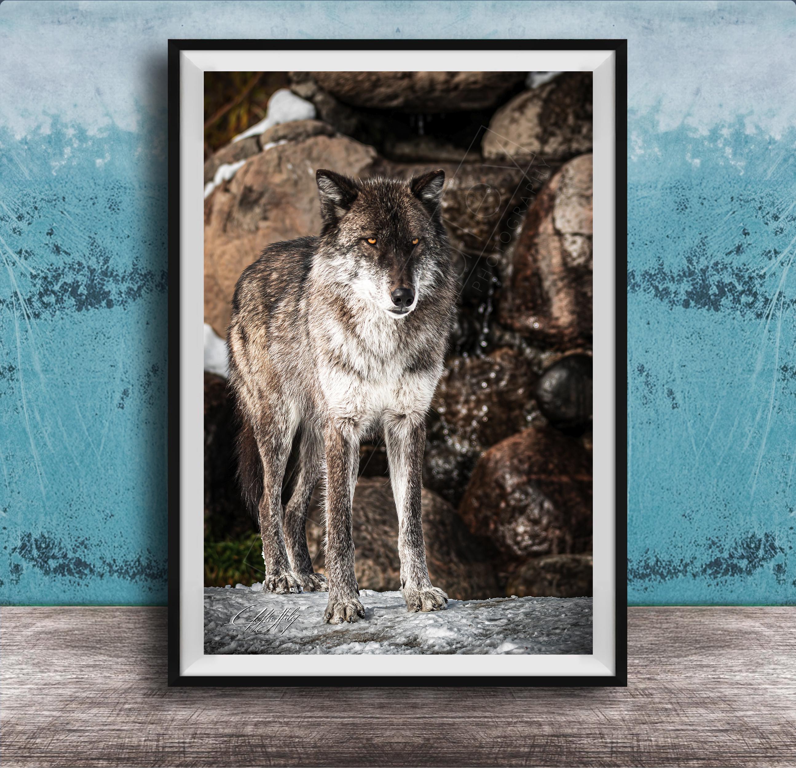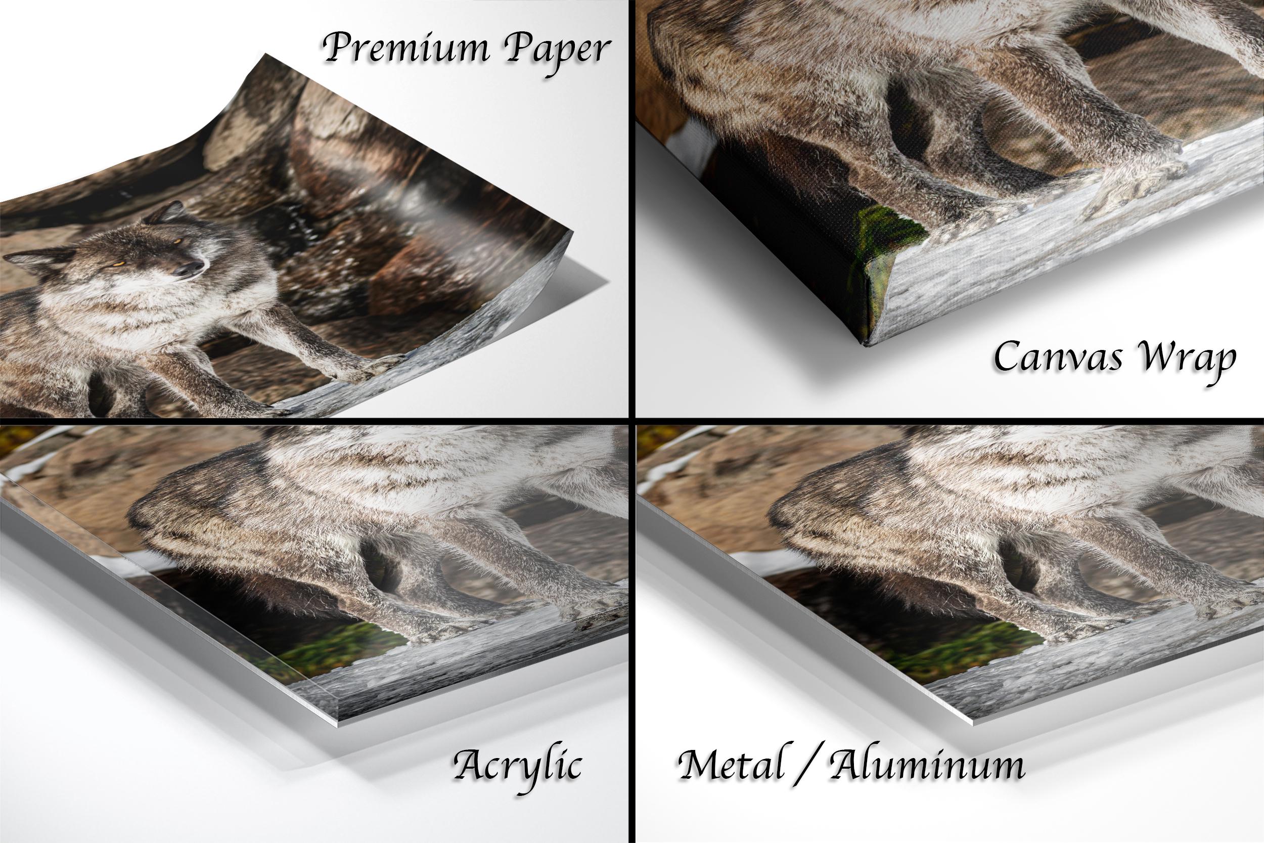 Immerse yourself in this stunning gray wolf canvas print, featuring wildlife photography and mountain landscape elements that bring outdoor wall art to life. This Gray Wolf Art Print captures the majestic spirit of wolves in their natural habitat, set against the breathtaking Grand Teton scenery.