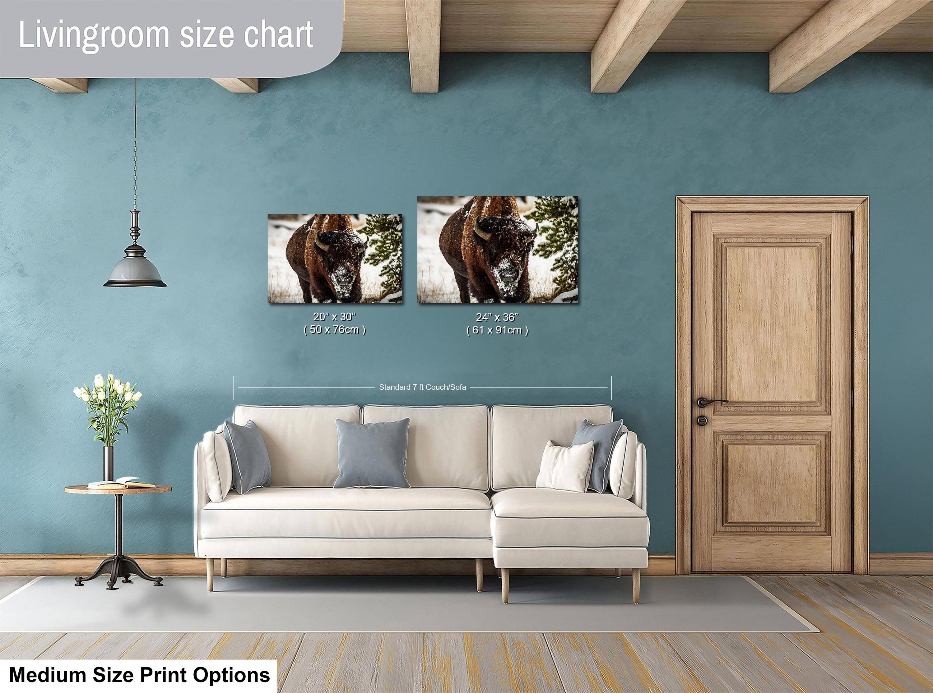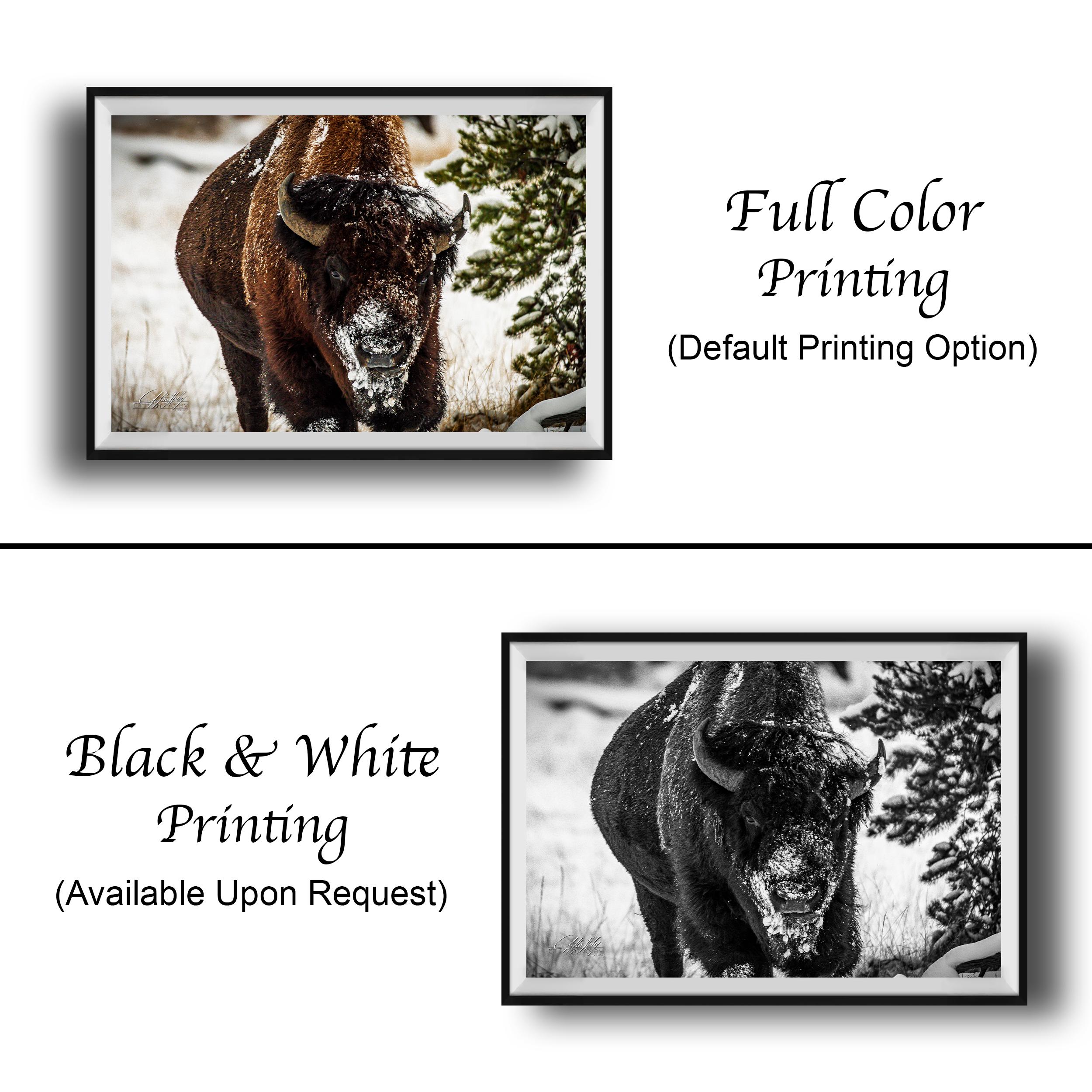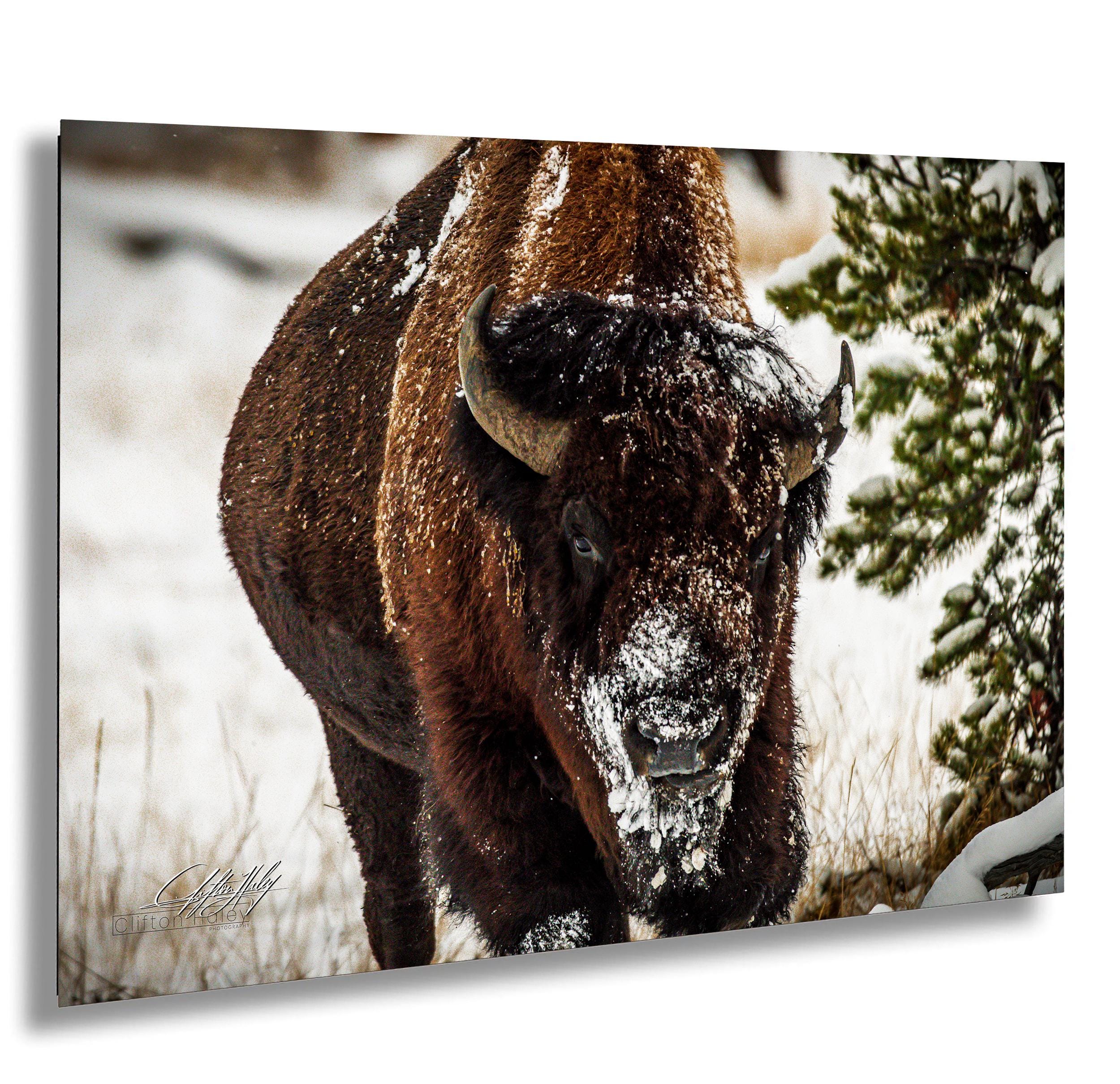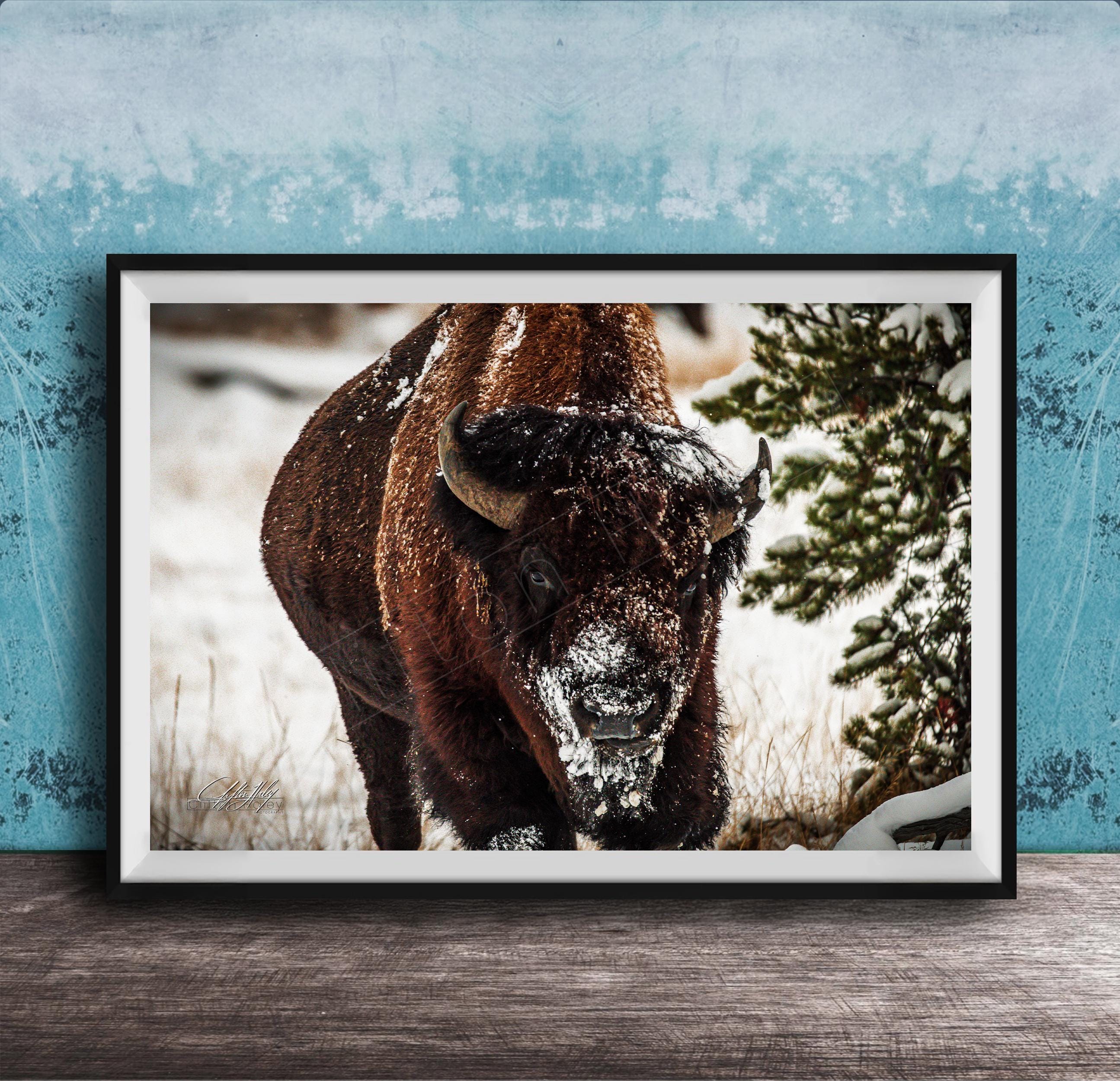 Bring the serene beauty of a snowy winter wilderness into your home with this evocative artwork that celebrates the power and grace of bison in their frigid winter environment.
