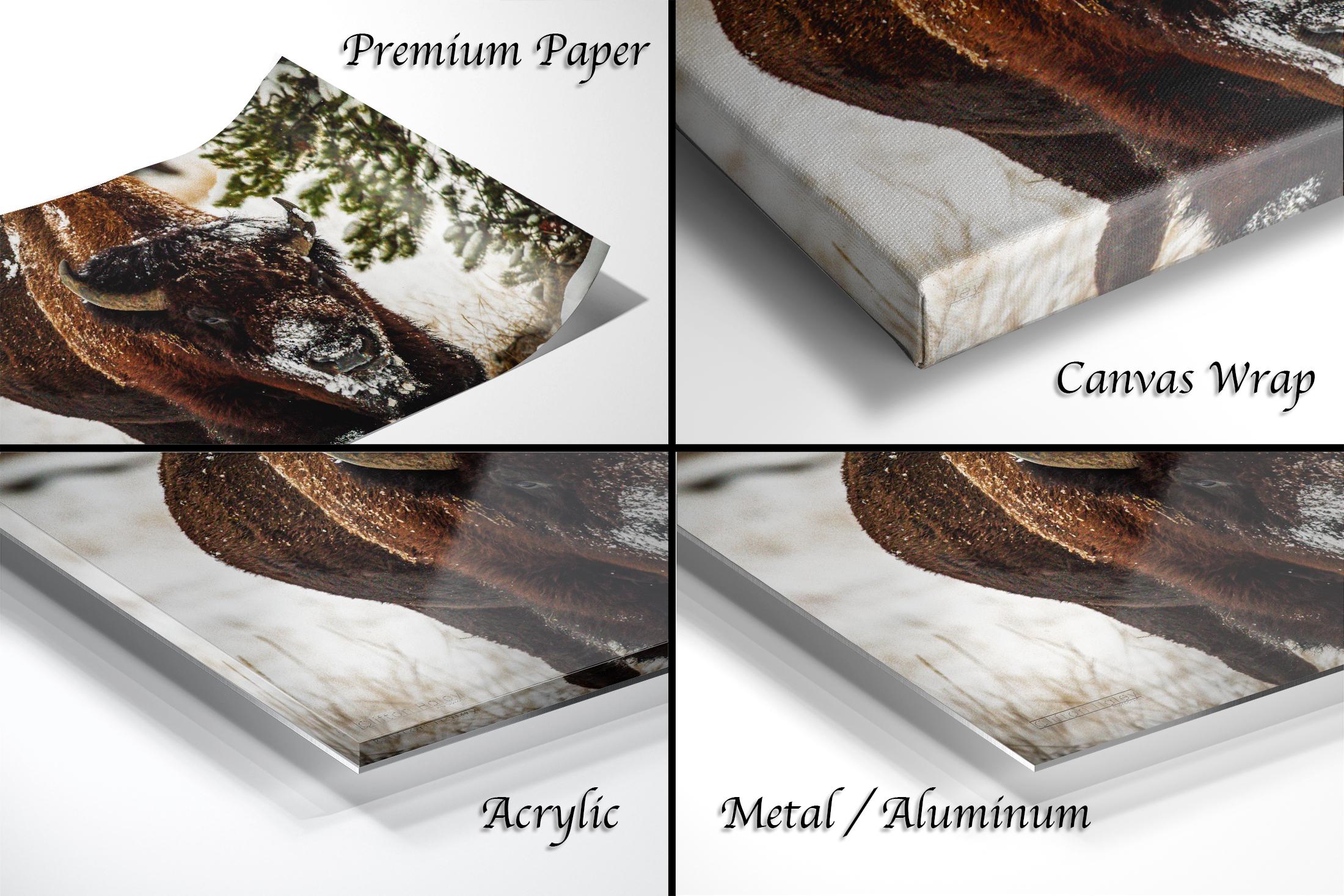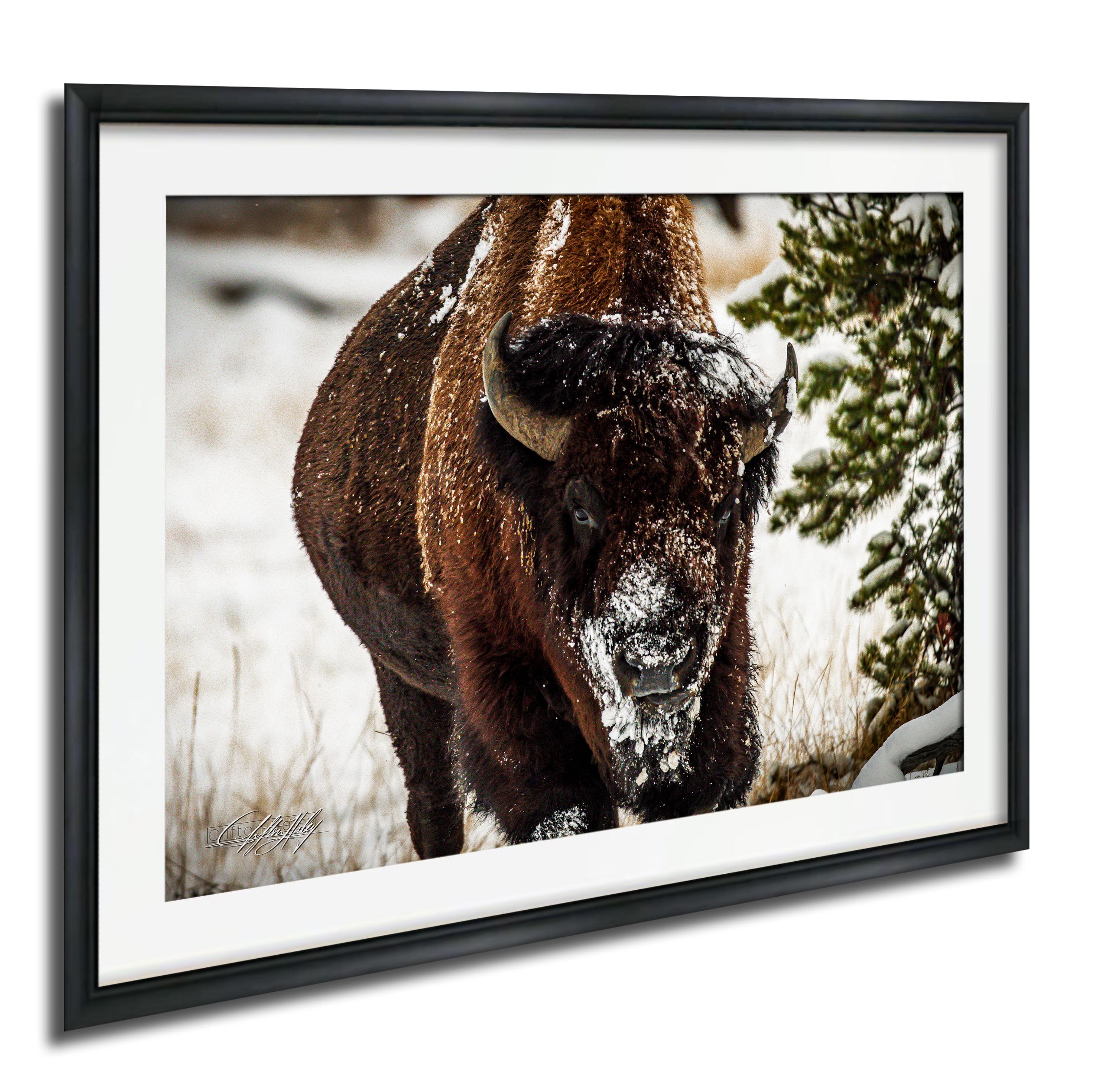 This stunning fine art print captures a majestic bison or buffalo in snow on the frozen plains, set against a breathtaking winter landscape scene. The cold and crisp air and the snow blanket create a frigid winter scene where these mussed masses of fur search for food, exhaling breath that swirls in the golden light.