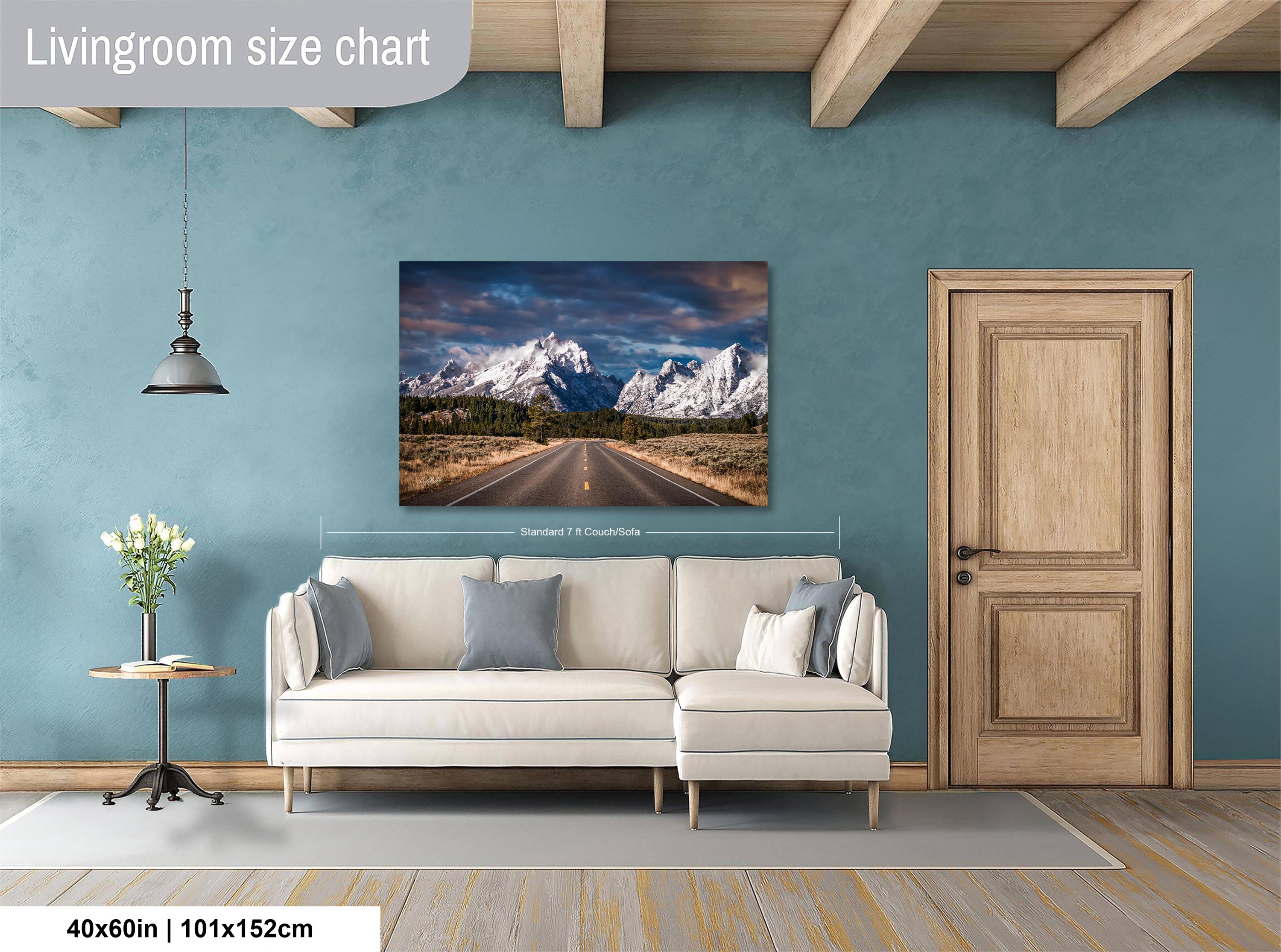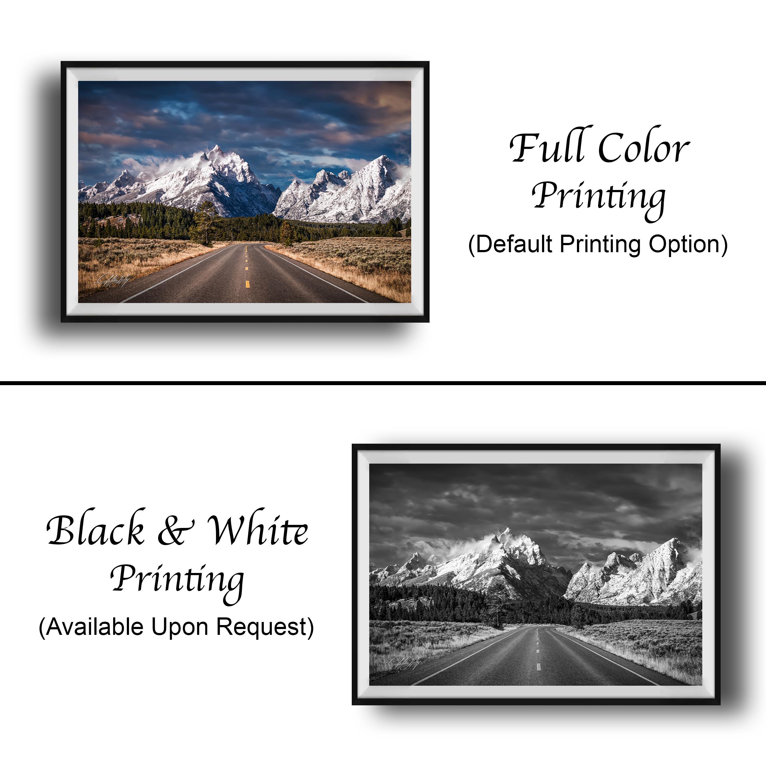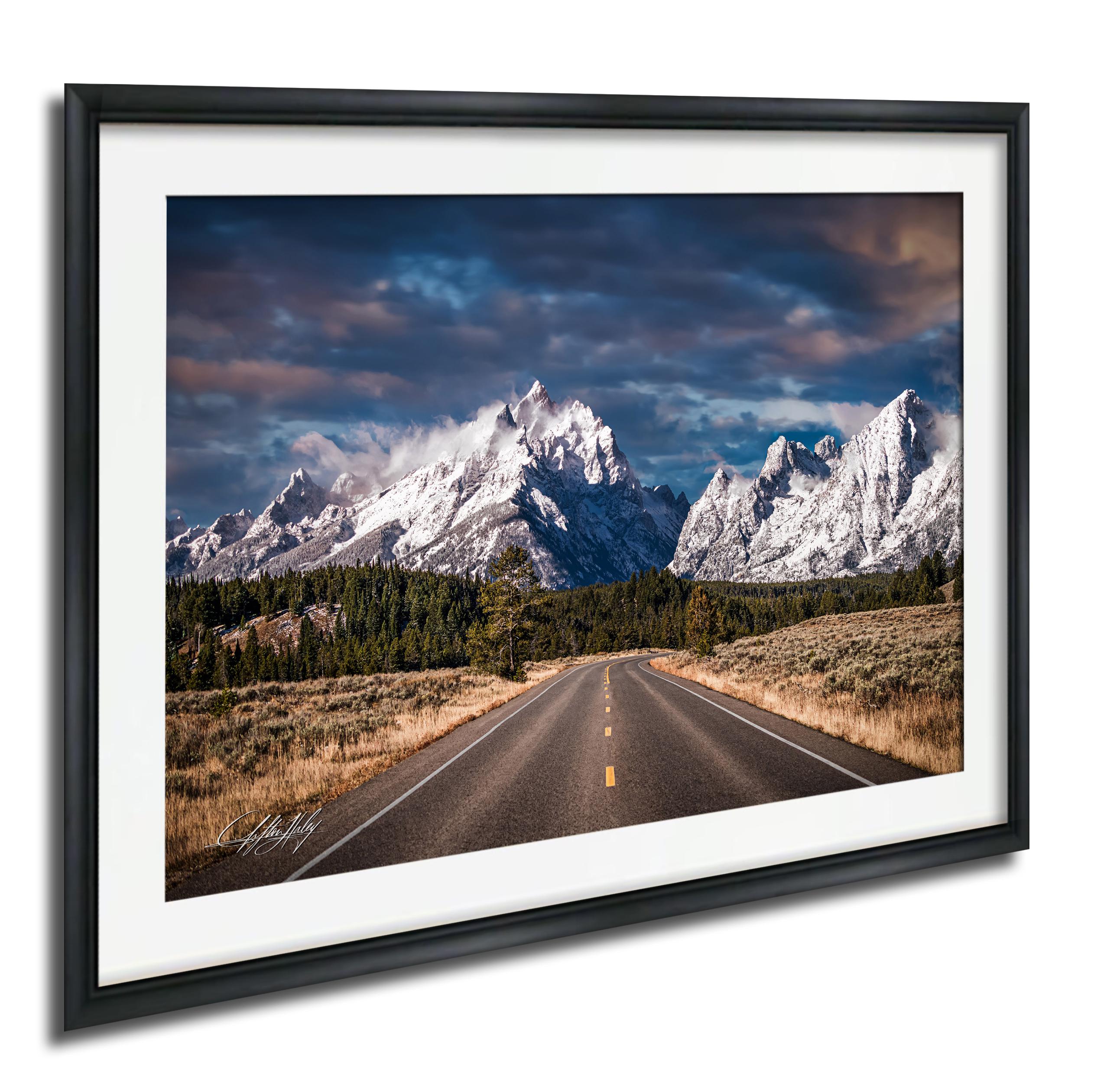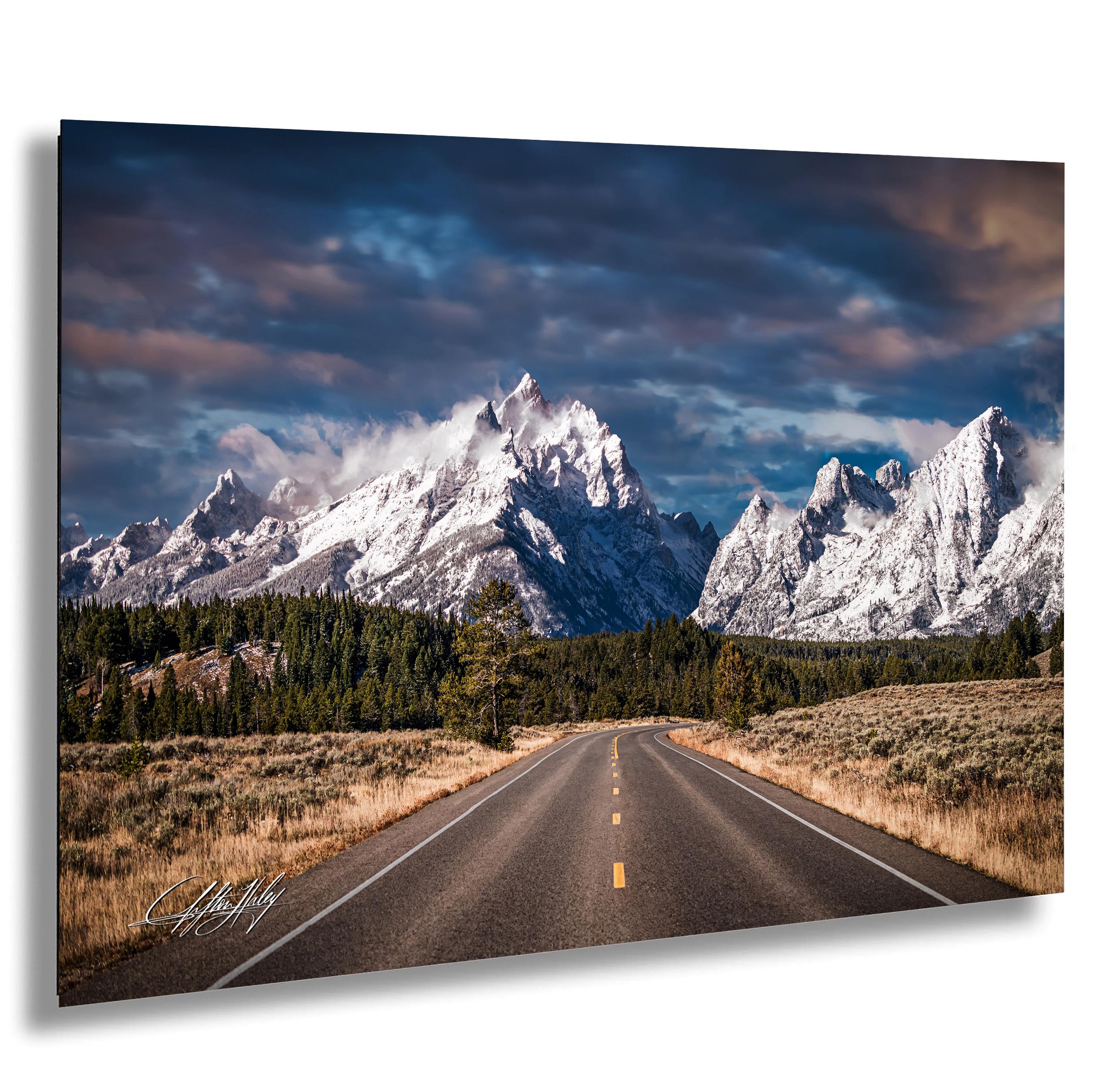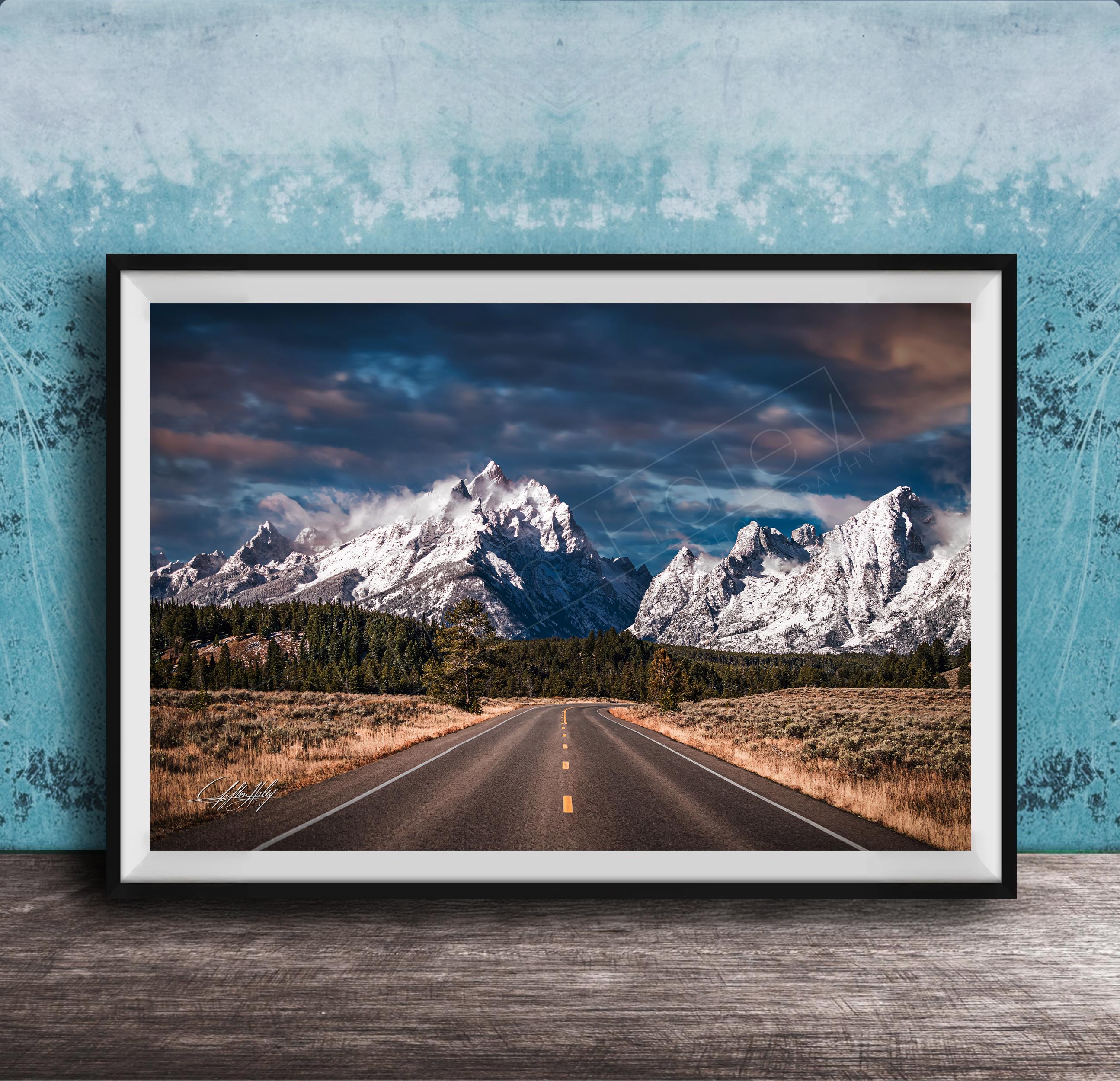 Captured at sunrise, this fine art print brings the golden morning sun and pine scented air right into your space, evoking the crisp, fresh atmosphere of Jackson Hole WY. The asphalt road view leads your eye toward the majestic Teton mountain peaks reaching for the sky, perfect for outdoor enthusiasts and lovers of wilderness adventure.