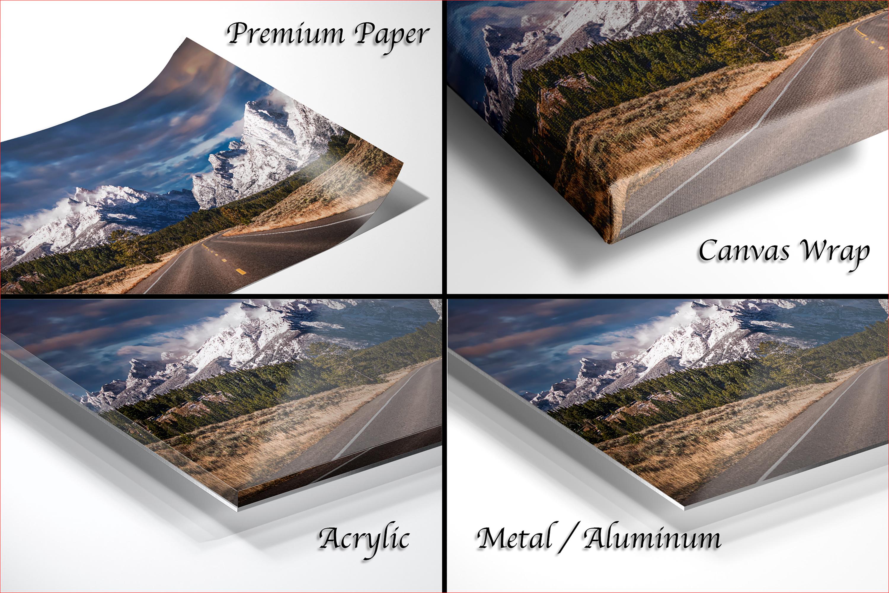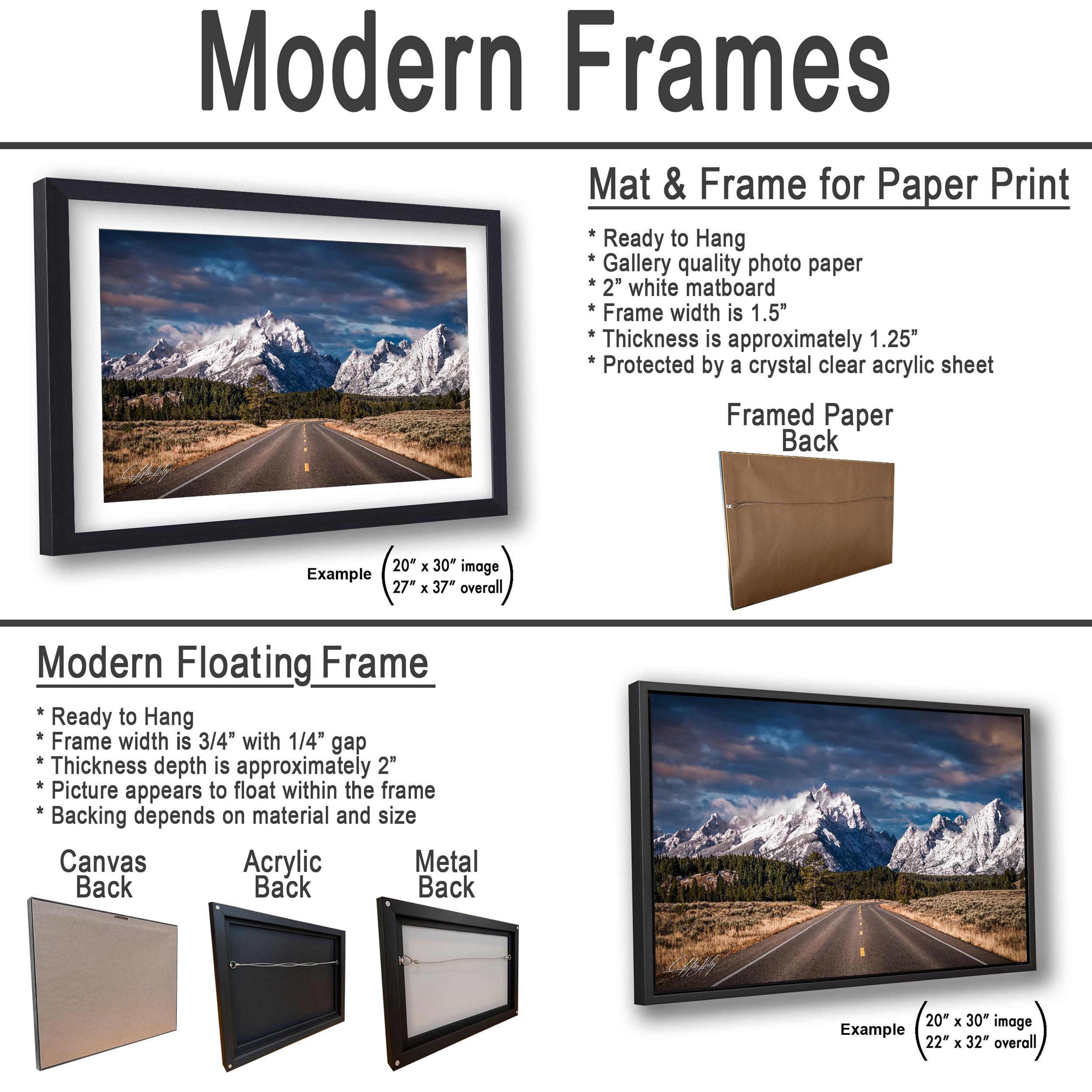 3.1) Only framed paper prints, acrylics and aluminum/metal prints will have a 2" white mat border. 3.2) Canvas prints will be a flush mounted (no mat border) to the frame.