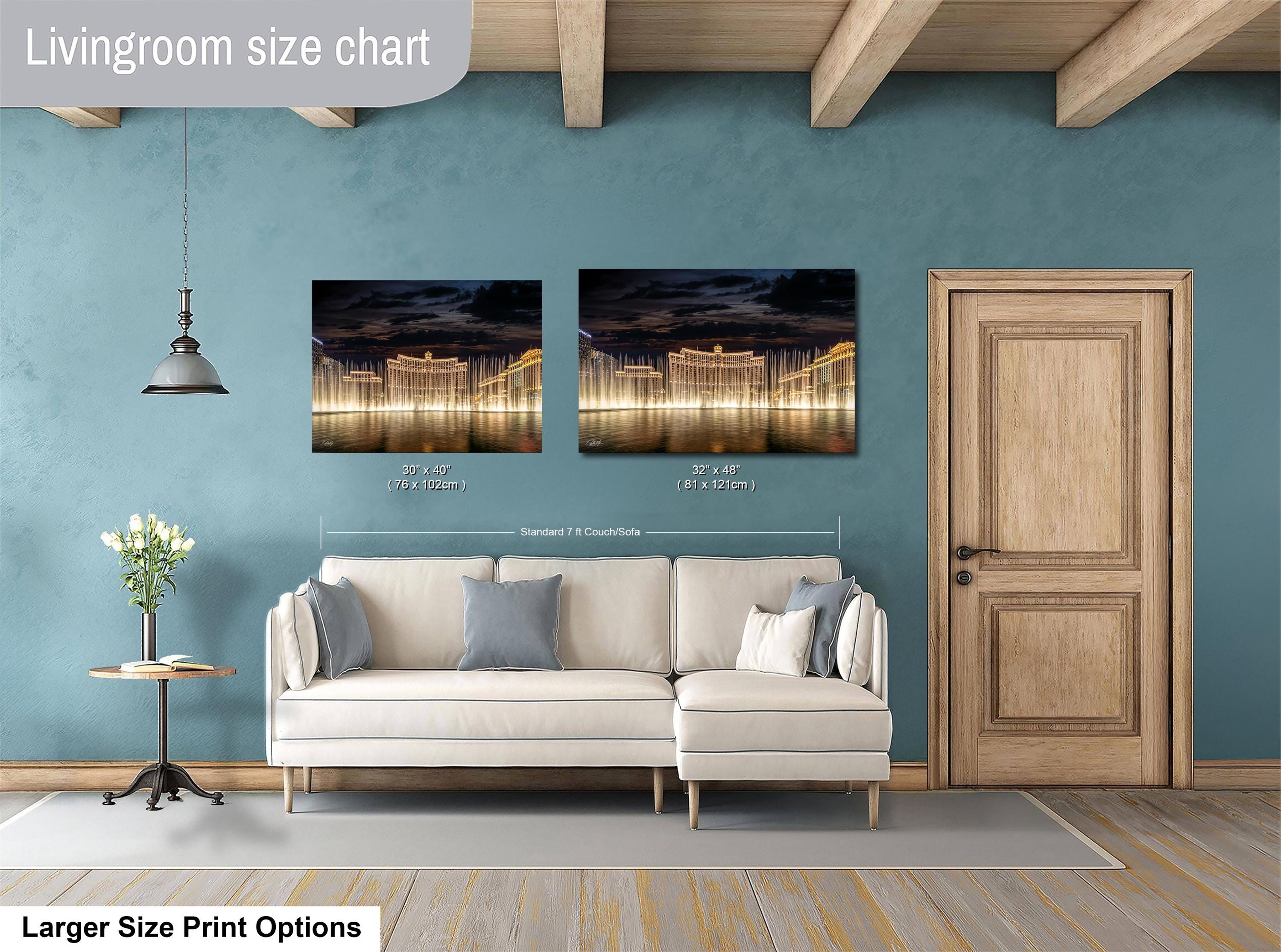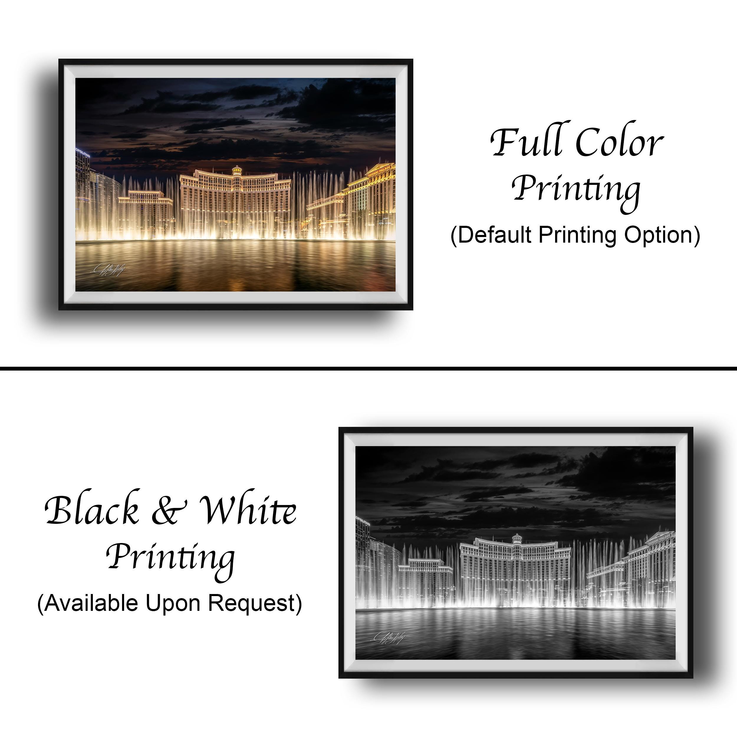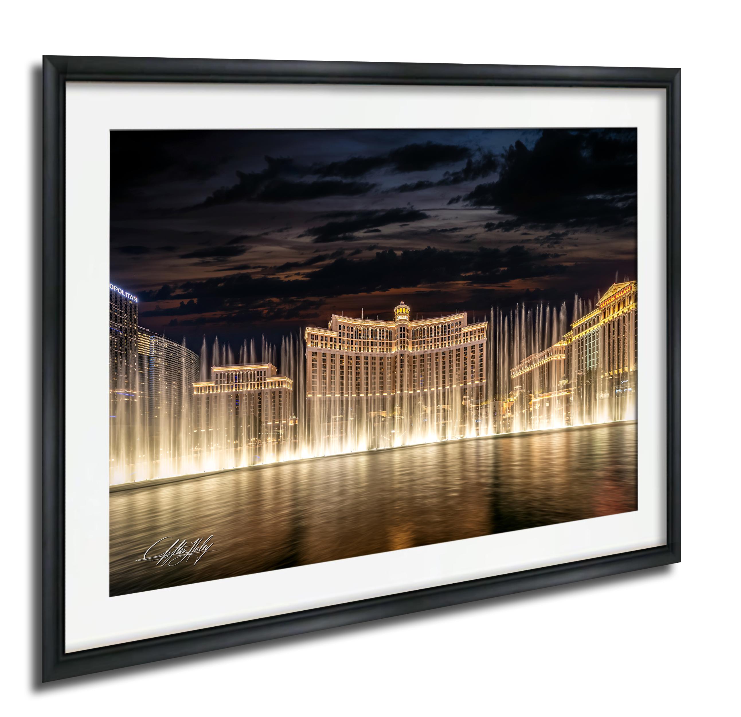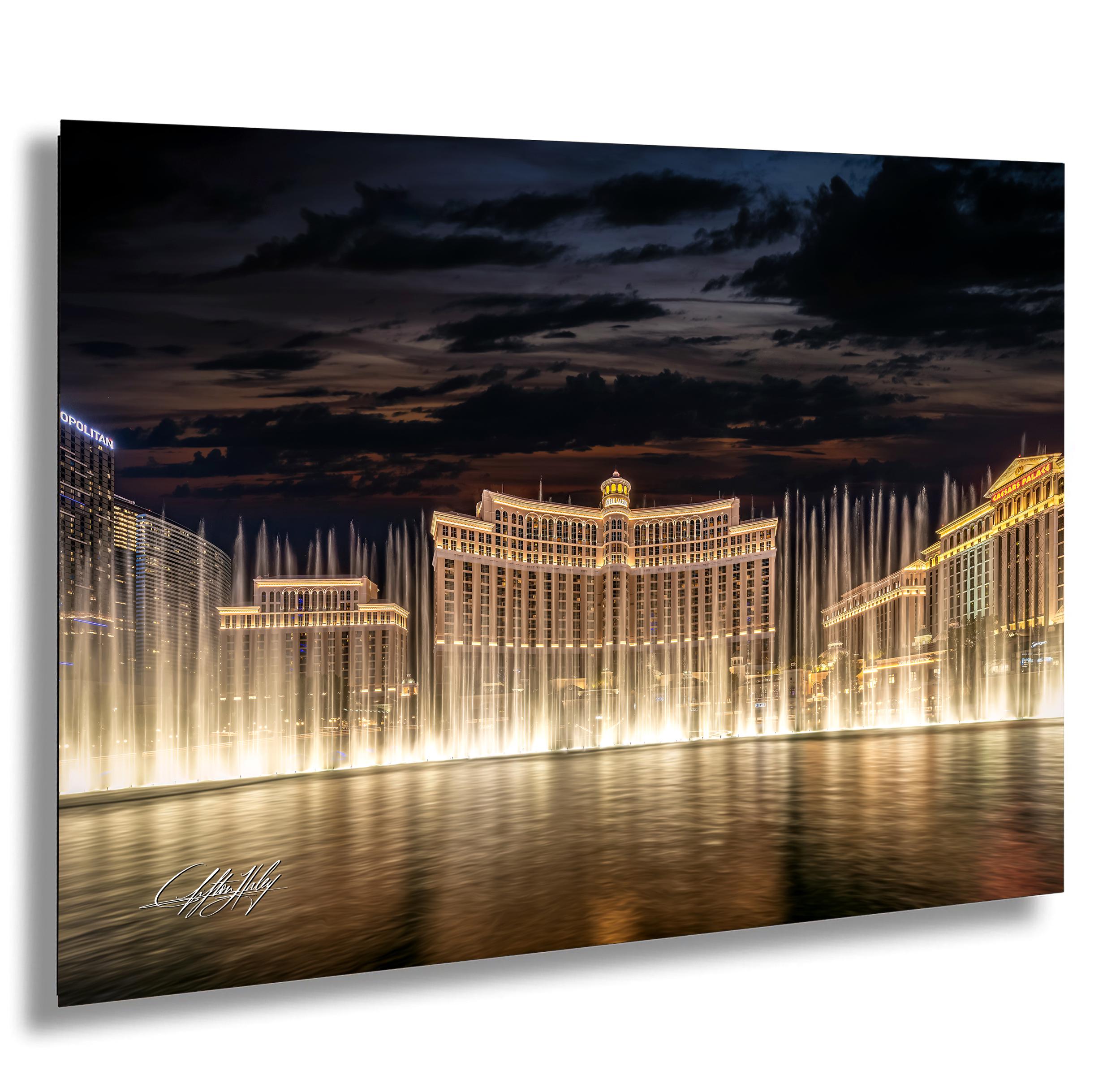 Bellagio Fountain Show Art captures the mesmerizing dance of water and light that defines this iconic Las Vegas landmark. This signed fine art print brings the vibrant energy of the Vegas Strip view right into your home, perfect for luxury hotel decor or as a unique Las Vegas souvenir.