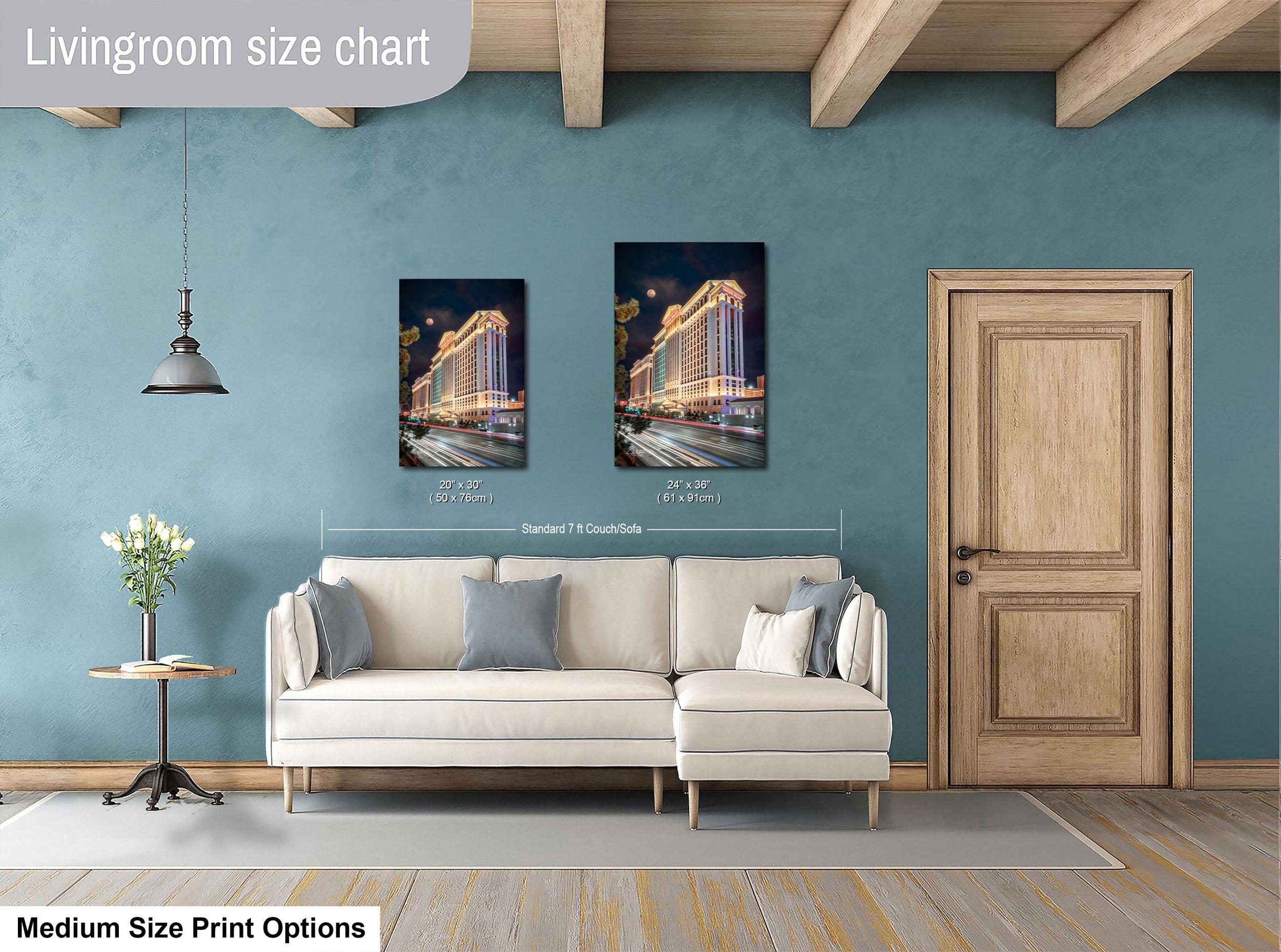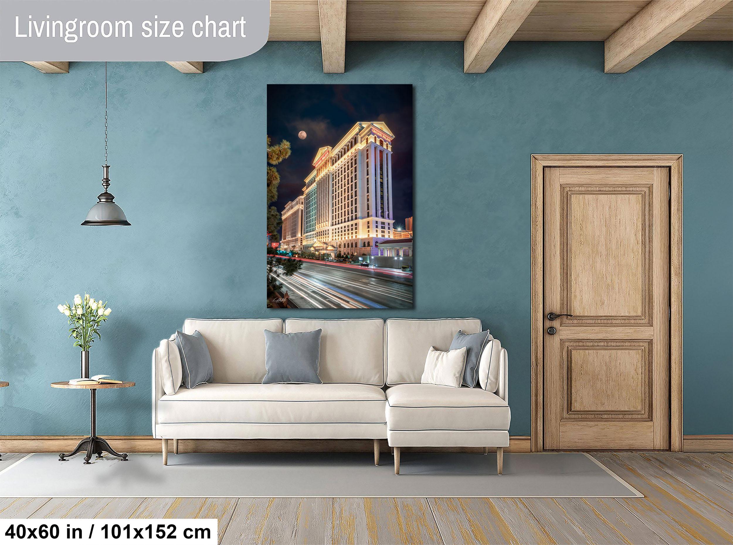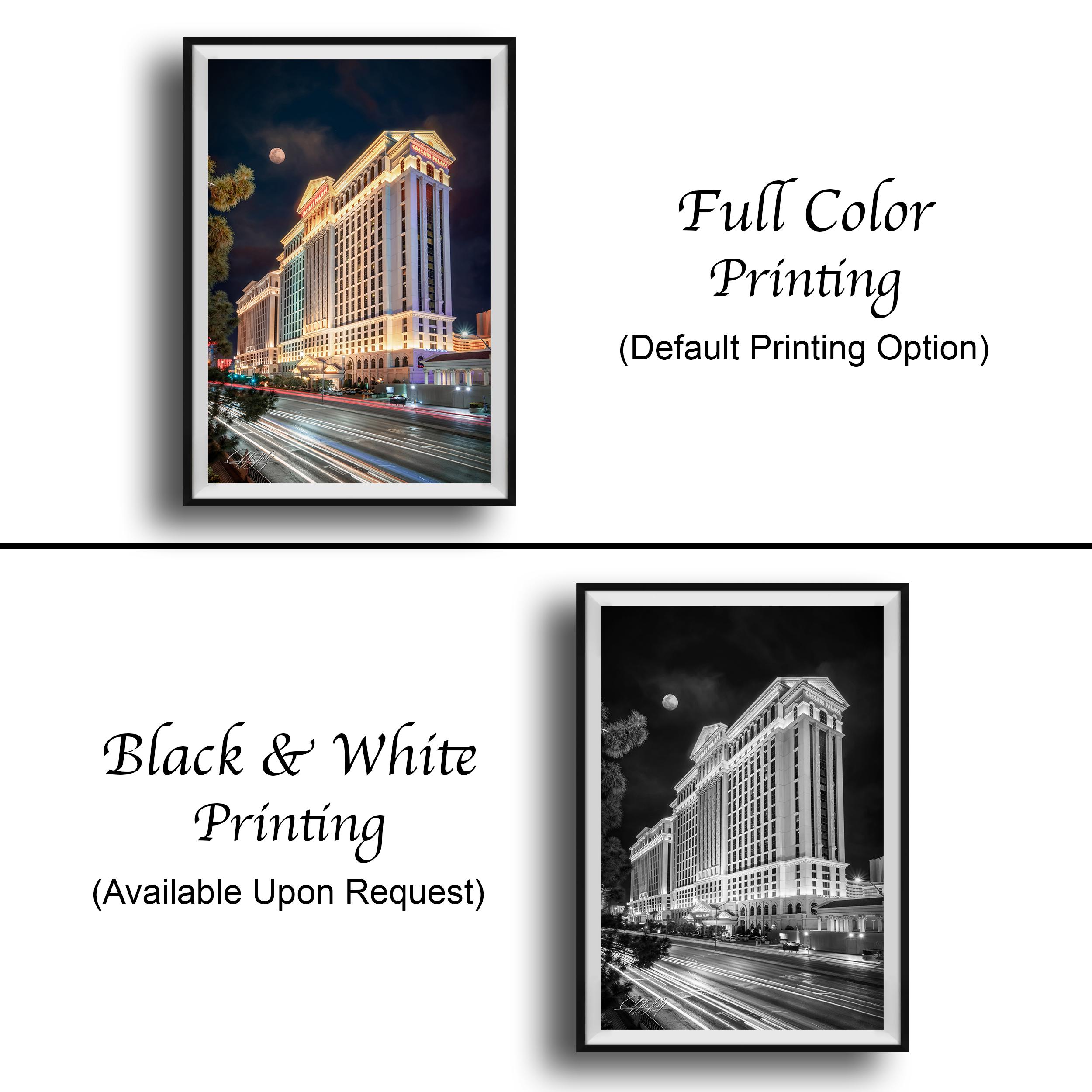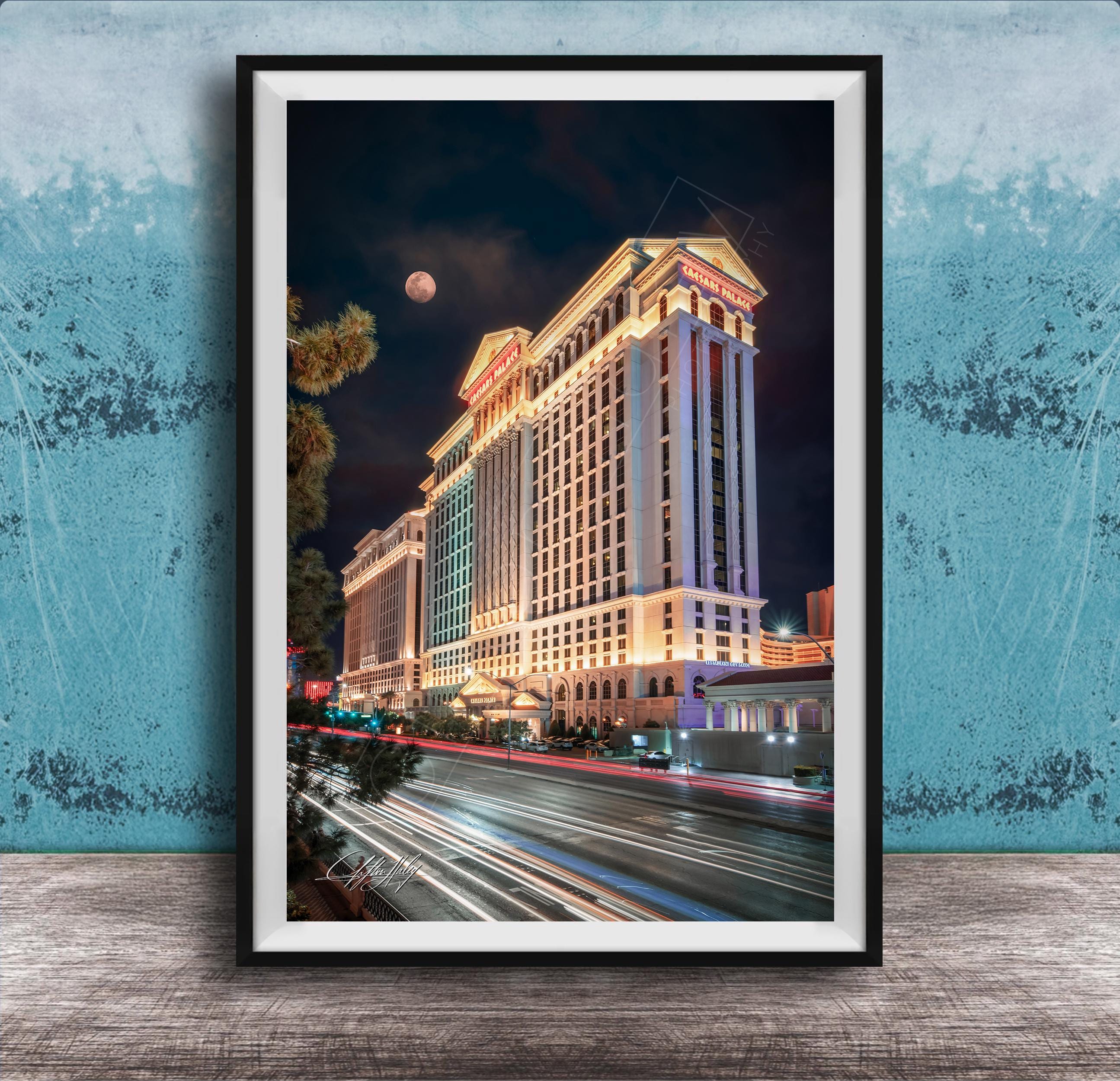Step into the heart of Las Vegas with this exclusive Caesars Palace photo, showcasing the iconic Roman Empire style architecture and vibrant Vegas Strip lights. This captivating piece of casino wall art perfectly embodies the glamour and excitement of Sin City, making it an ideal Vegas travel gift or a striking addition to your nighttime cityscape collection.