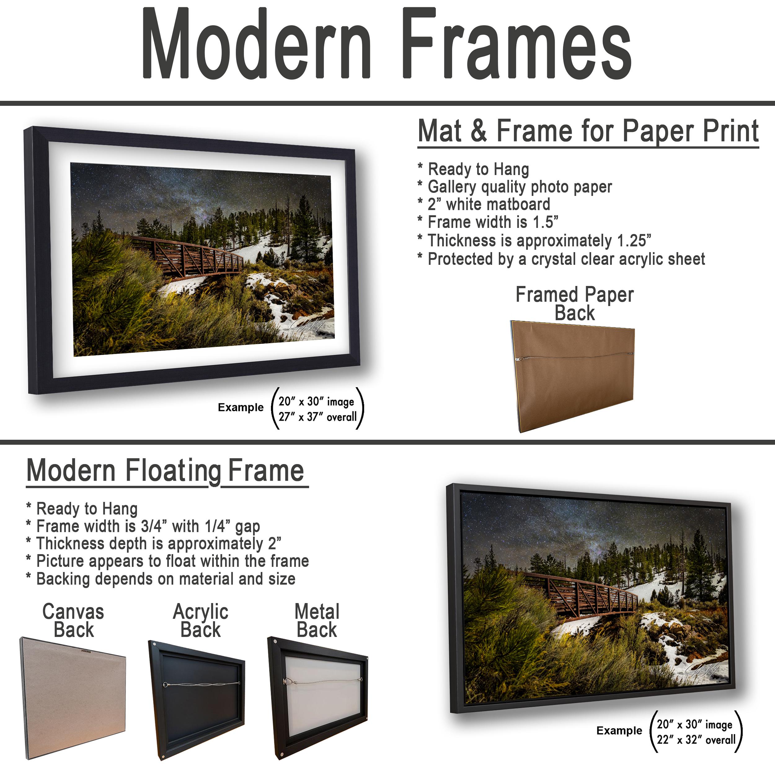 1. Made-to-order with no returns, but exchanges or replacements are available if damaged or flawed. 2. Artist’s signature placed in the bottom corner adds authenticity and personal touch. 3. Metal prints come with a crisp white mat border; canvas prints are flush mounted without a mat.