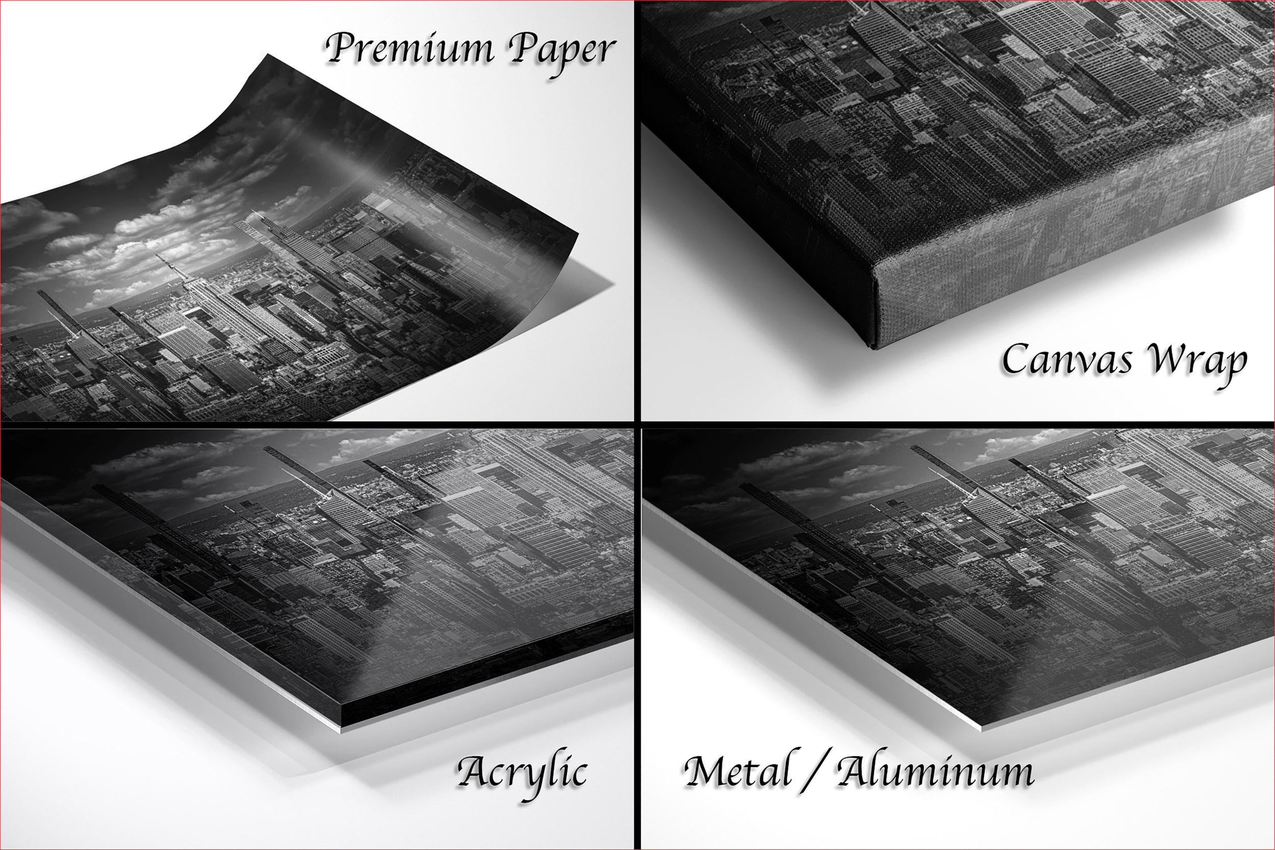 3.1) Only framed paper prints, acrylics and aluminum/metal prints will have a 2" white mat border. 3.2) Canvas prints will be a flush mounted (no mat border) to the frame.