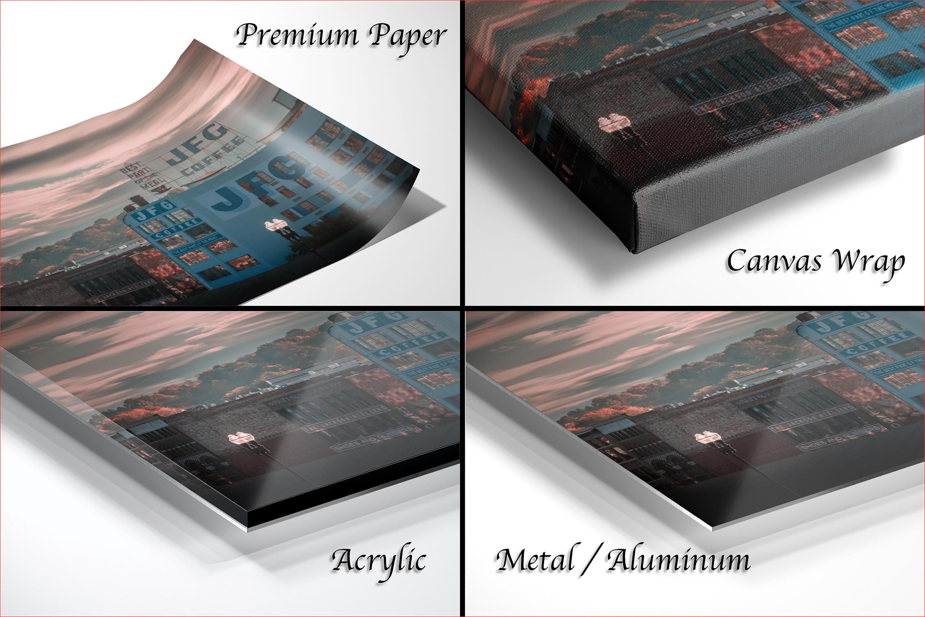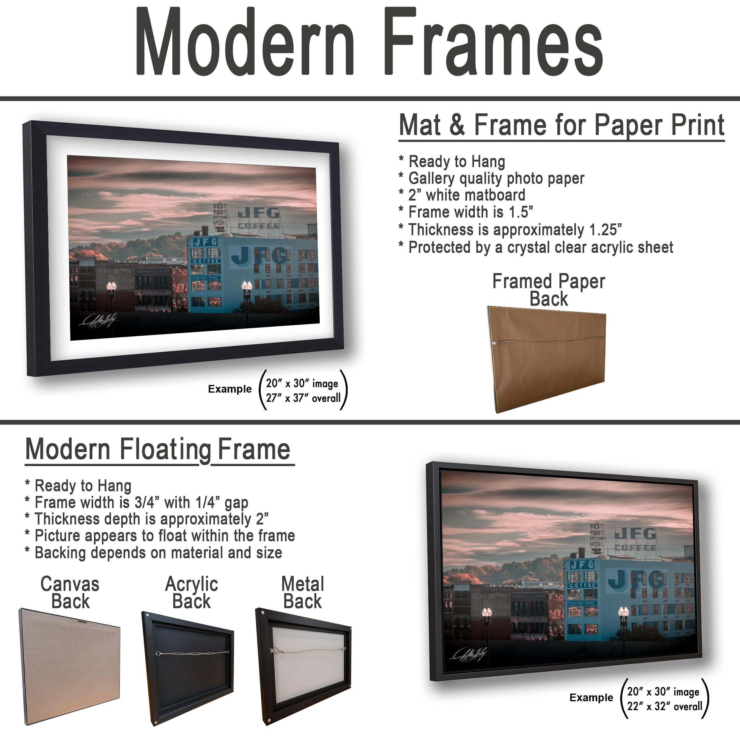 3.1) Only framed paper prints, acrylics and aluminum/metal prints will have a 2" white mat border. 3.2) Canvas prints will be a flush mounted (no mat border) to the frame.