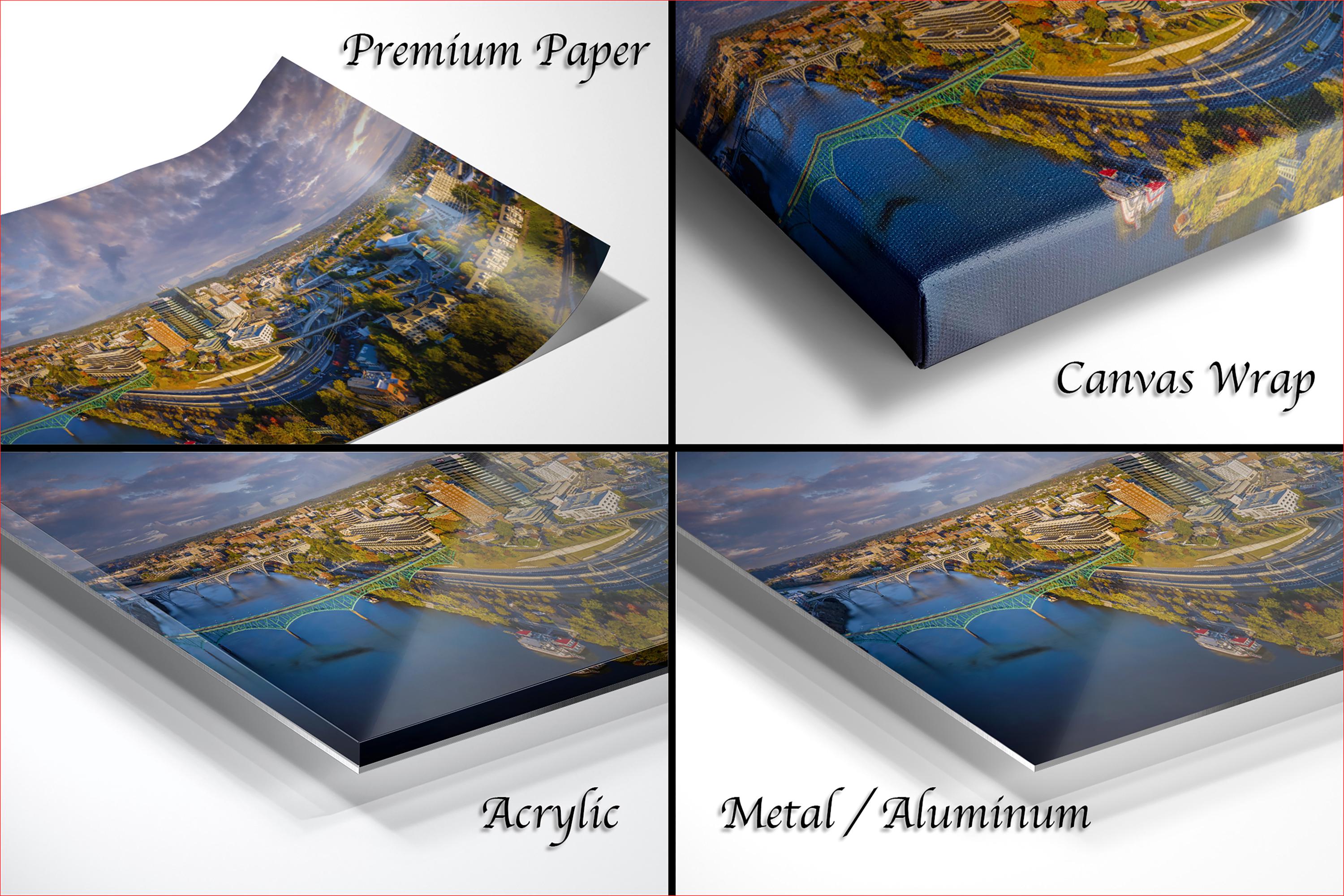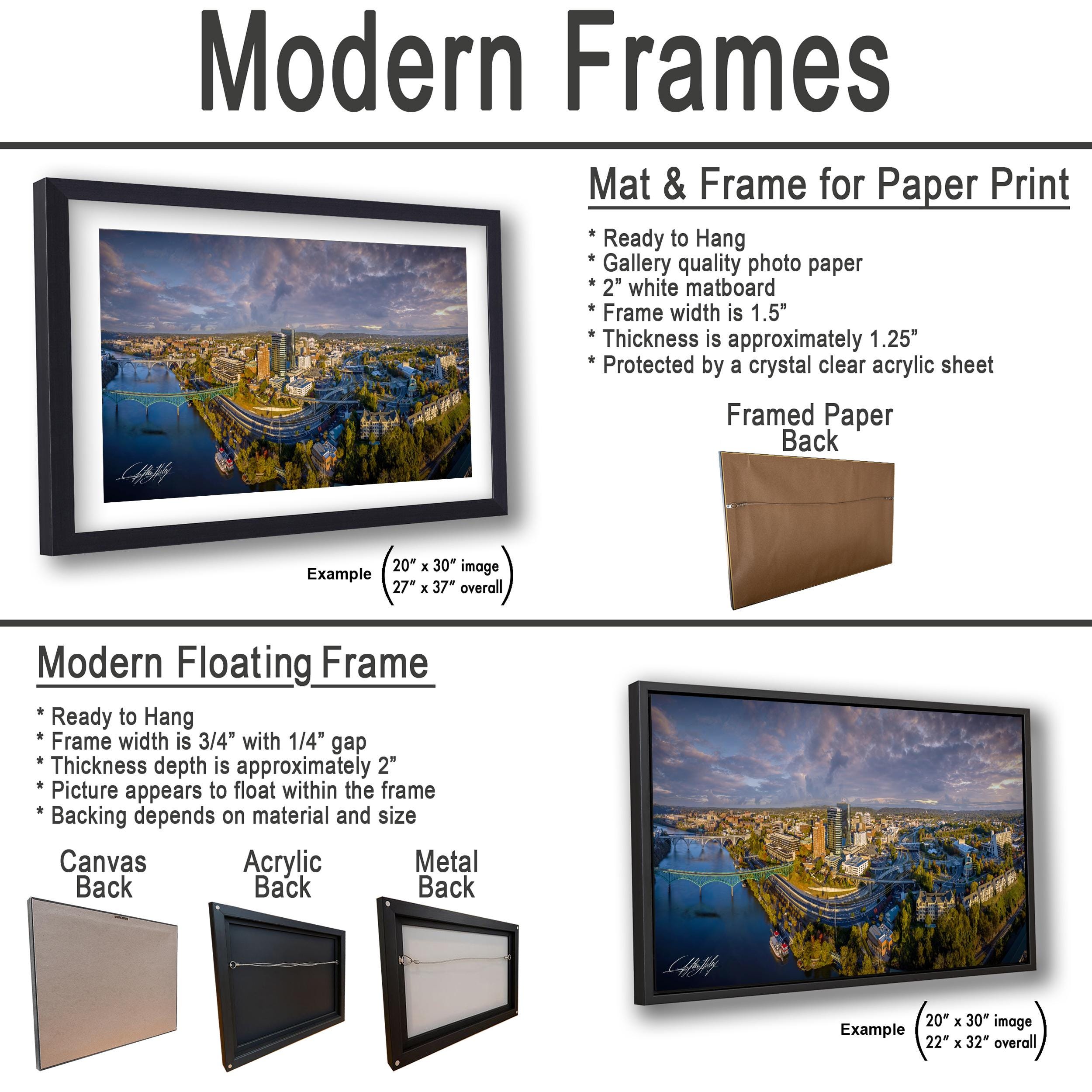 Choose from framed paper prints, acrylics, or aluminum/metal prints that feature a 2" white mat border for an elegant presentation. Canvas prints are flush mounted with no mat border for a modern look.
