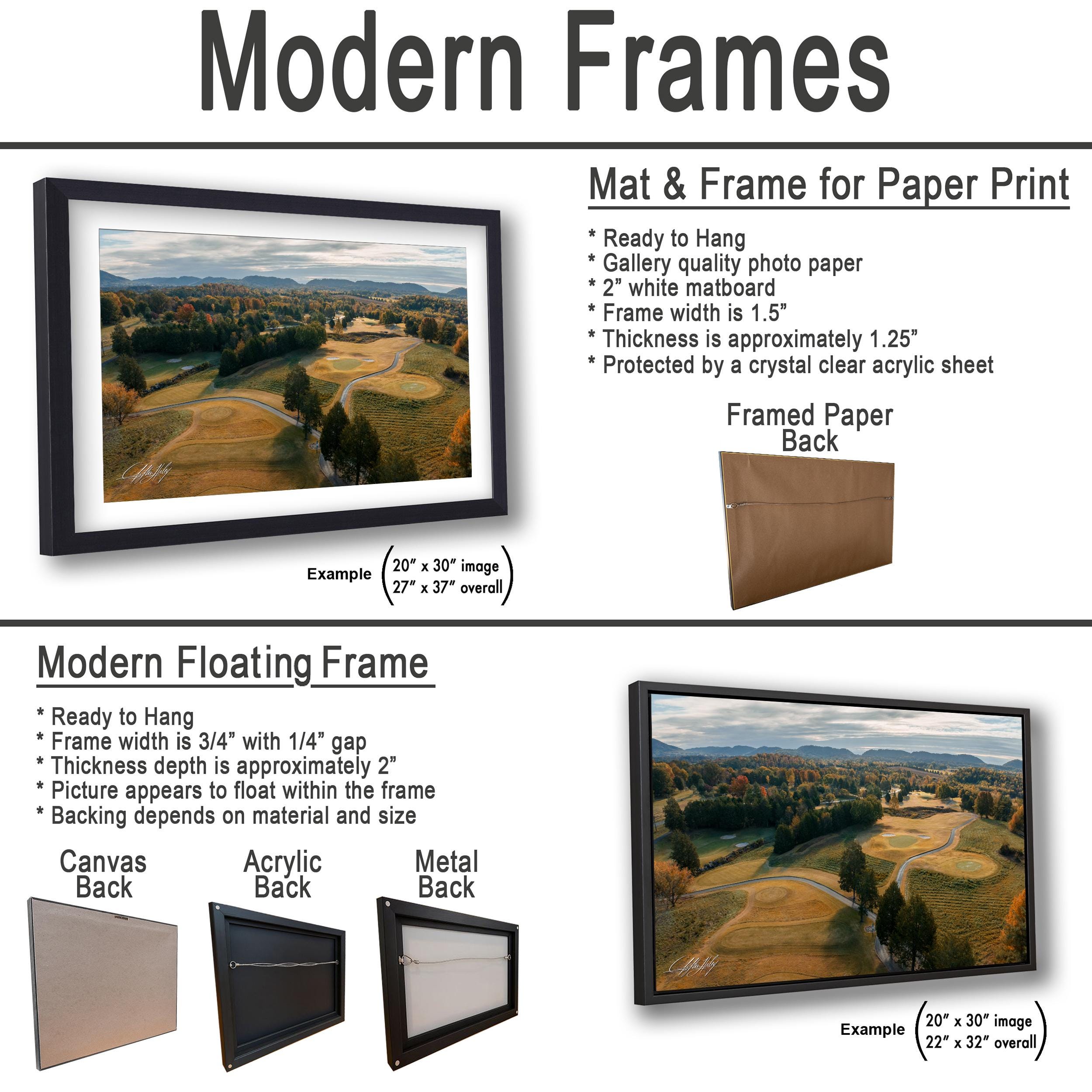 This fine art piece is made-to-order with the artist's signature authenticating its uniqueness. Choose from framed paper prints with a 2" white mat border, acrylics, aluminum/metal prints, or canvas prints with flush mounting. Each option highlights the vivid details of this golf course wall art.