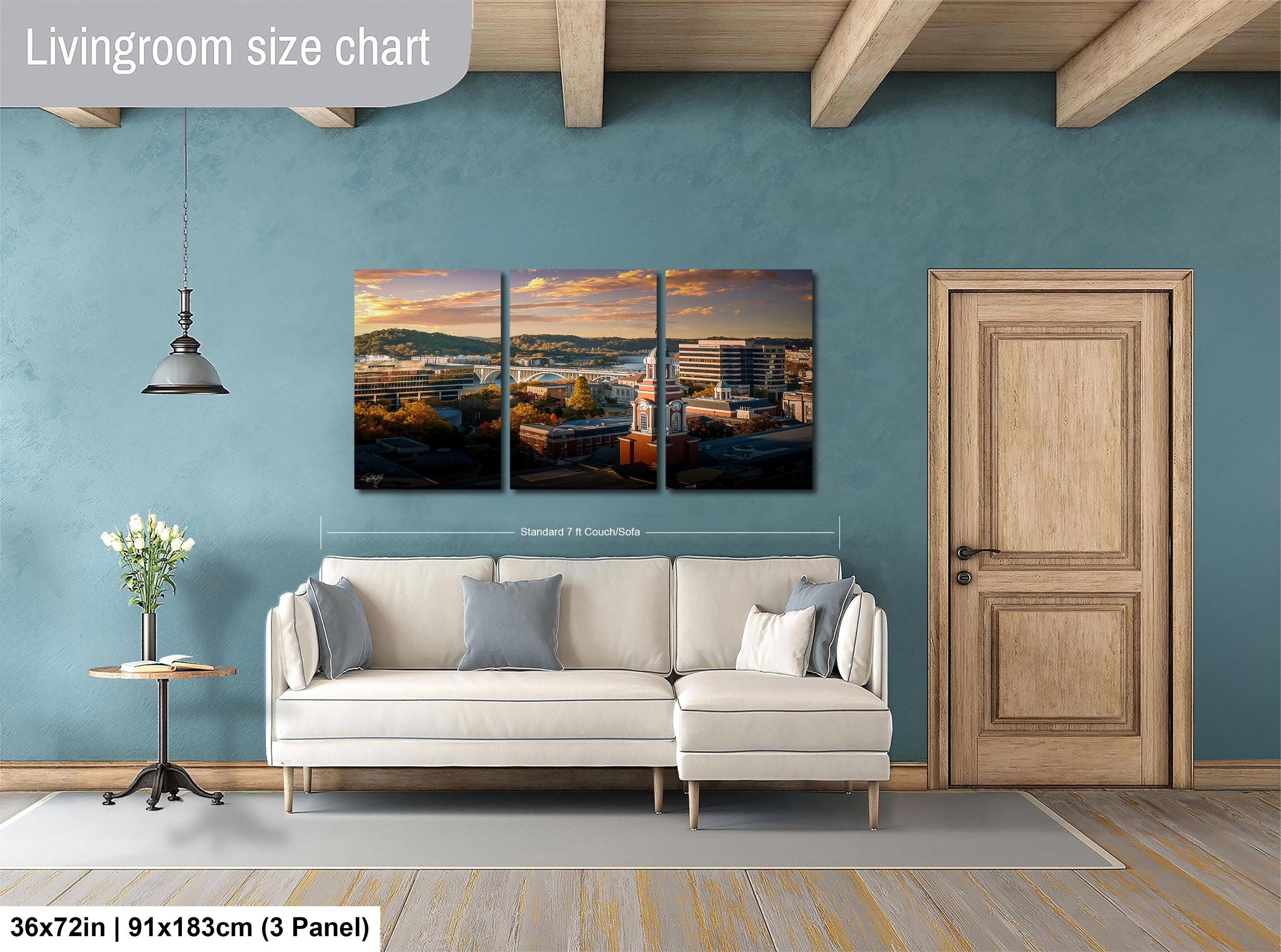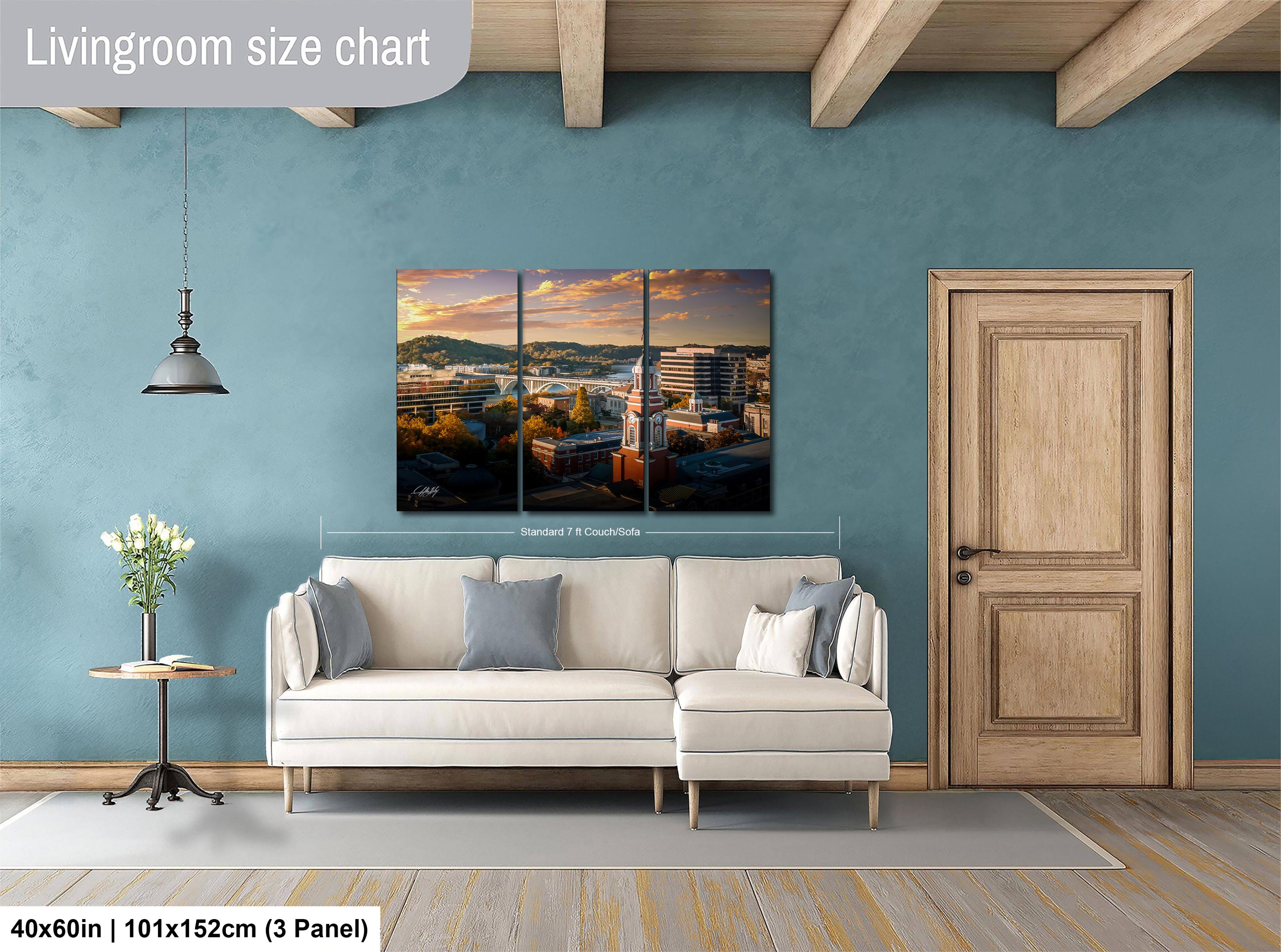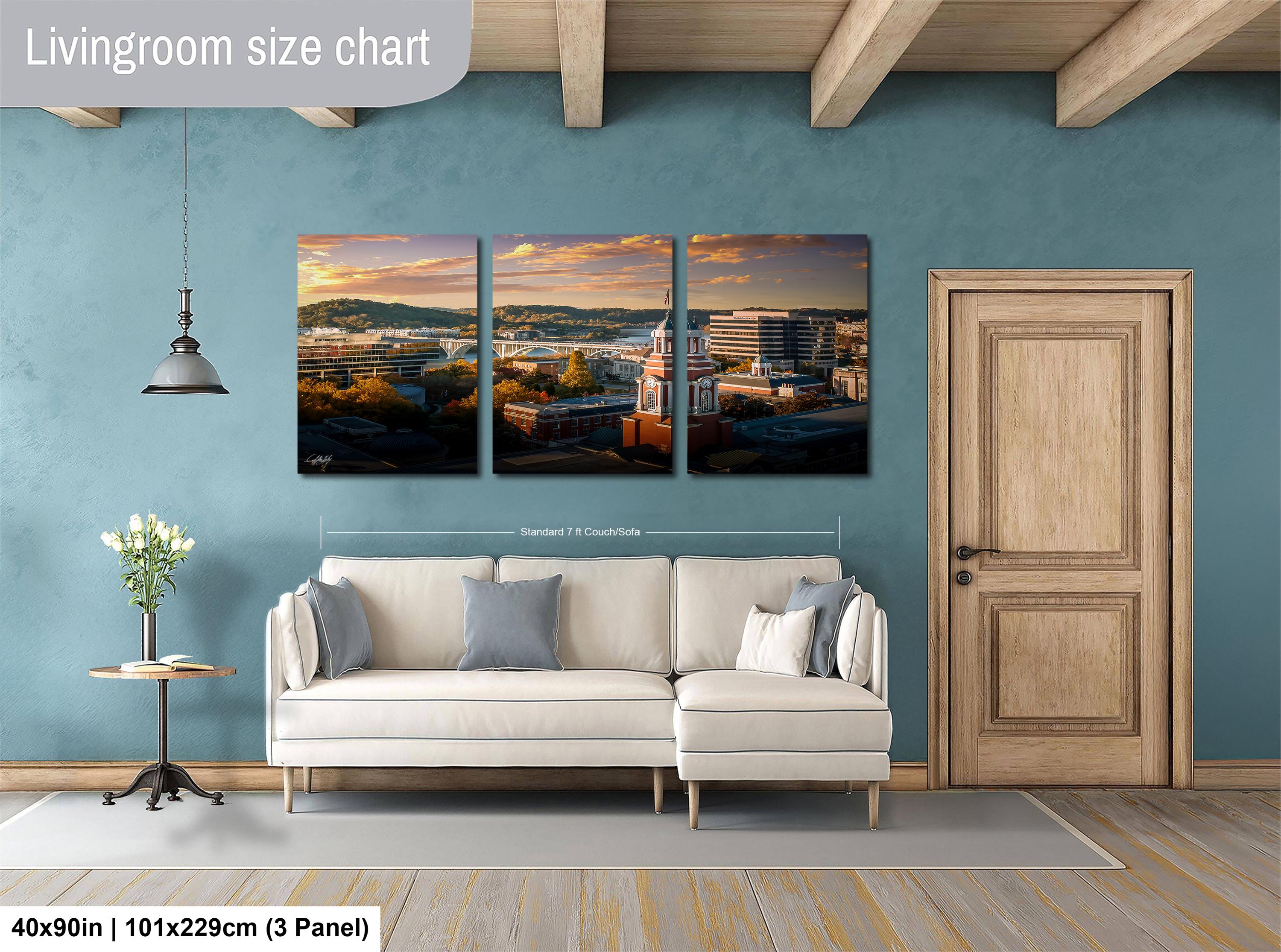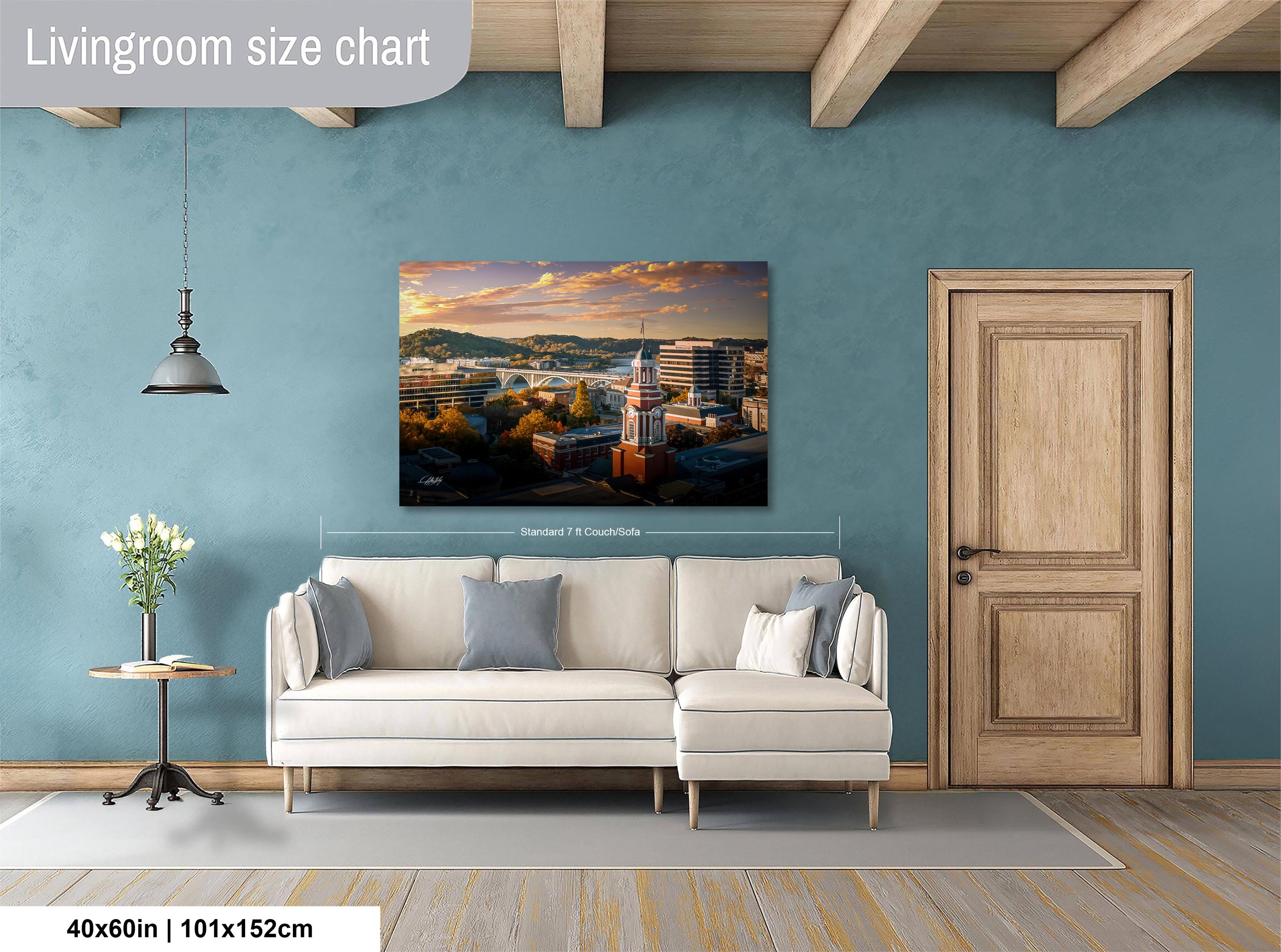 Knoxville courthouse building captures the serene beauty of autumn along the Tennessee River, offering a breathtaking cityscape wall art piece that brings rustic outdoor decor into your home. This fine art print showcases urban morning light and vivid autumn river scene colors, perfect for enhancing any living space.