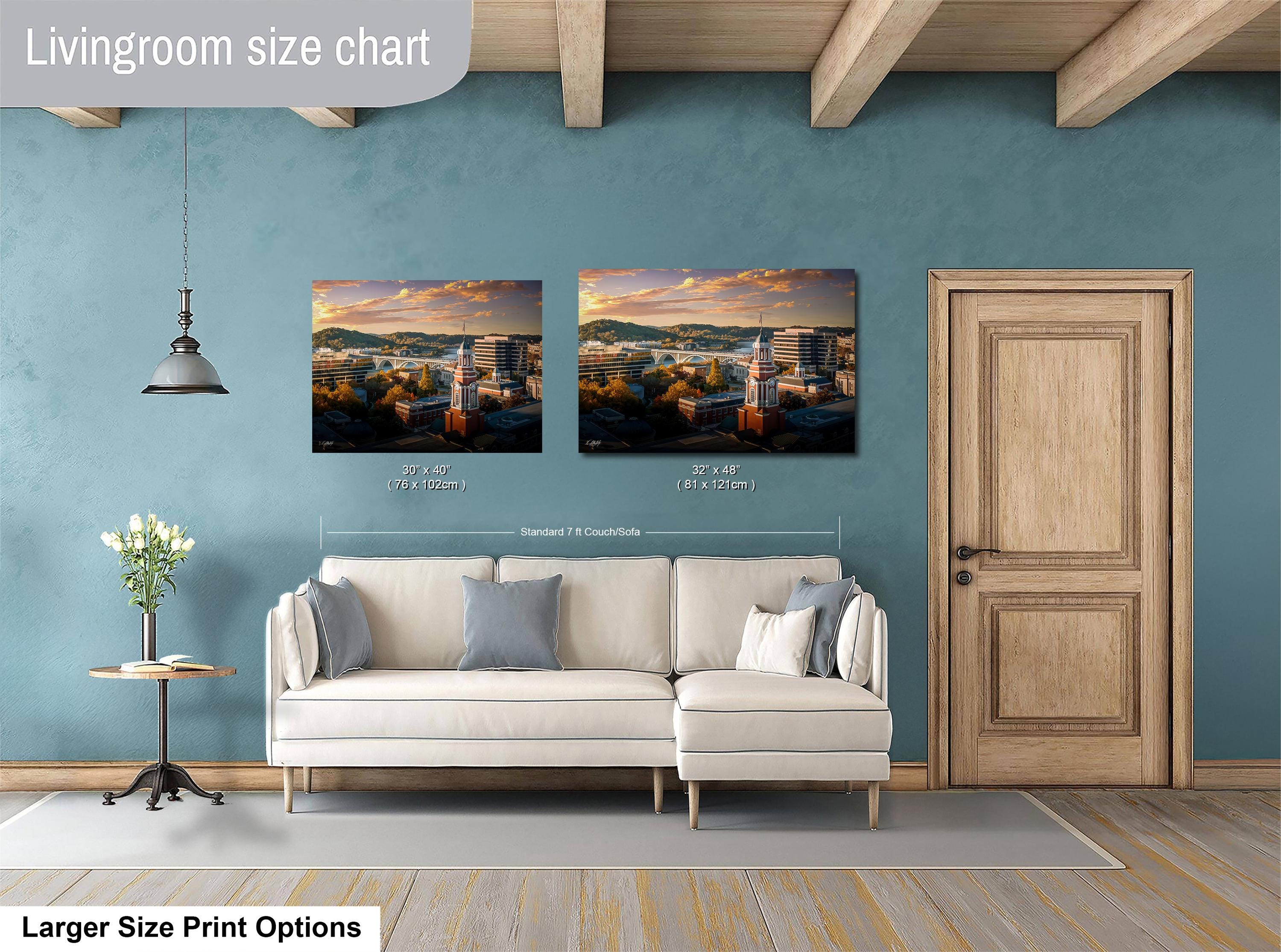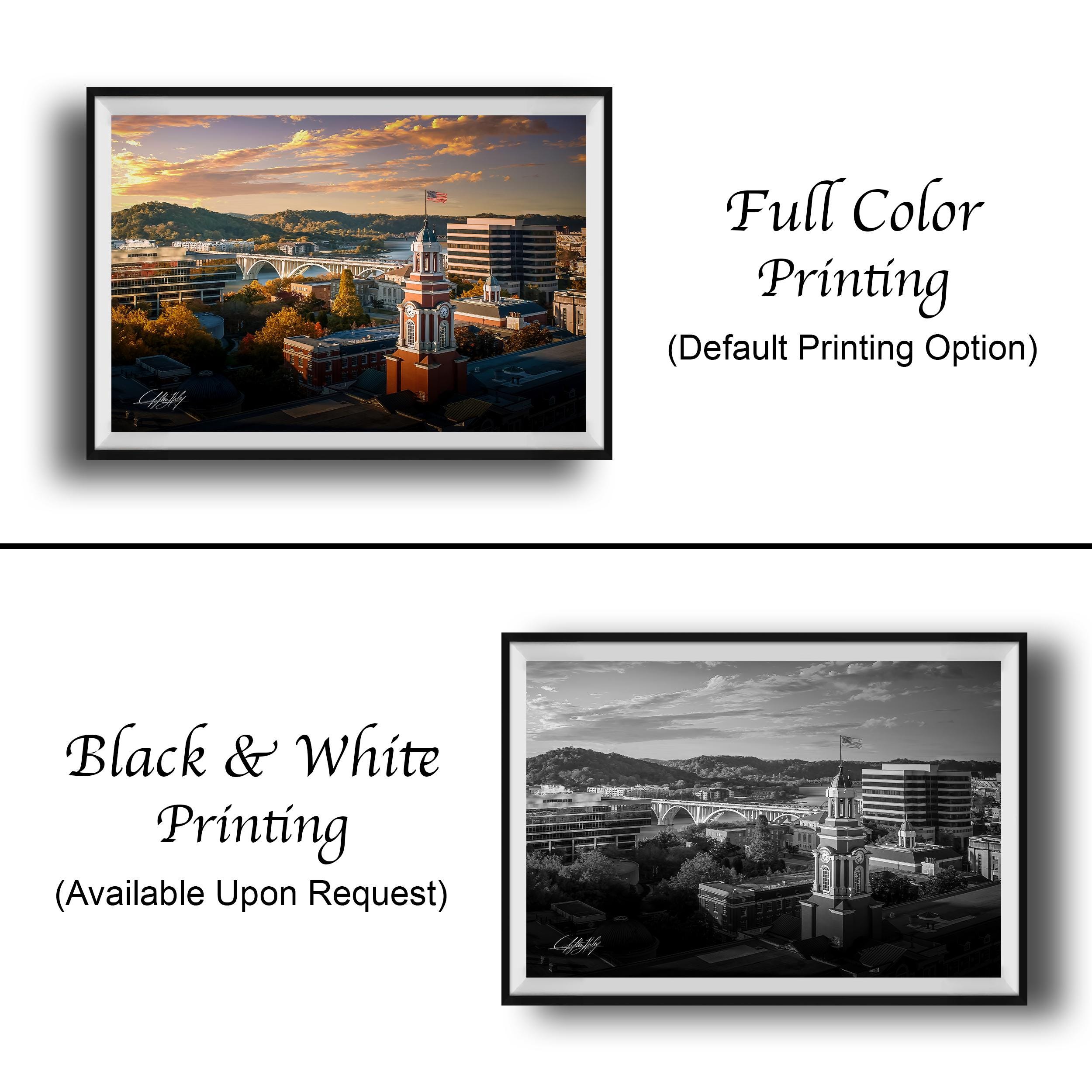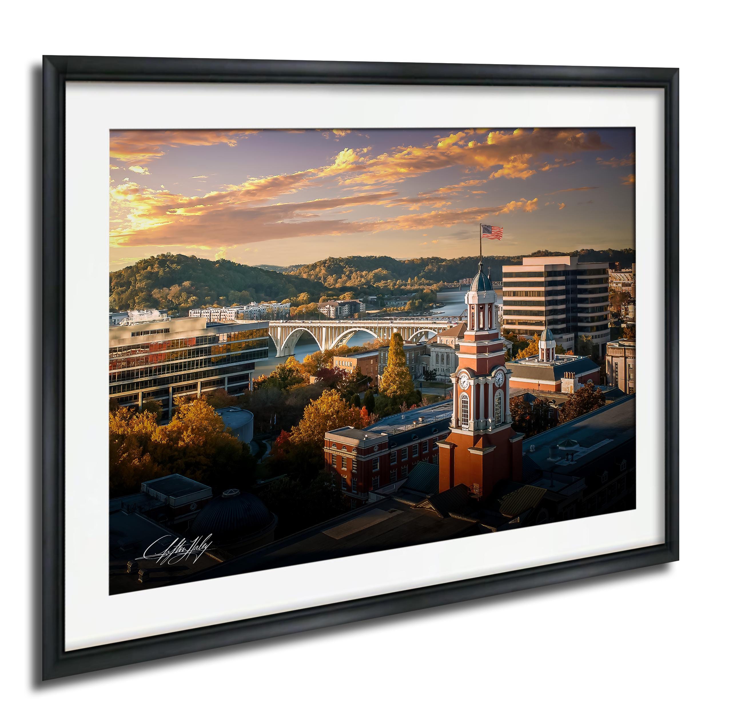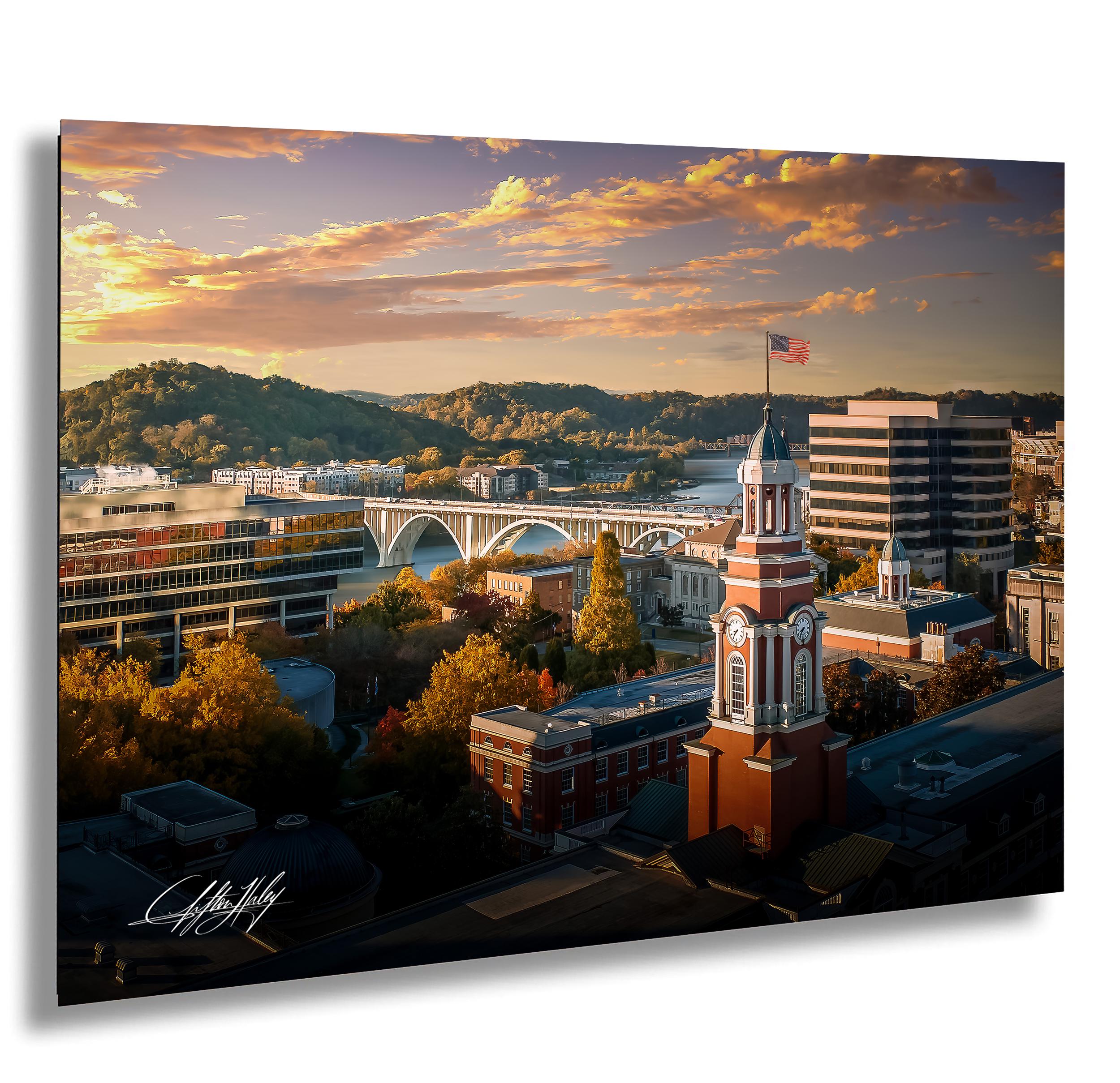 Experience the charm of downtown Knoxville with this made-to-order art print, featuring the iconic Howard H. Baker, Jr. Courthouse framed by vibrant fall foliage and the Tennessee River view. The scene highlights the historic Henley Street Bridge, a symbol of resilience and progress.