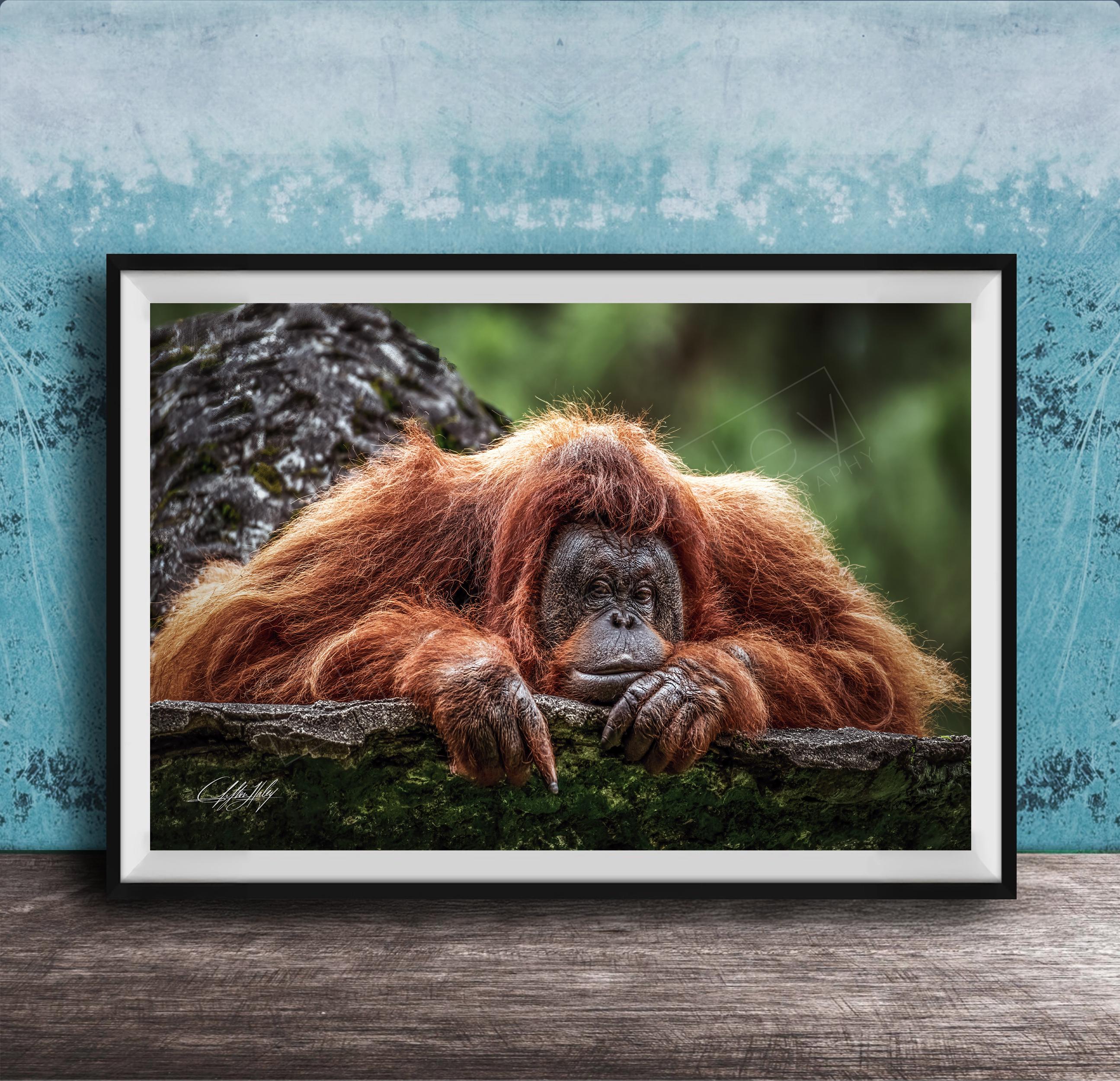 This orangutan print and wildlife photography piece captures the vibrant spirit of the rainforest, perfect for any orangutan lover or animal art enthusiast. Featuring colorful rainforest illustration and exotic jungle scenes, this Pongo wall decor brings a splash of orange art and wildlife wall art into your home.