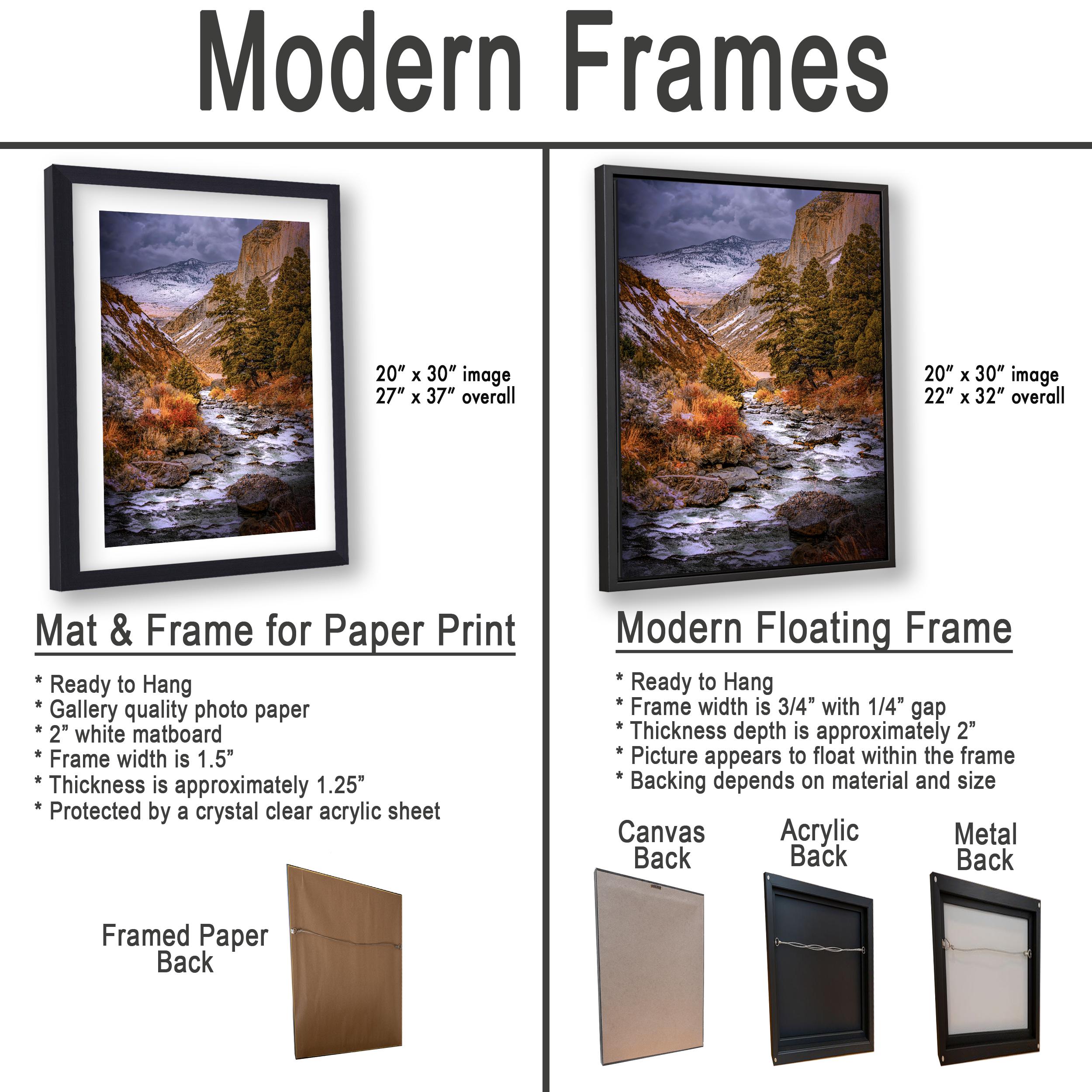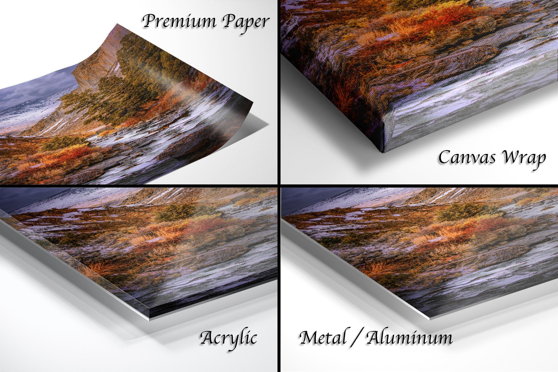 • Premium Photo Paper available in 8x10, 11x14, and 16x20 inches • Ready-to-Hang Canvas with 0.75" or 1.5" thick wooden stretcher bars • Split-Panel Canvas for a modern multi-panel display • Aluminum Metal Prints with UV resistant ink and rounded edges • Acrylic Prints with museum-quality clarity and vibrant colors
