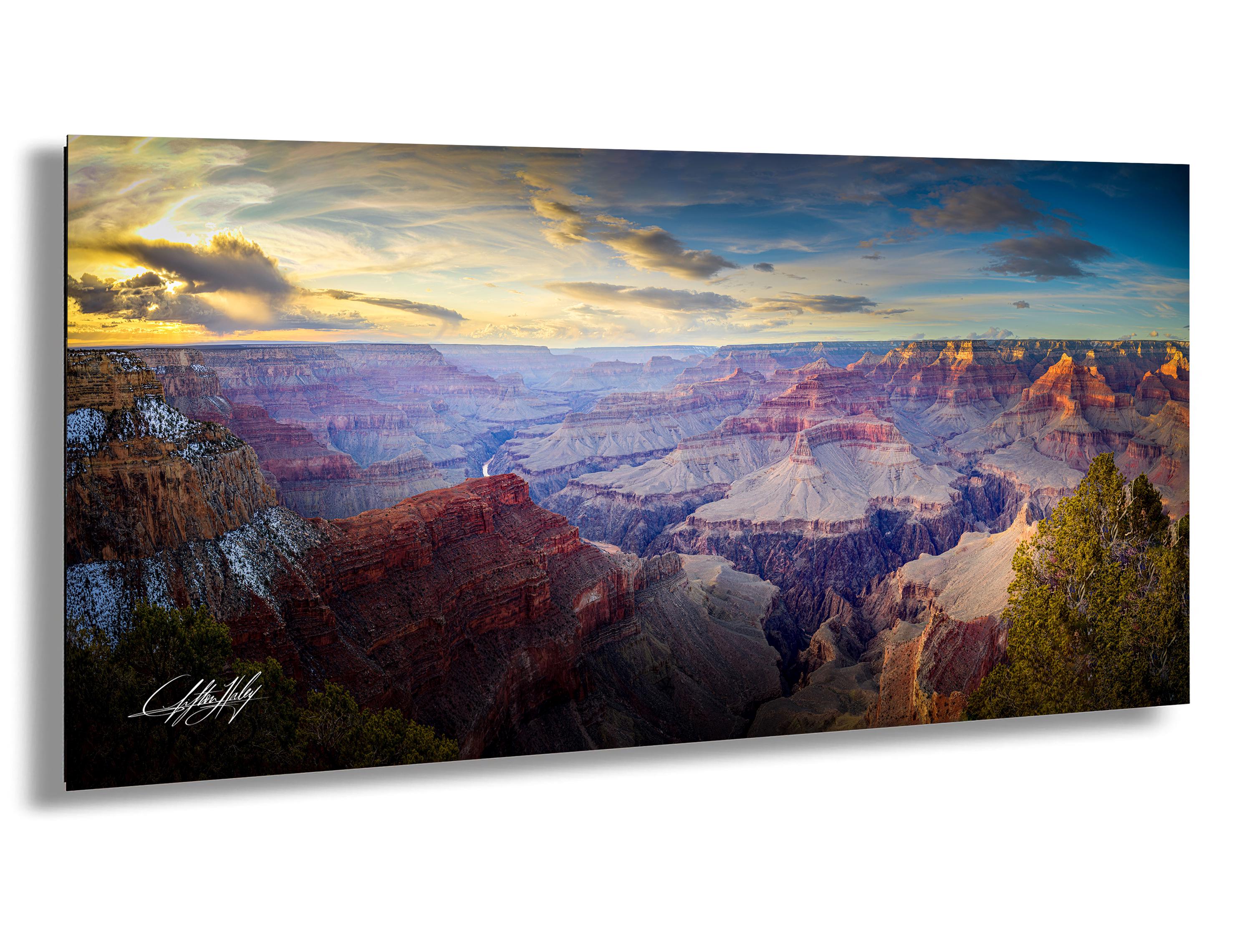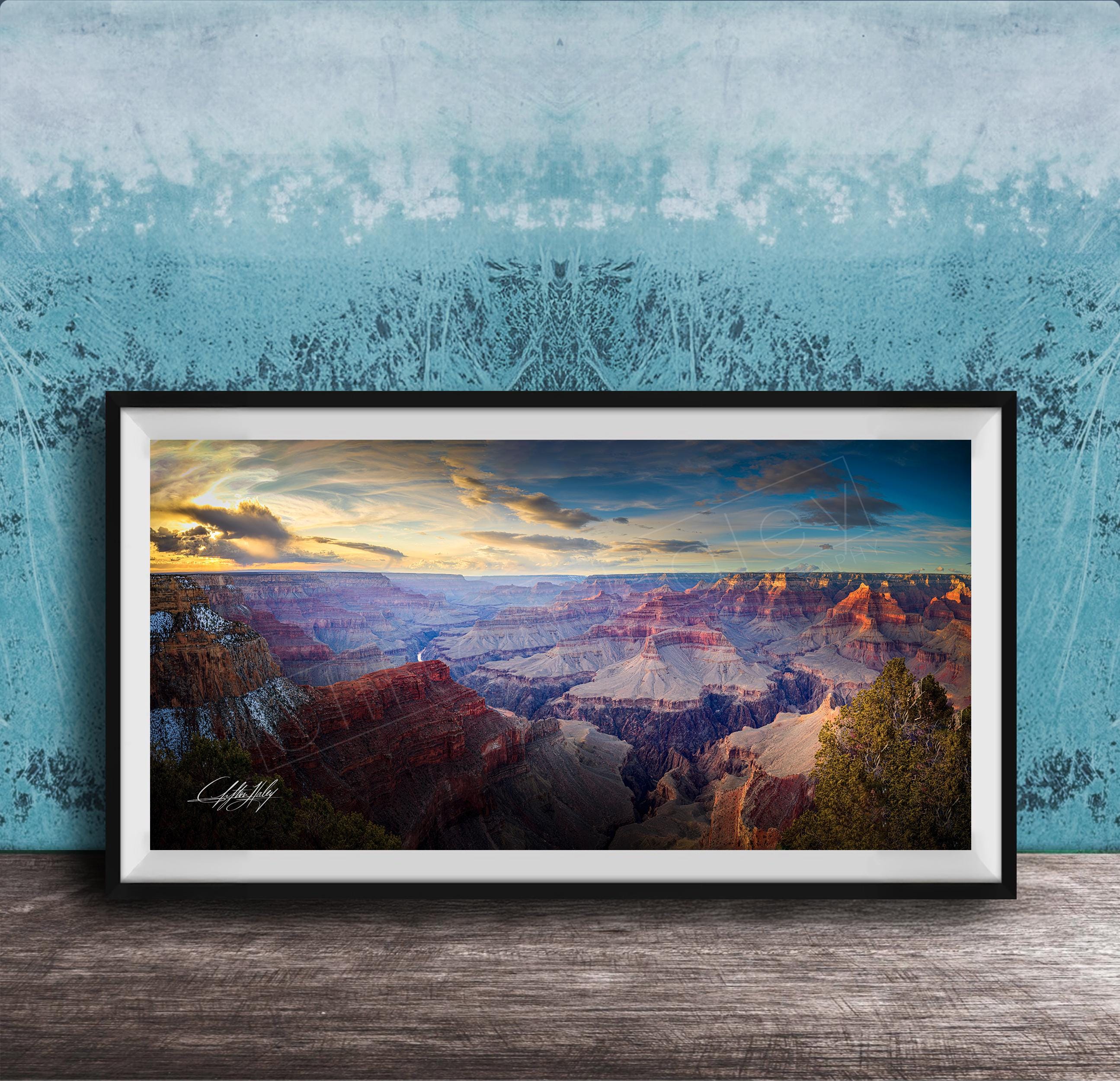 Experience the breathtaking beauty of the Grand Canyon's southern rim with this Hopi Point Arizona print, capturing a stunning sunset landscape that brings warm earth tones and desert scenic charm into your home. This fine art photography piece highlights the Colorado River view winding through the canyon, perfect for nature lovers and national park decor enthusiasts.