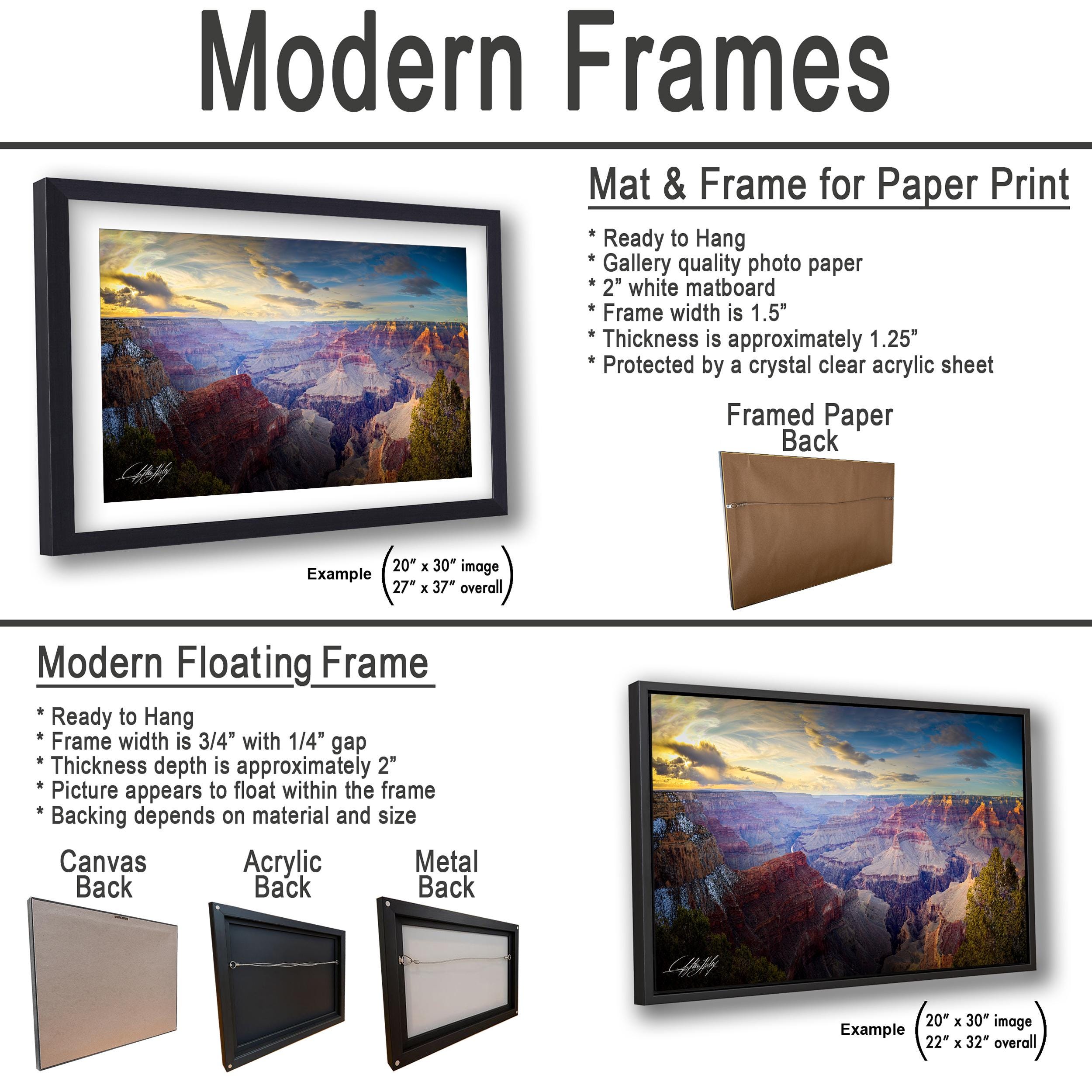 1. Since every image is custom made specifically for you, returns are not offered. However, if your artwork arrives damaged or has any issues, we will gladly exchange it or send a replacement. 2. The artist’s signature adds a personal touch and certifies this fine art photography as an exclusive creation. 3.1 Framed paper prints, acrylics, and metal prints include a 2" white mat border. 3.2 Canvas prints are flush mounted without a mat border.