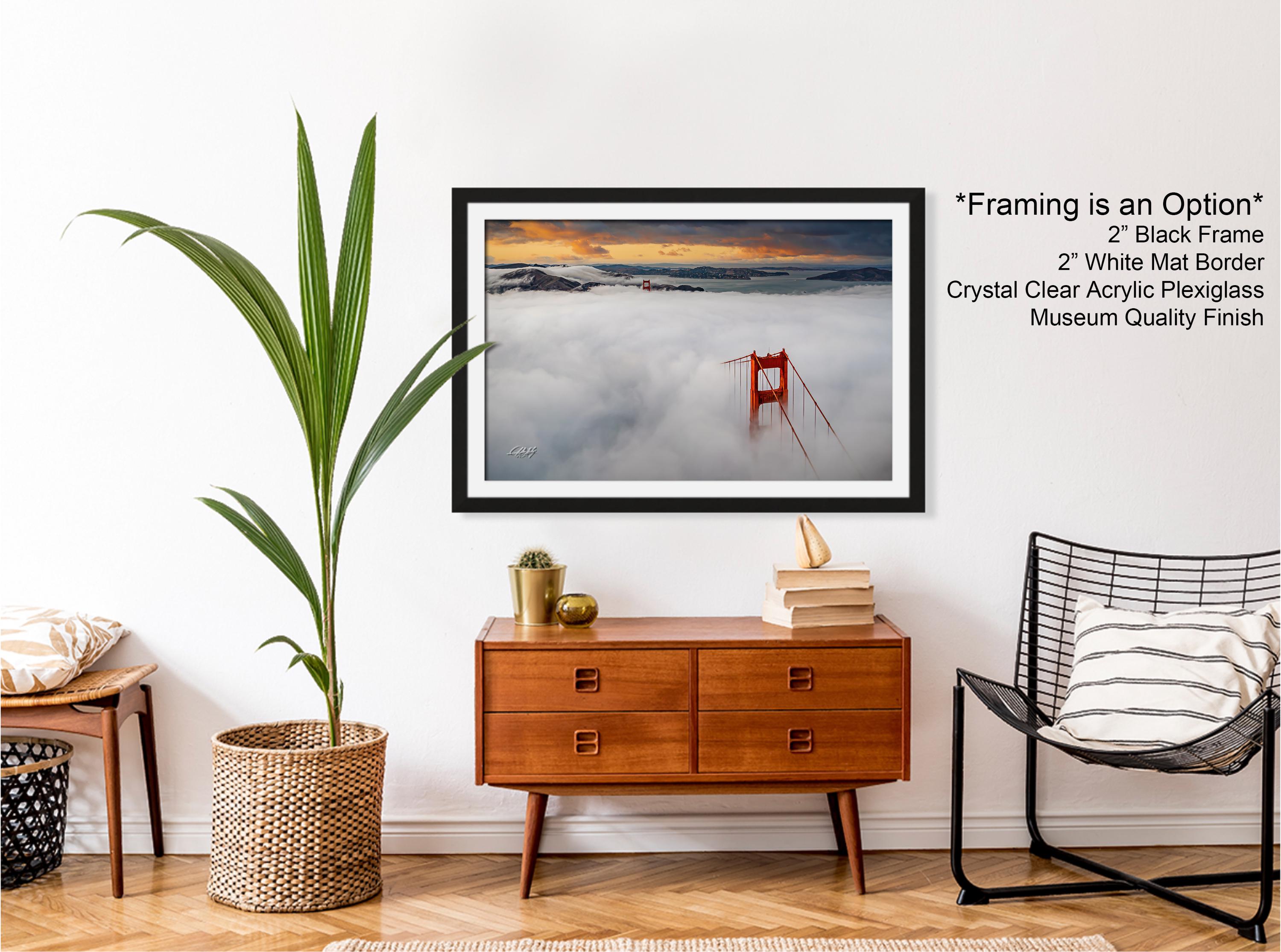 This vintage sign-style illustration showcases the iconic cityscape of San Francisco, featuring the majestic Golden Gate Bridge enveloped in fog. Each California poster is made-to-order with care, ensuring a unique and personal touch for your home or office.
