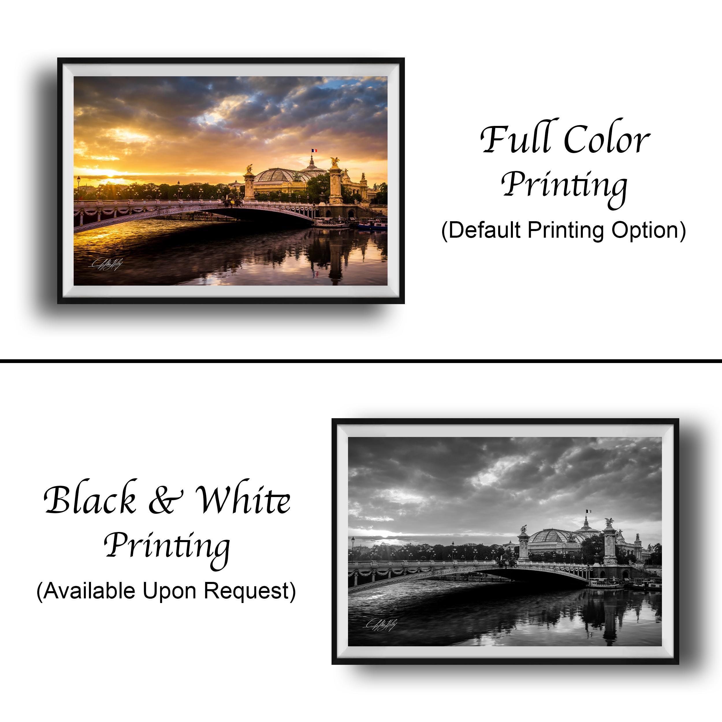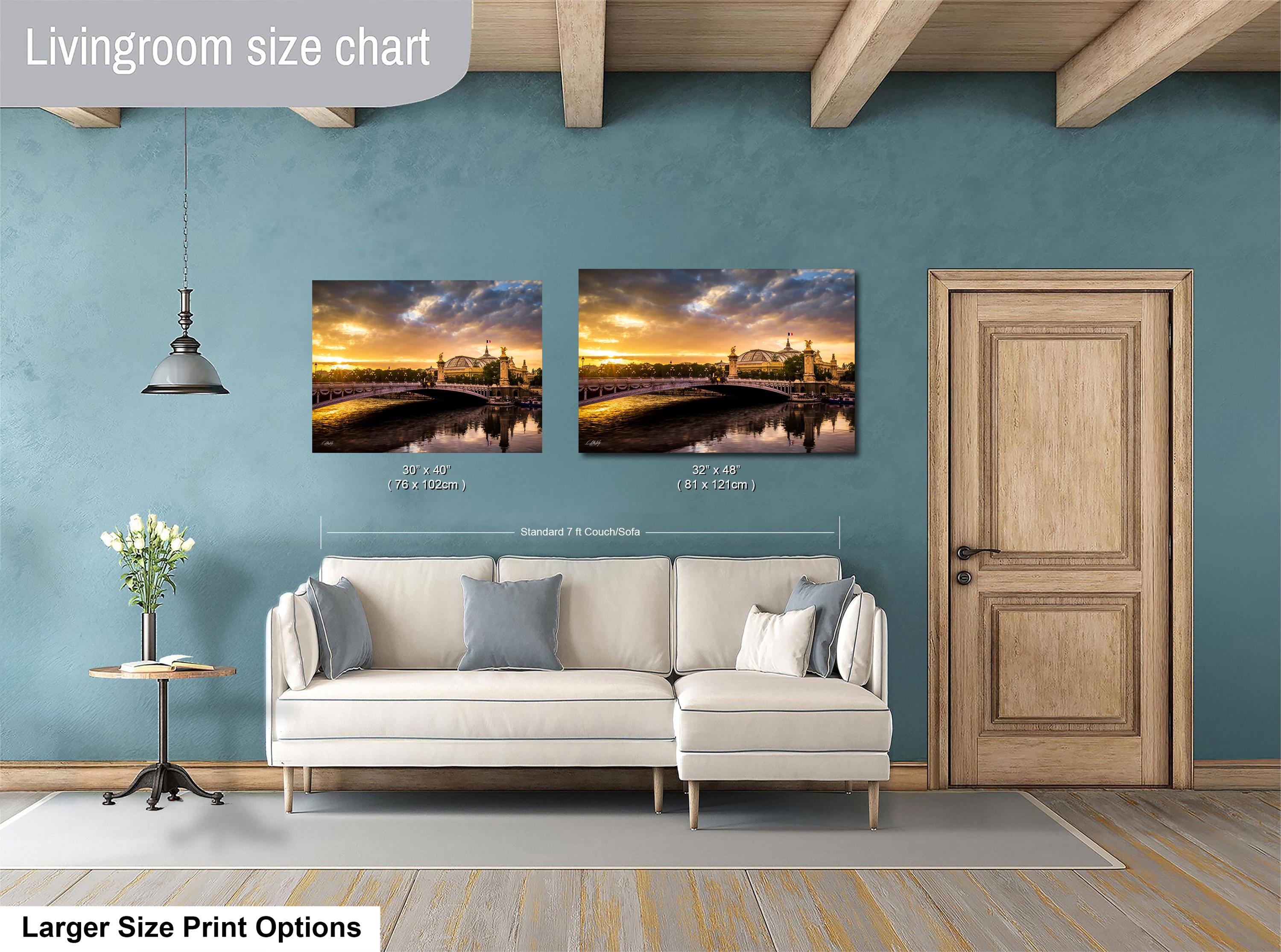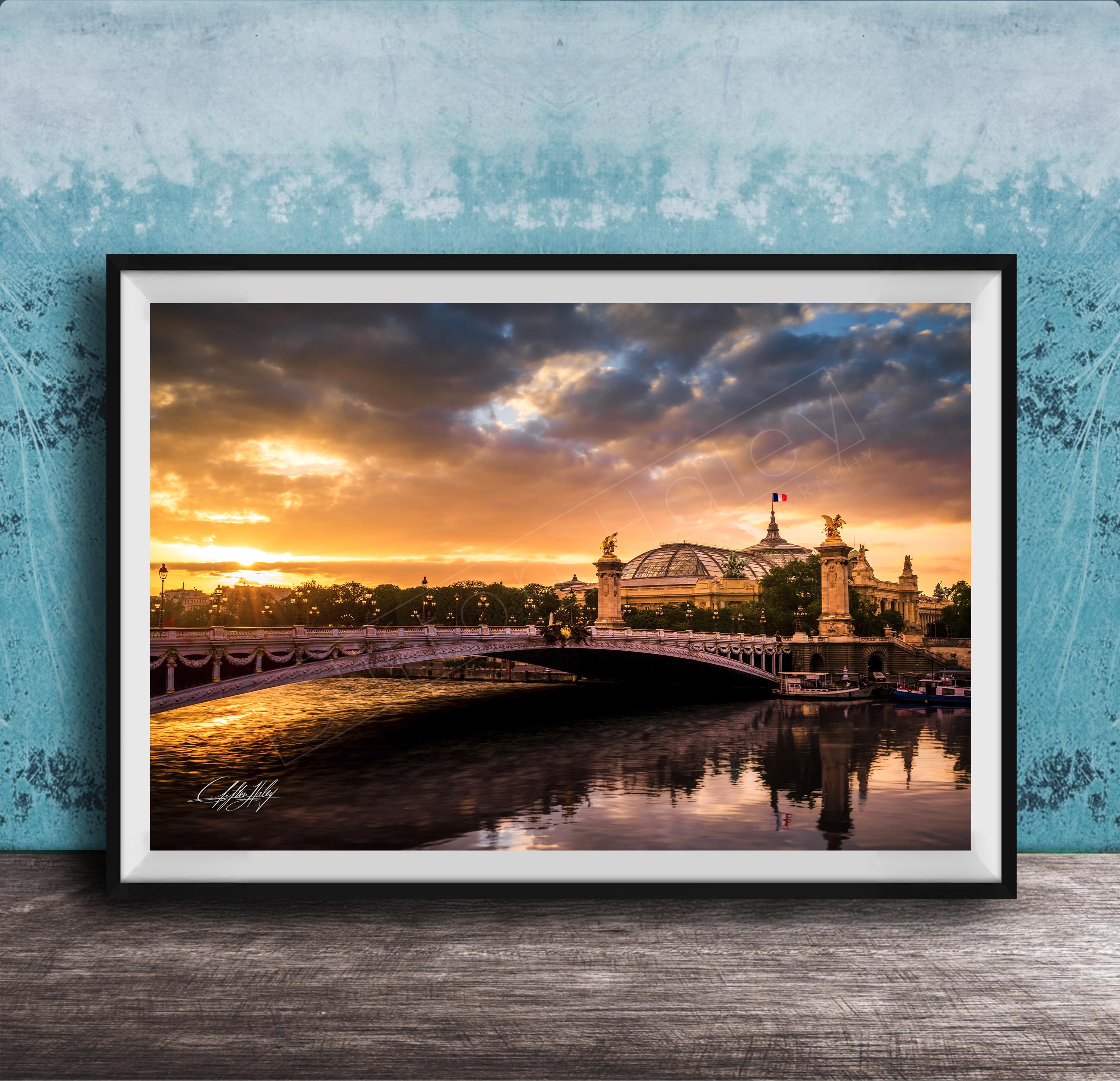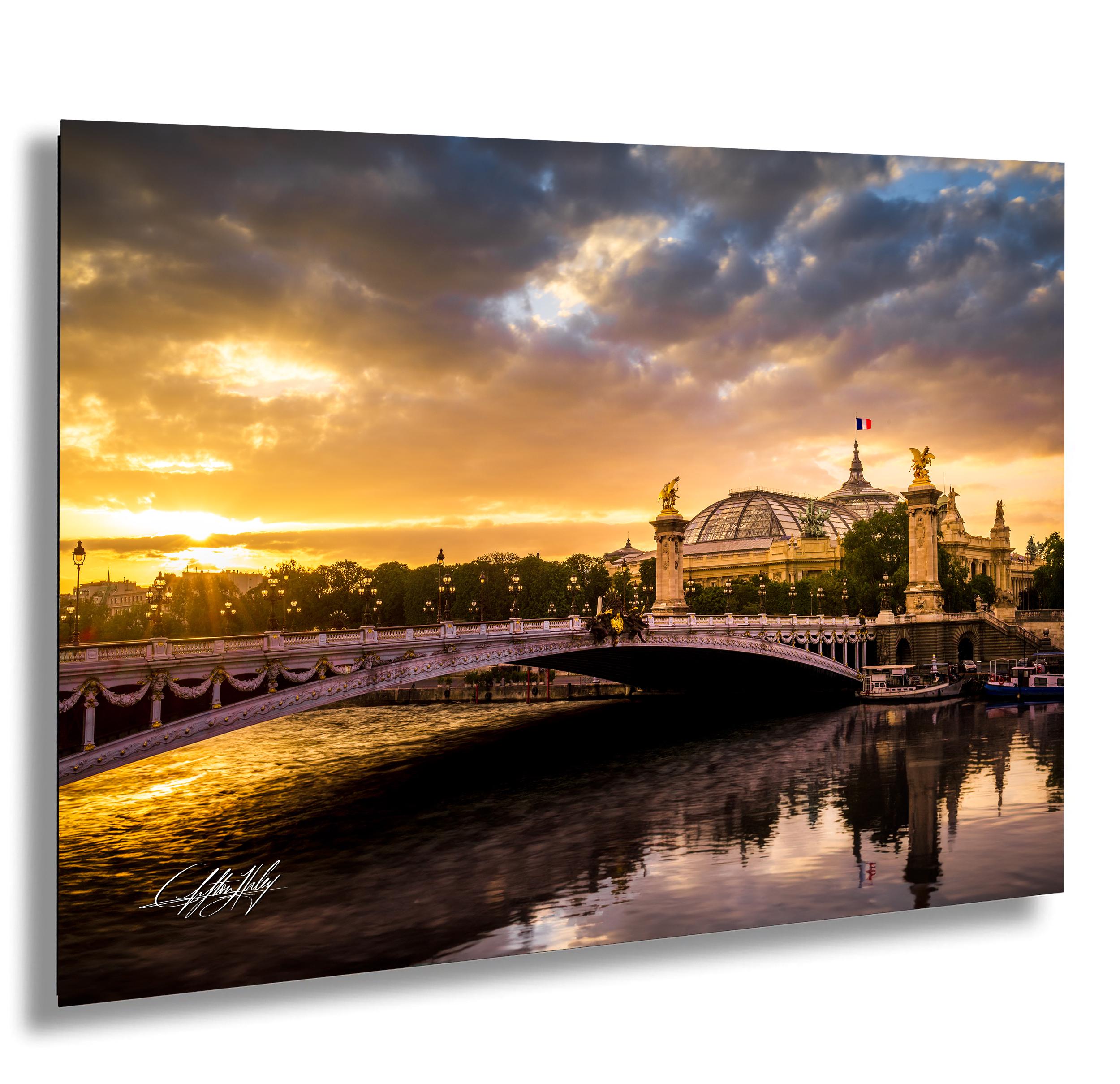 • Made-to-order fine art photograph featuring the iconic Alexander 3rd Bridge bathed in warm golden hour sunset light. • Artist’s signature authenticates each piece, adding a personal and exclusive touch. • Available in multiple formats: framed paper prints, acrylics, aluminum/metal prints with a 2" white mat border, or canvas prints flush mounted without a mat border. • Dimensions and customization options available upon request to perfectly suit your space. • Please note: due to the custom nature of this artwork, returns are not accepted; however, we gladly offer exchanges or replacements if your piece arrives damaged or with any issues.
