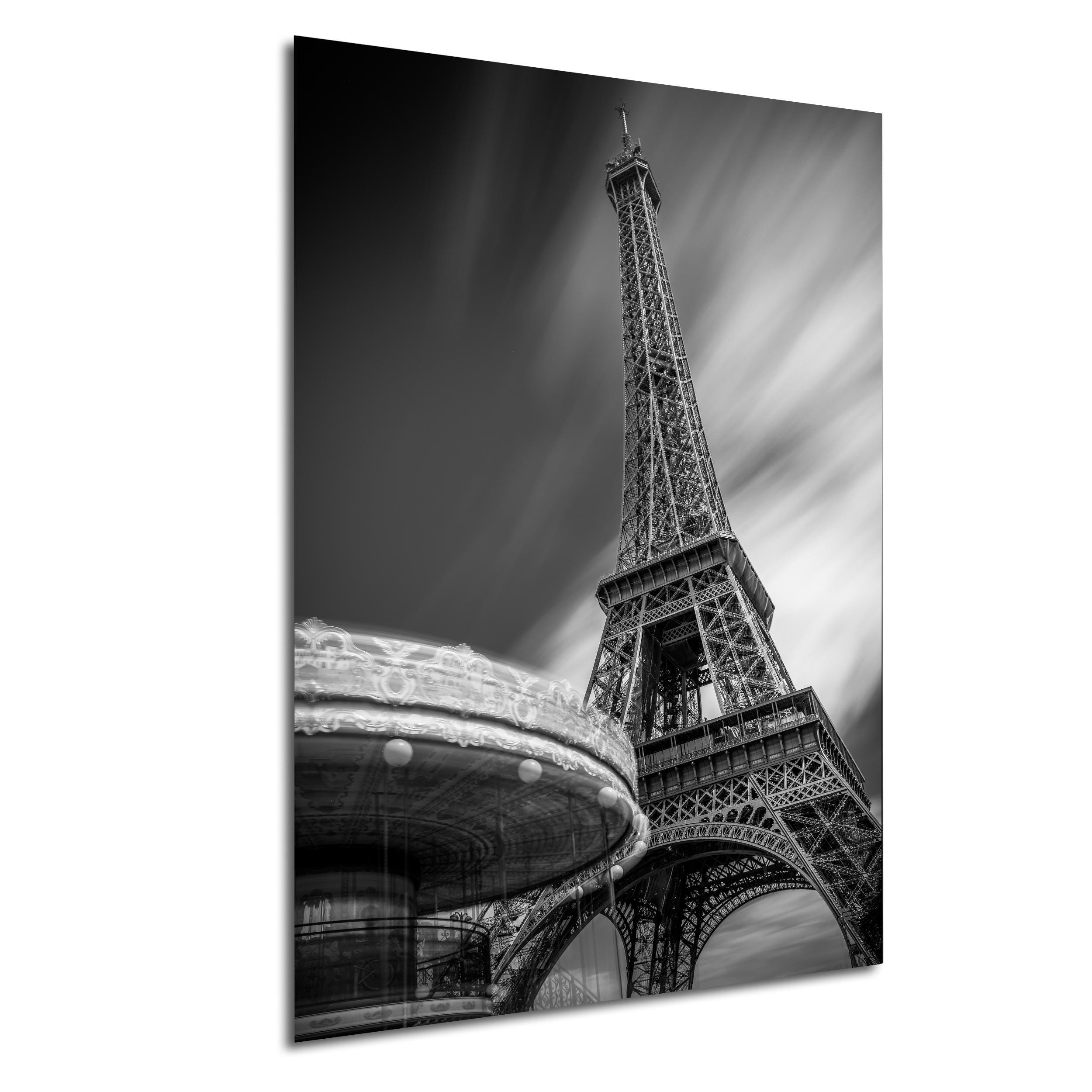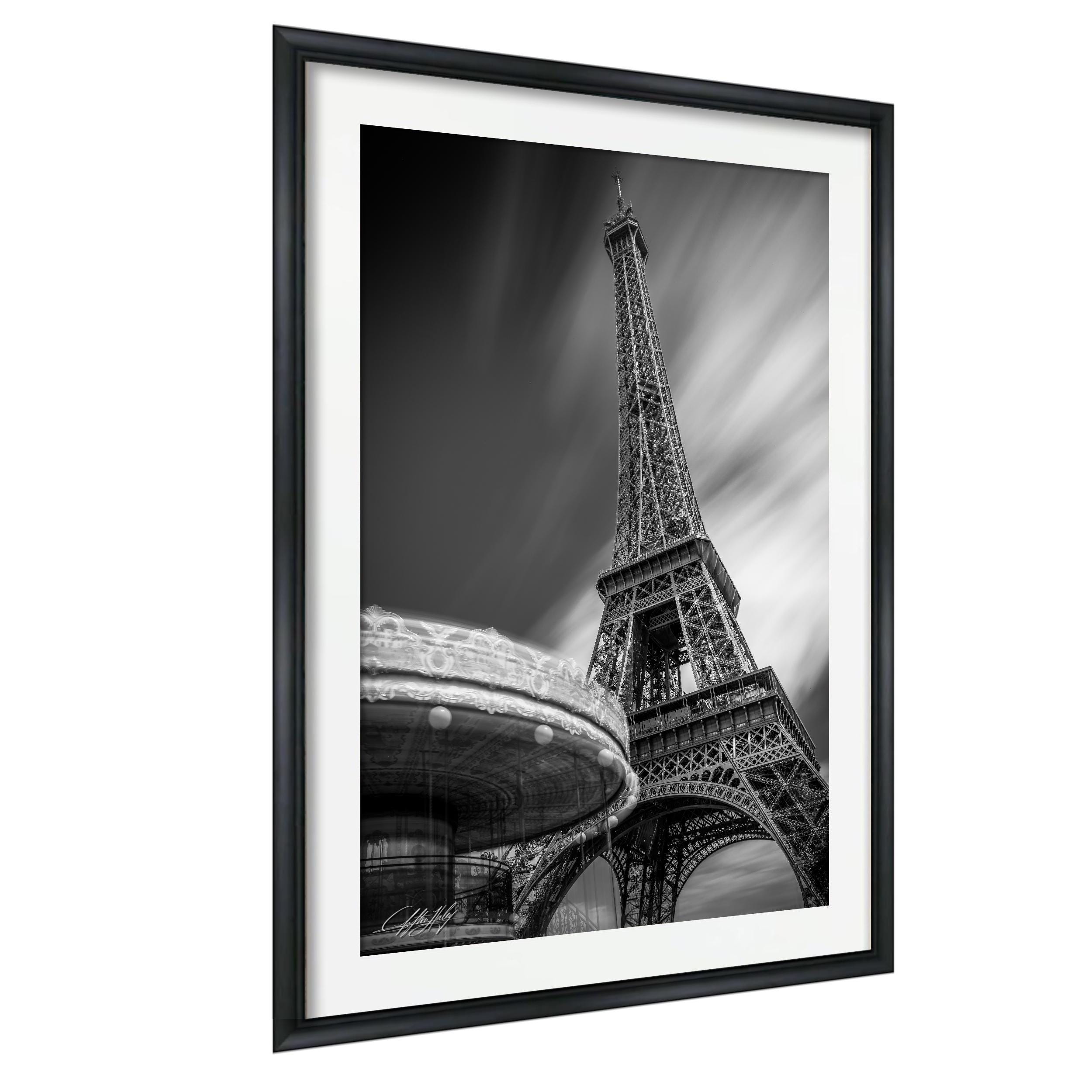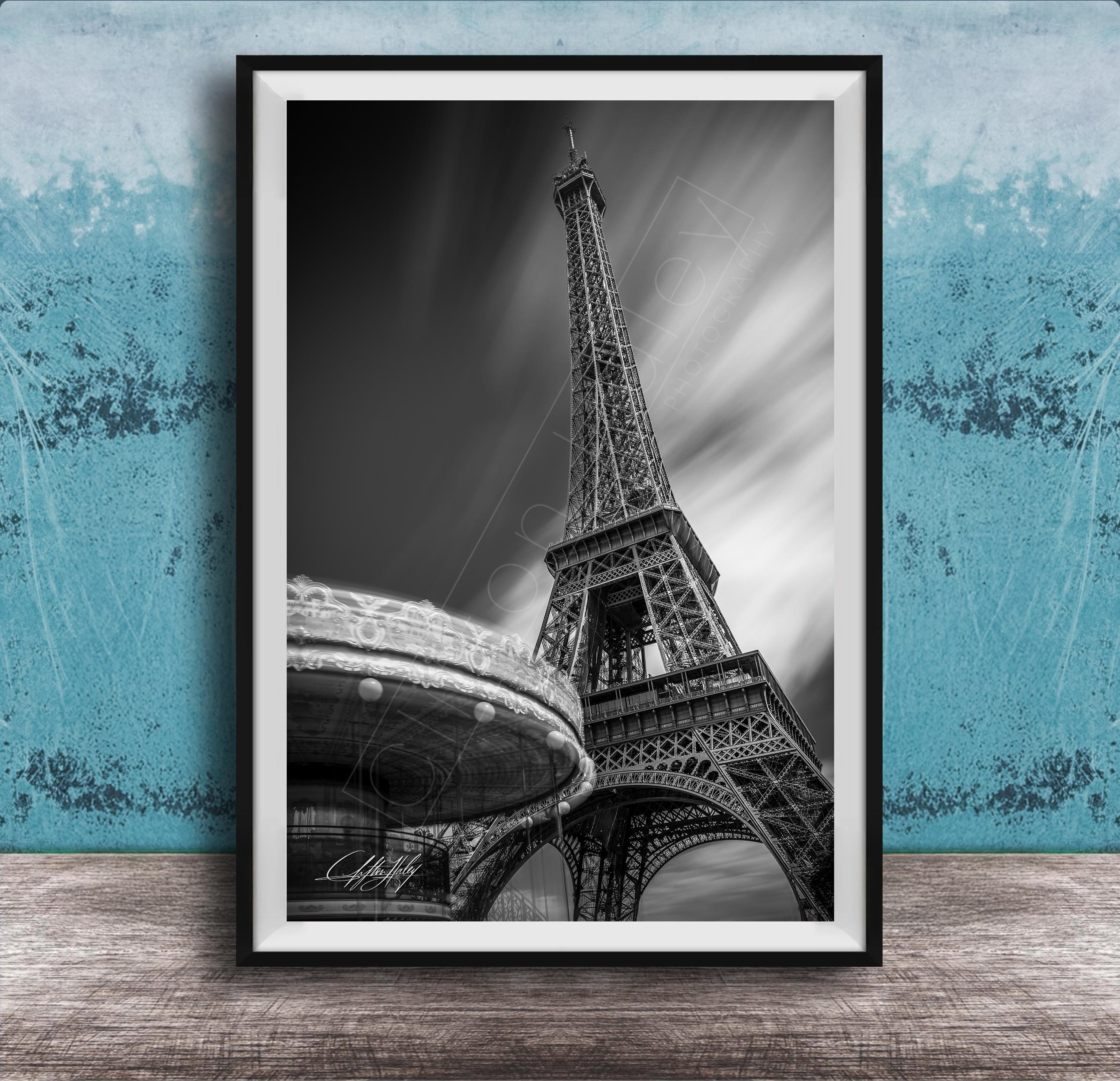 Experience the magic of Paris with this Eiffel Tower carousel long-exposure print, a stunning black and white travel poster perfect for bedroom wall decor or a thoughtful Paris gift.