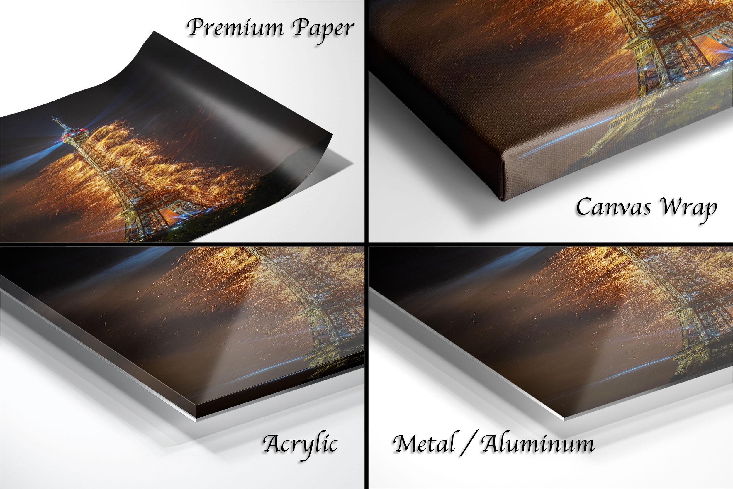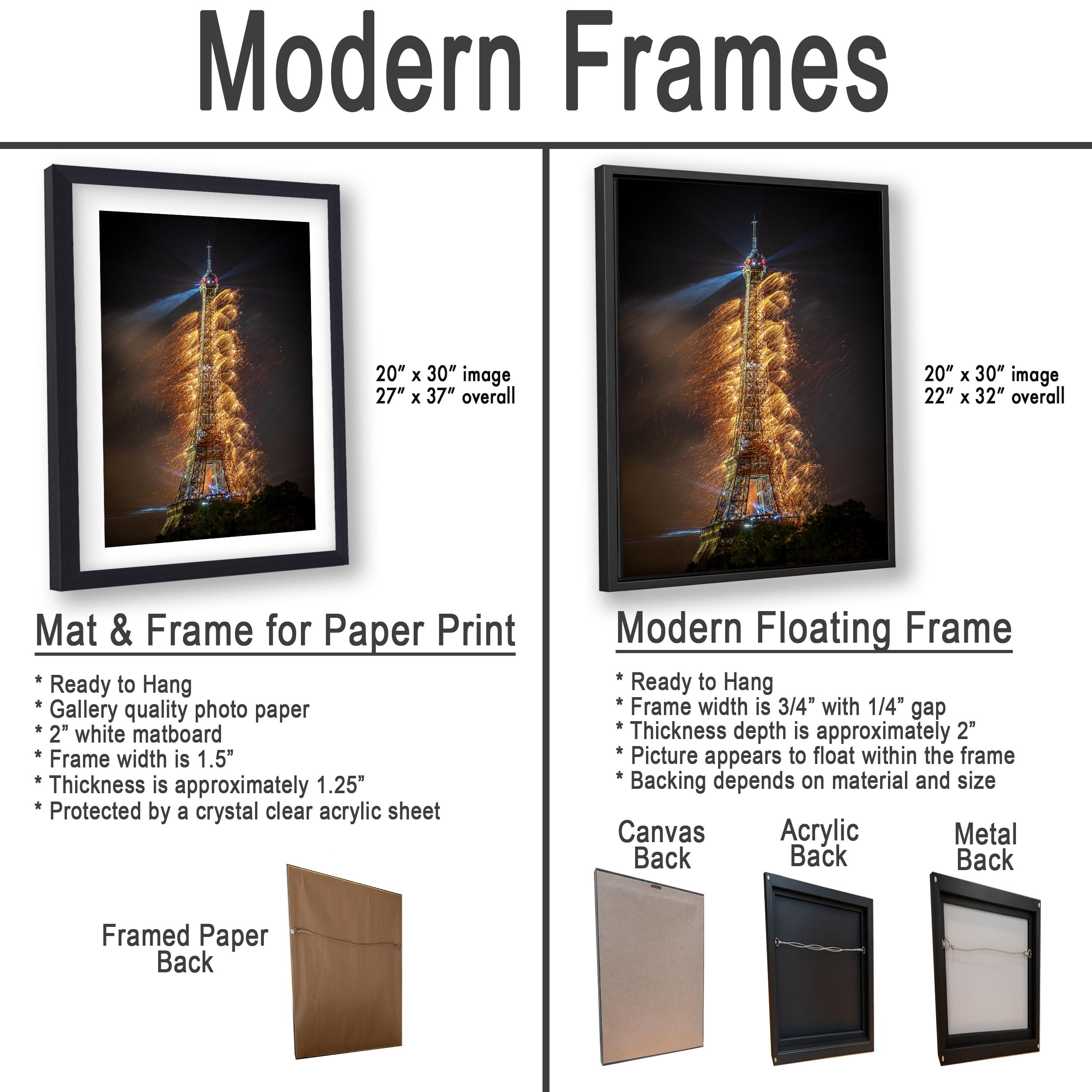1. Framed paper prints, acrylics, and aluminum/metal prints include a 2" white mat border for a refined finish. 2. Canvas prints are flush mounted without a mat border for a sleek look. 3. We do not offer returns since each item is custom made; however, damaged or problematic items will be replaced or exchanged promptly.