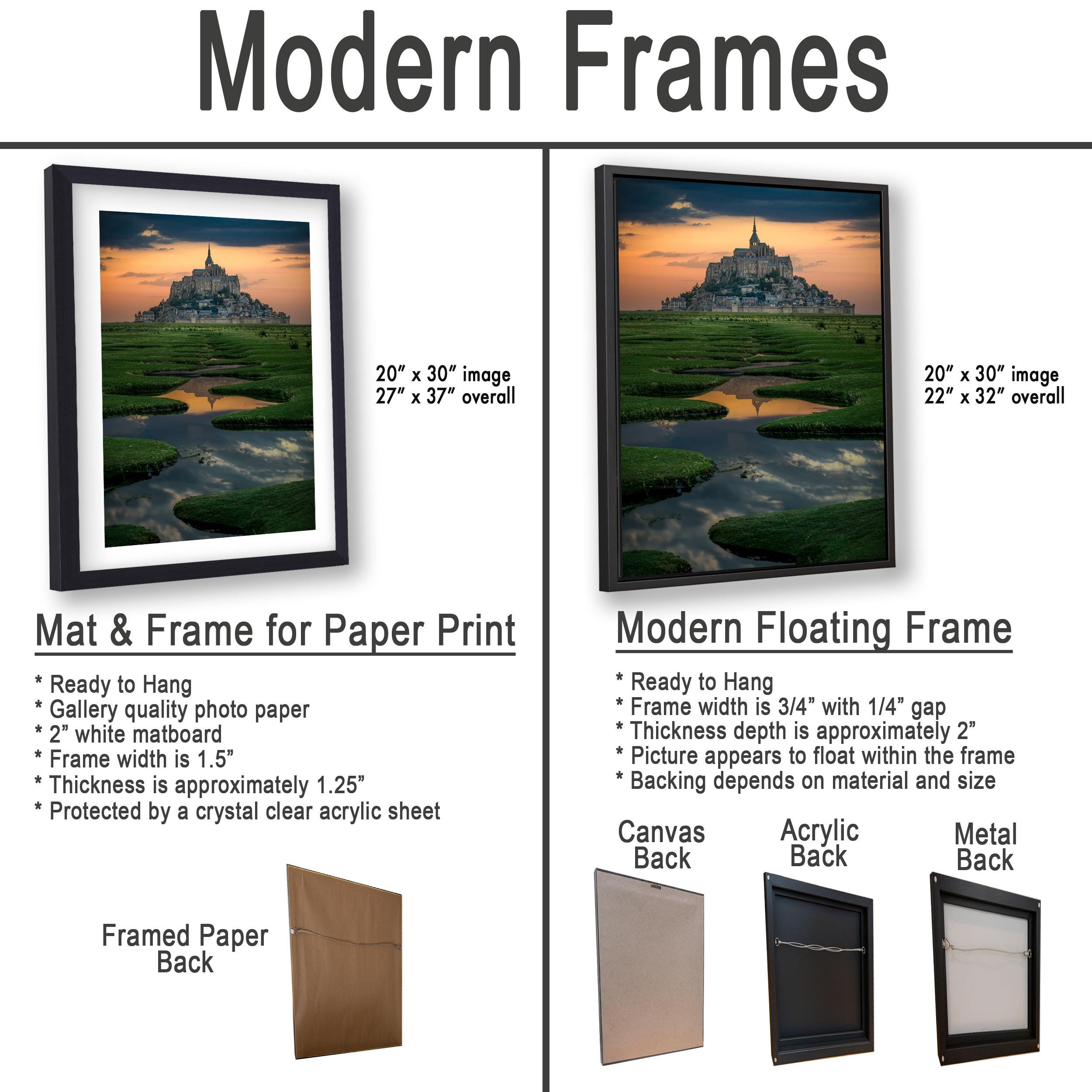 3.1) Only framed paper prints, acrylics and aluminum/metal prints will have a 2" white mat border. 3.2) Canvas prints will be a flush mounted (no mat border) to the frame.